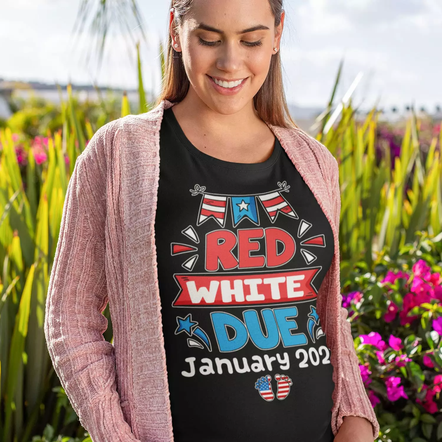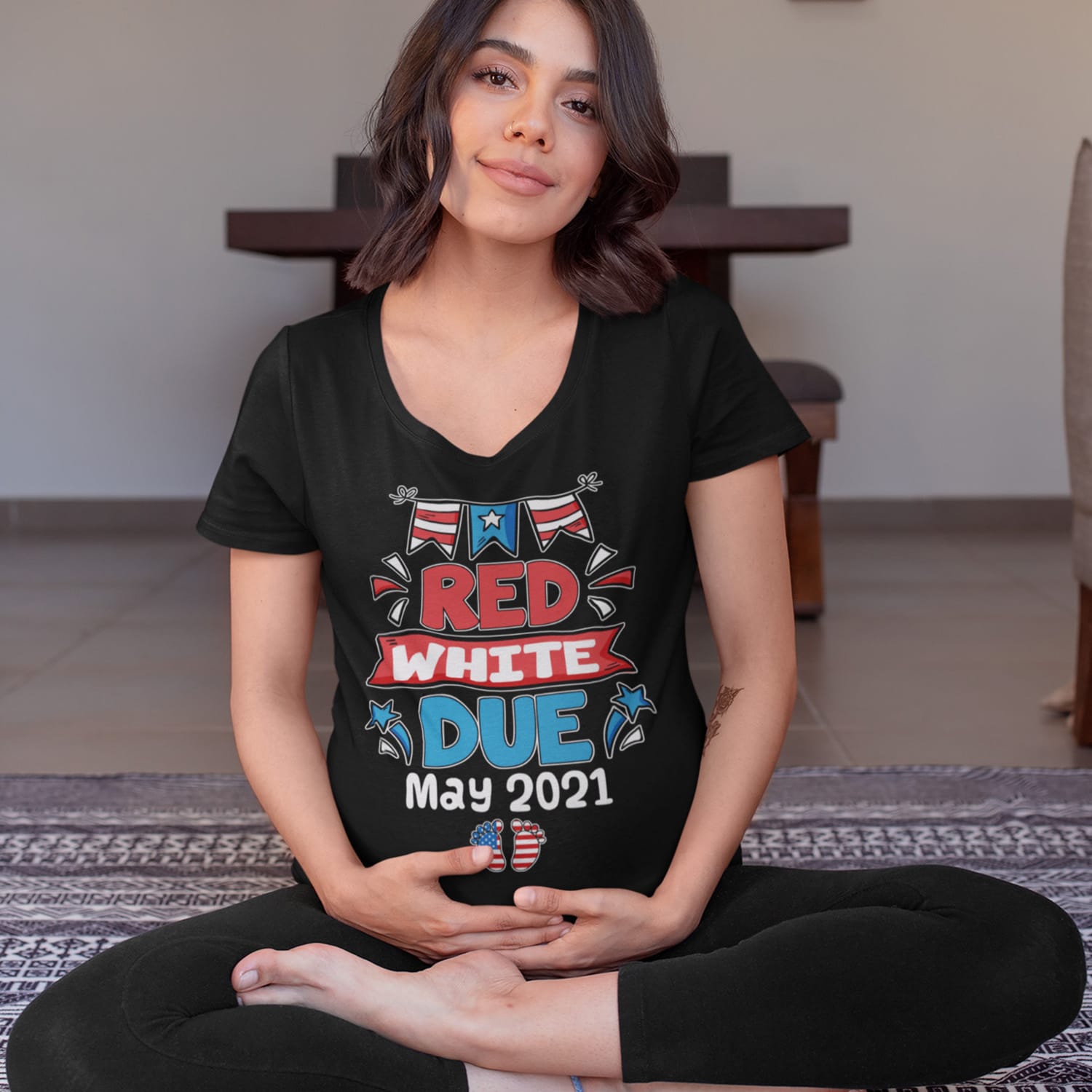 Personalized Red White And Due Pregnancy Announcement 4th Of July T-Shirt – V-Neck – 4th Of July Pregnancy Shirt