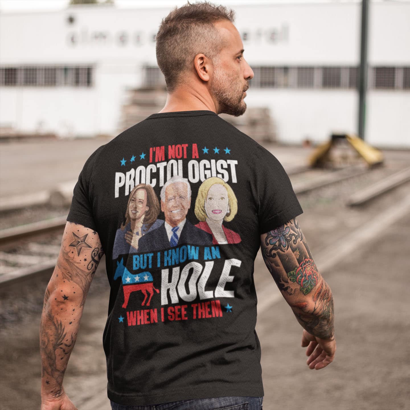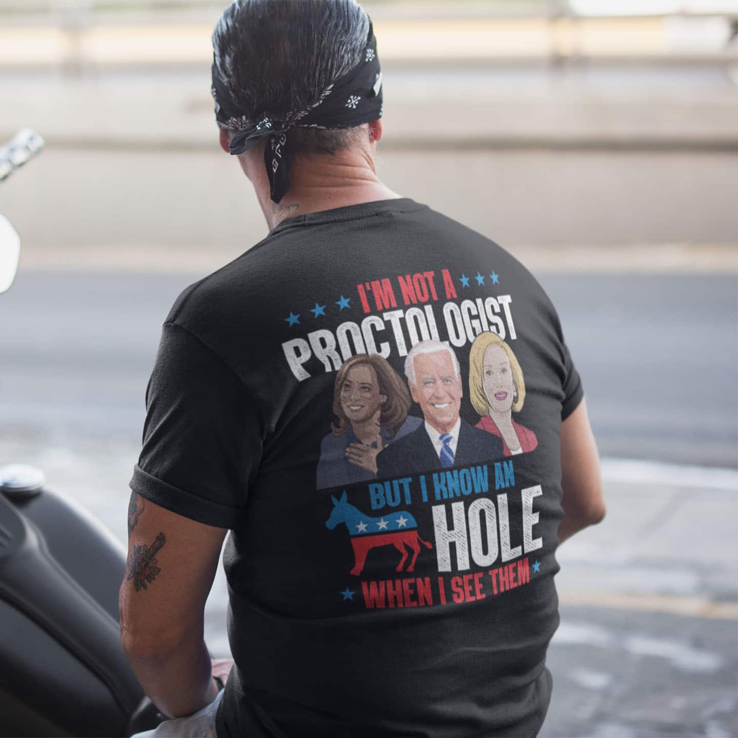 Let’s Shop I’m Not A Proctologist But I Know An Asshole When I See Them Funny Biden Kamala Pelosi Print On Back T-Shirt!