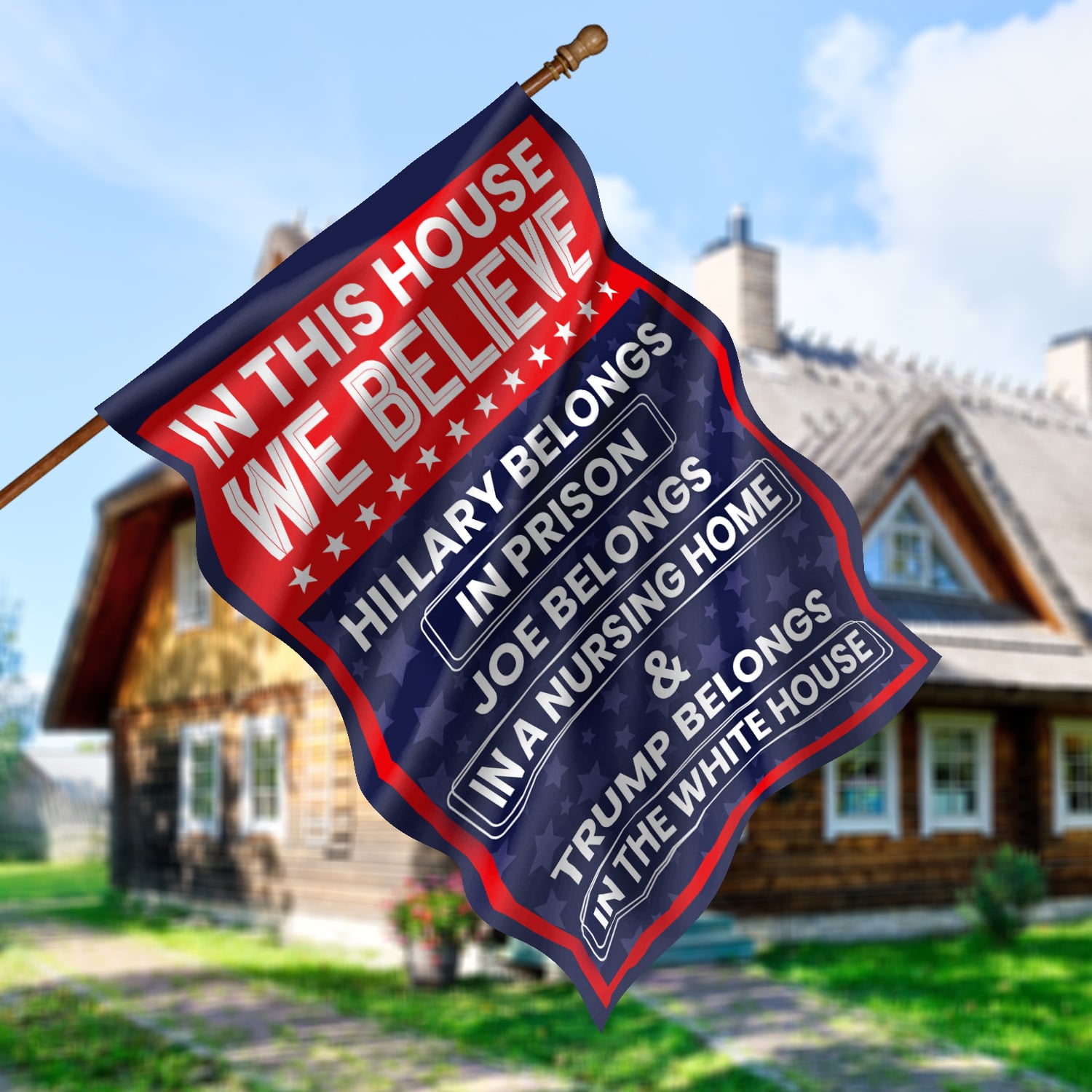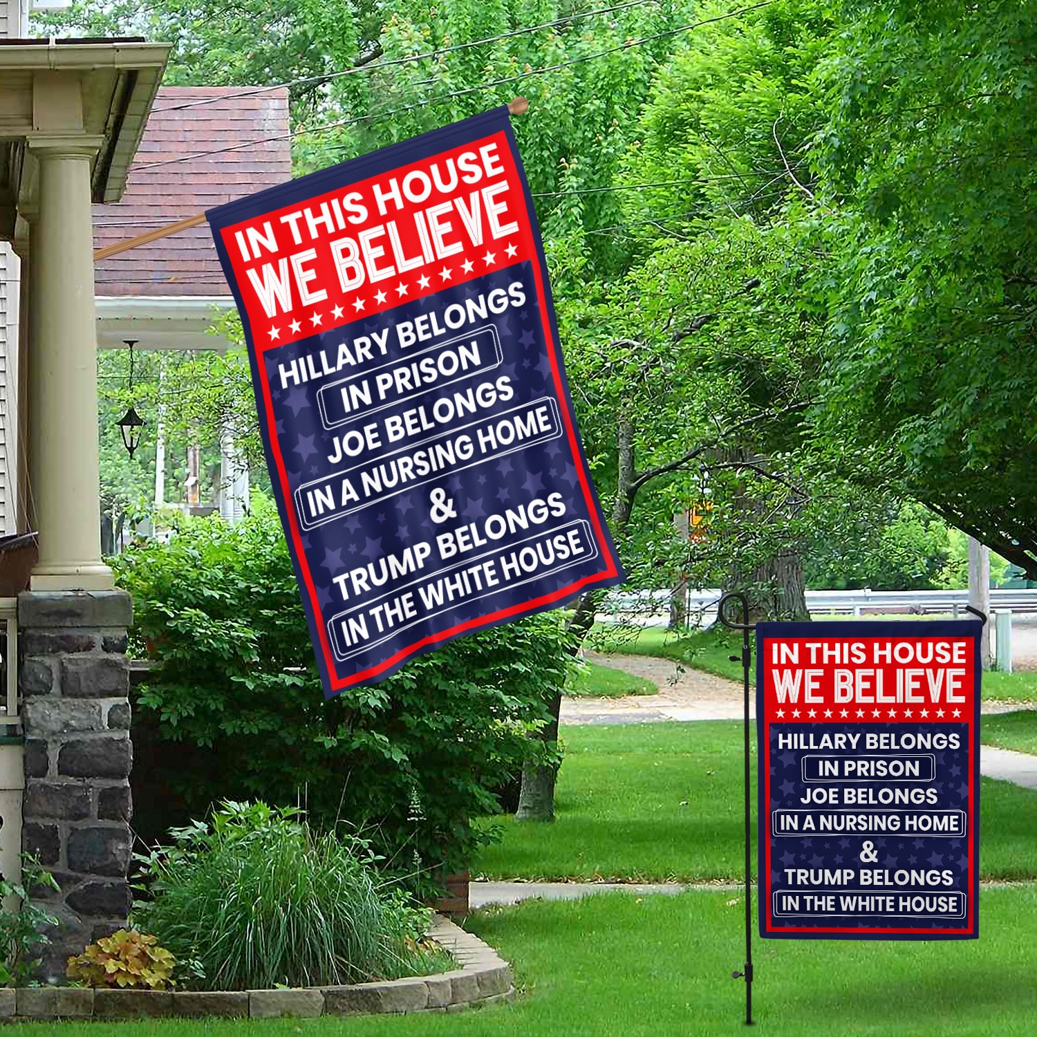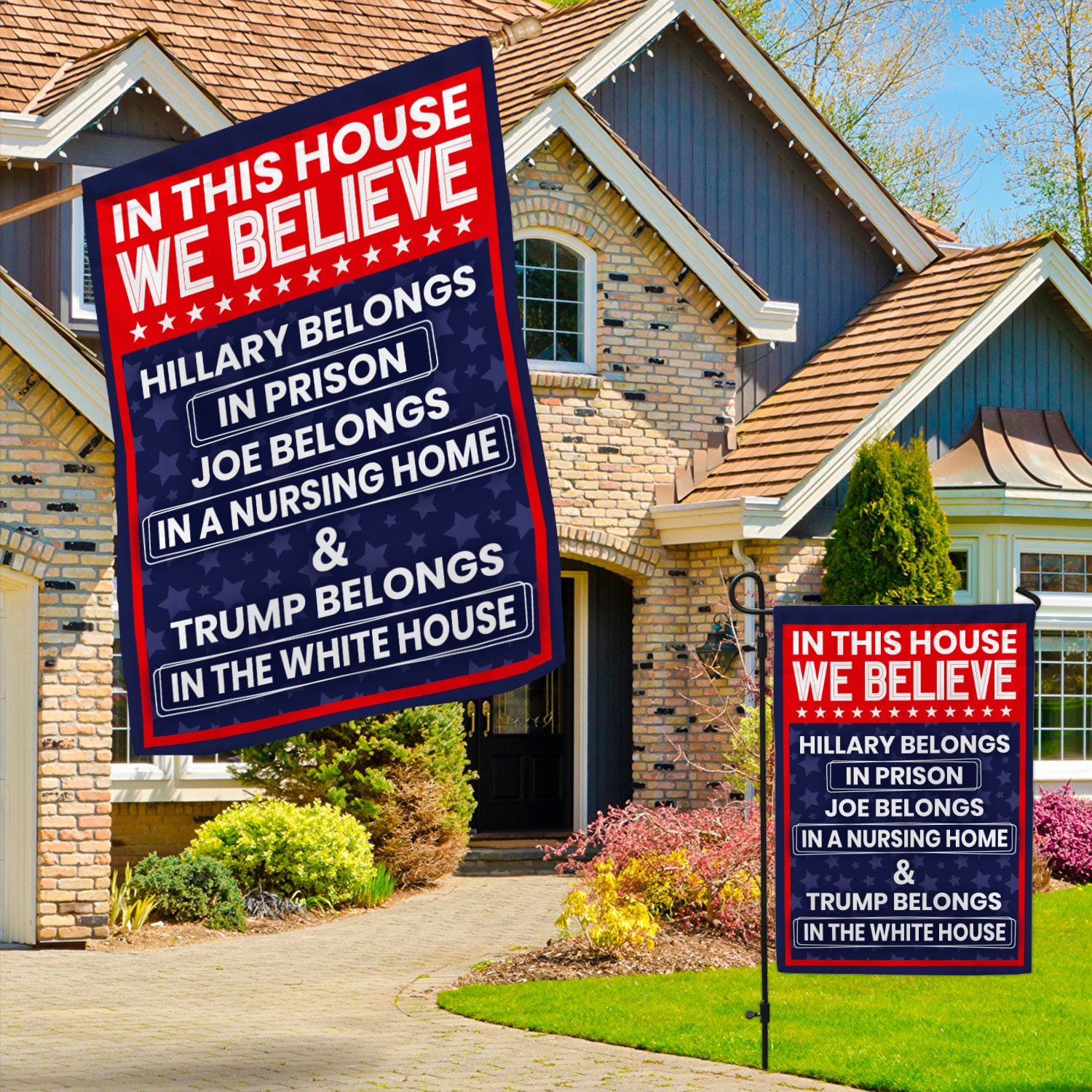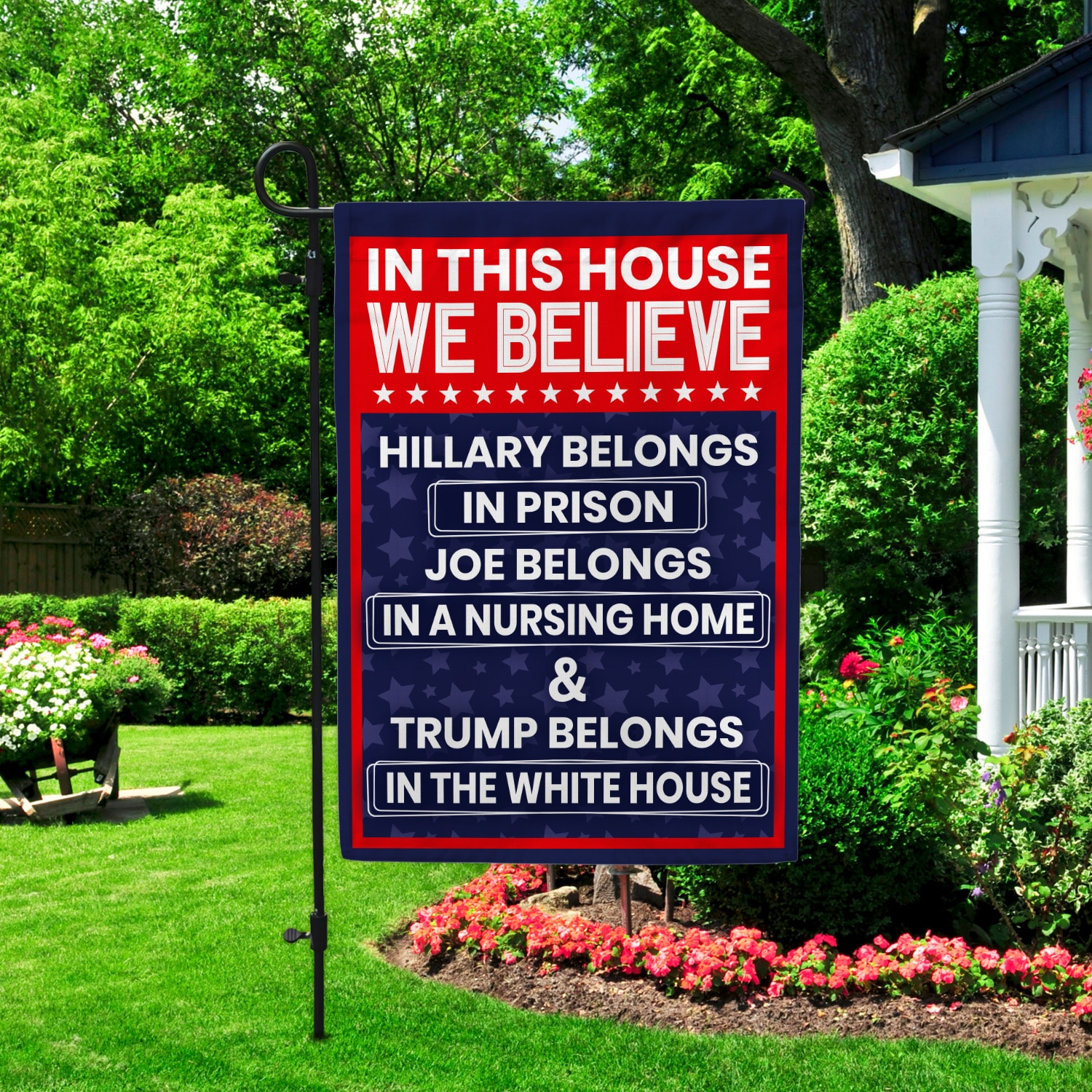 Let’s Shop In This House We Believe Hillary Belongs in Prison Joe Belongs in Nursing Home House Flag – Garden Flag!