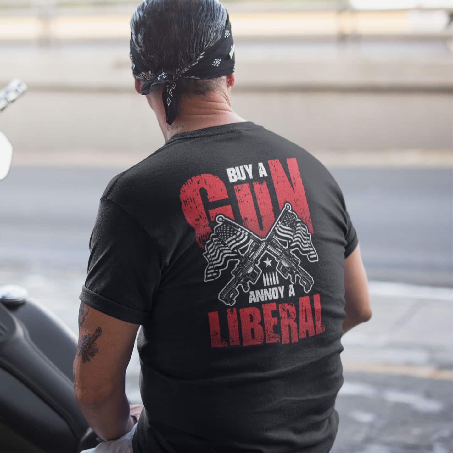 Let’s Shop Buy A Gun Annoy A Liberal Print On Back T-Shirt Only – Anti Liberal Plain Front Shirt!