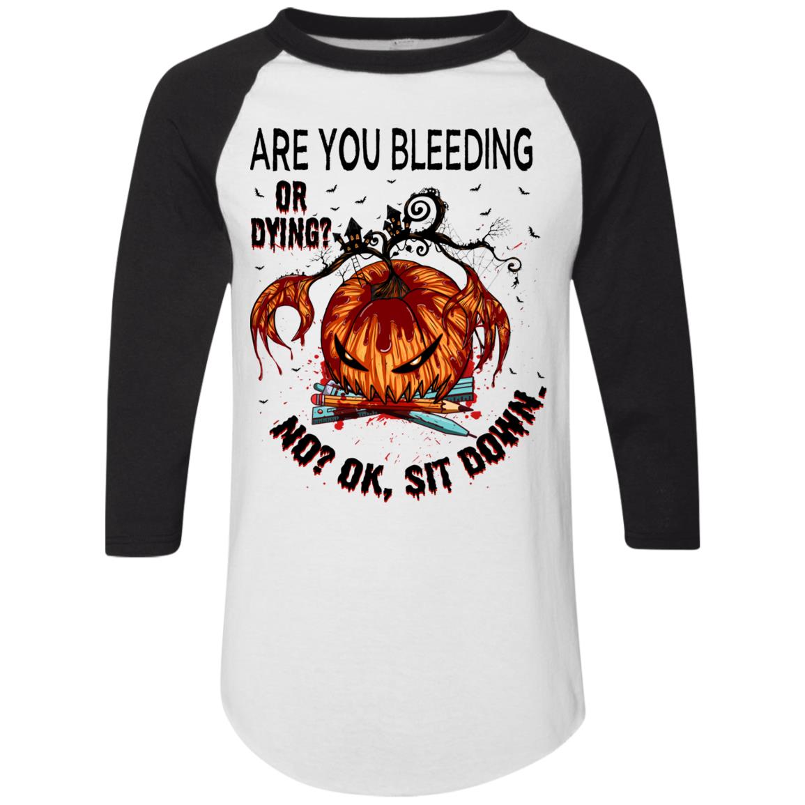 Are You Bleeding Or Dying NO OK Sit Down Funny Halloween Teacher 3/4 Raglan Jersey Shirt – Baseball Tee