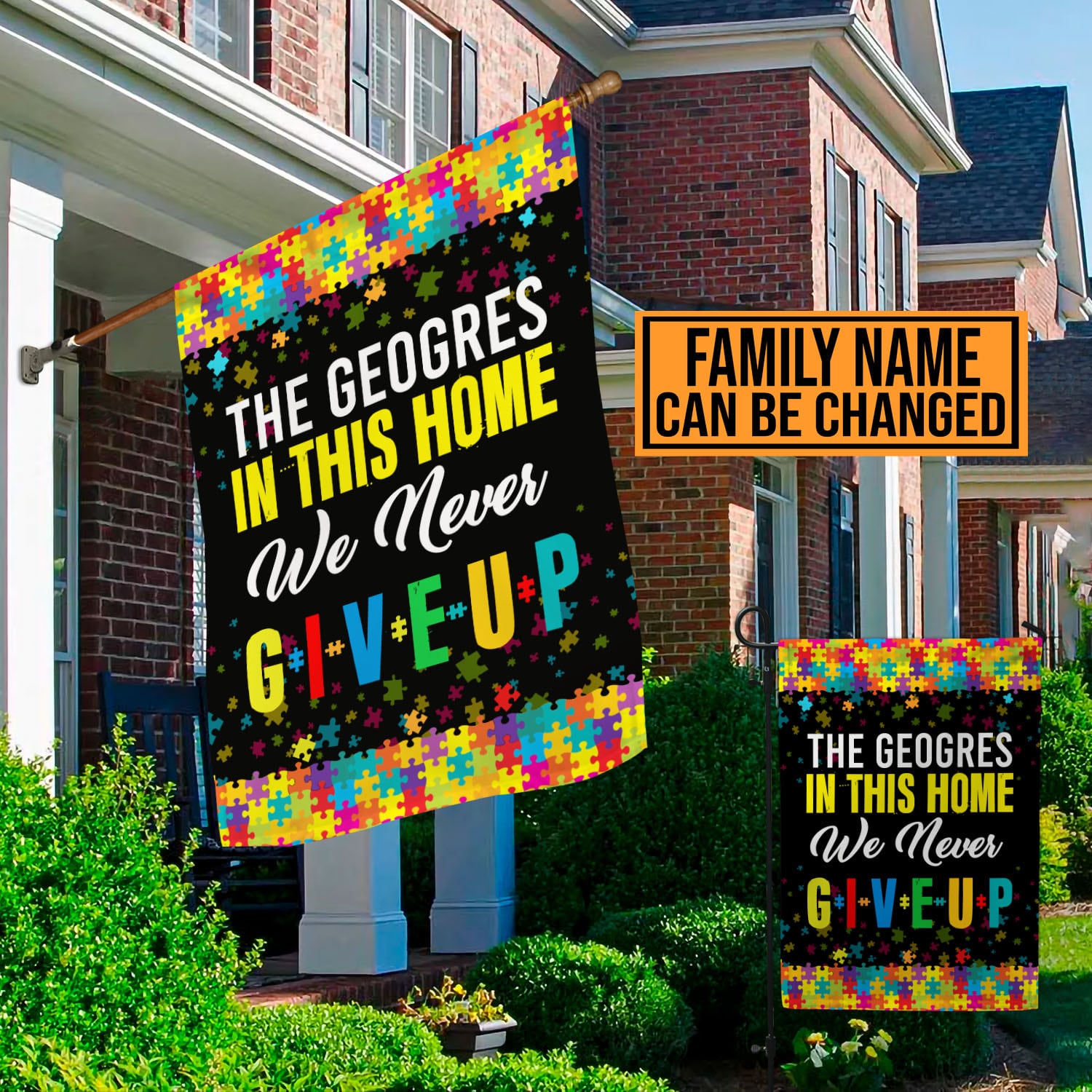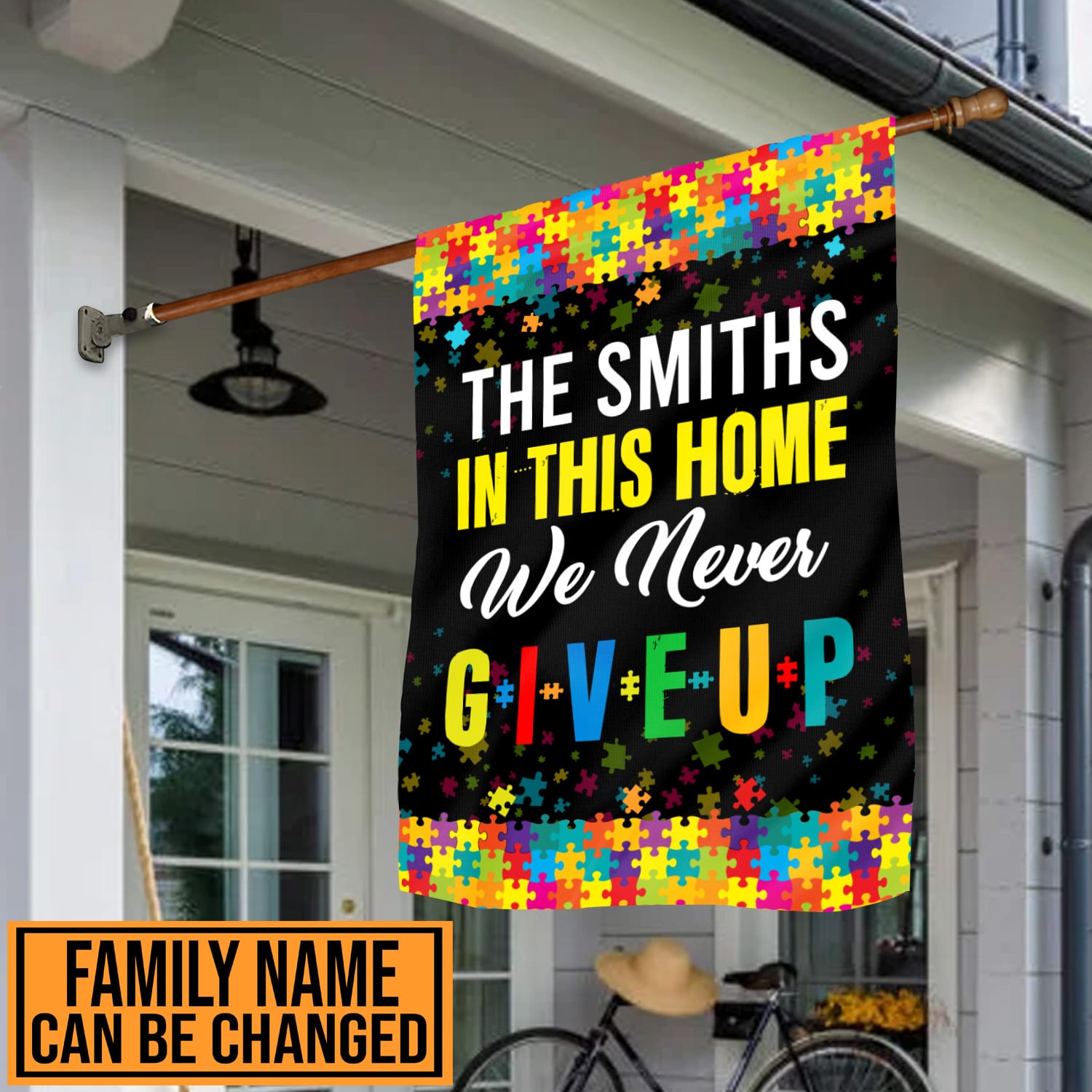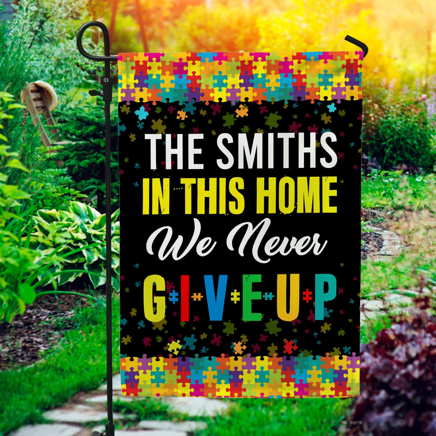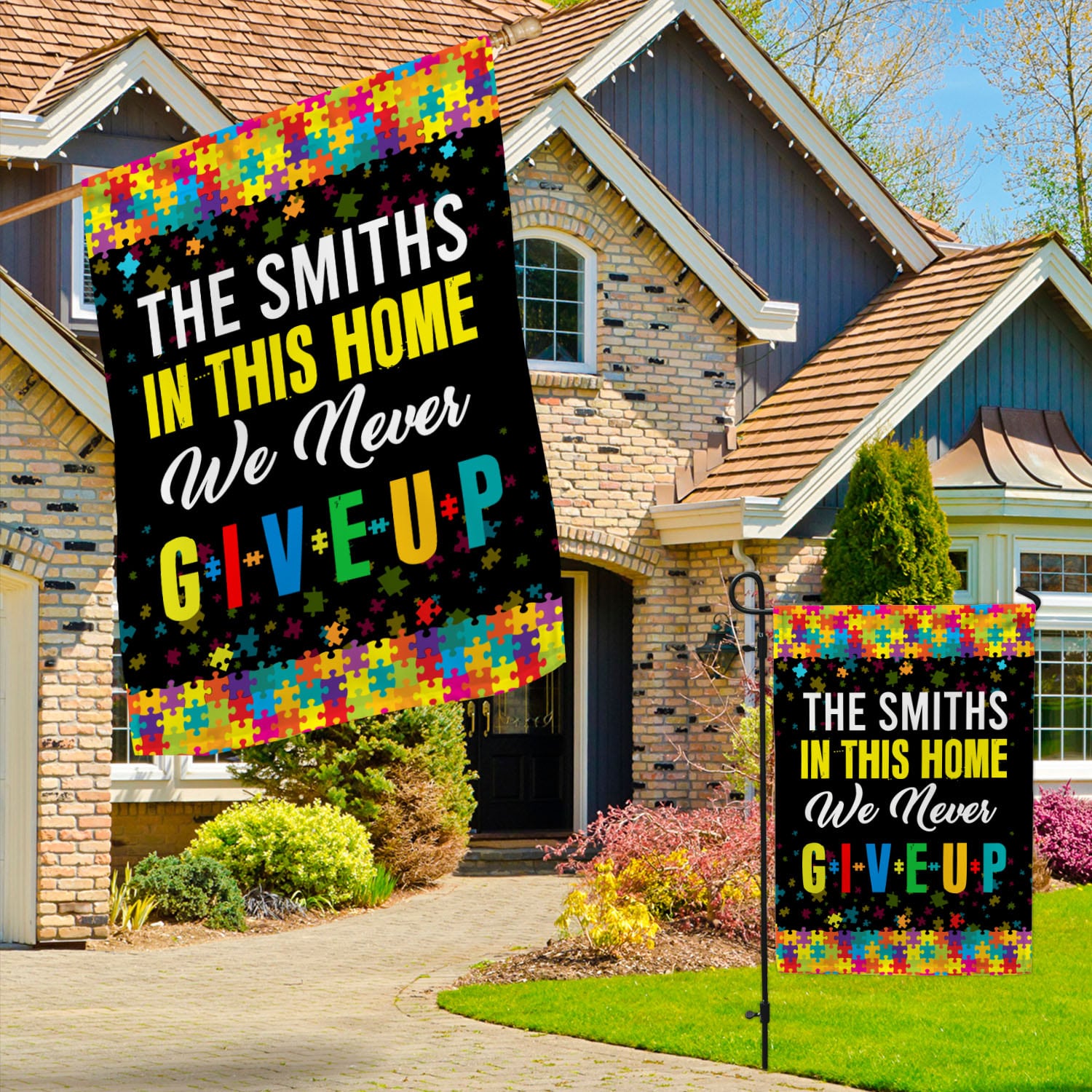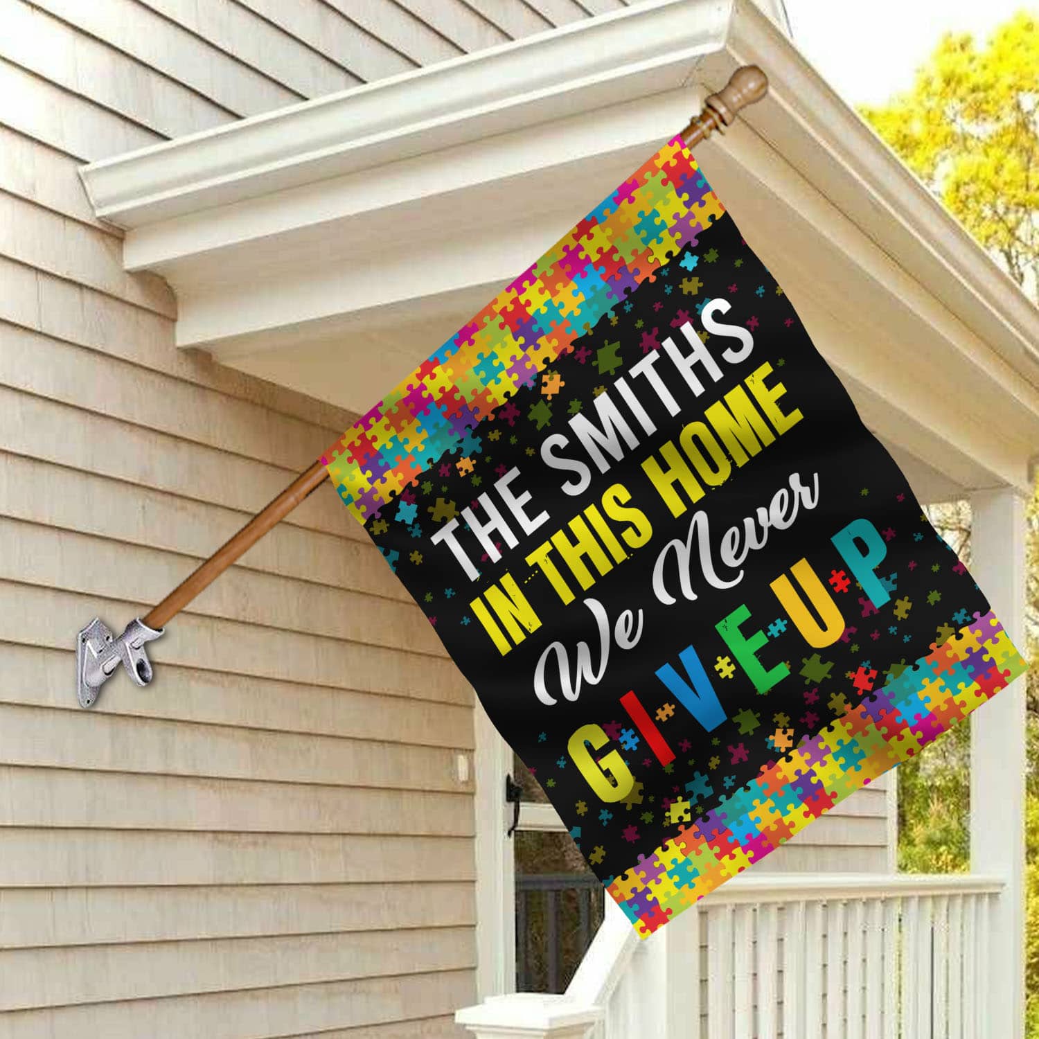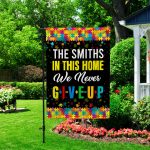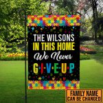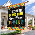 Let’s Shop Personalized Family Name In This Home We Never Give Up Autism Awareness Outdoor House Flag – Home Garden Flag!