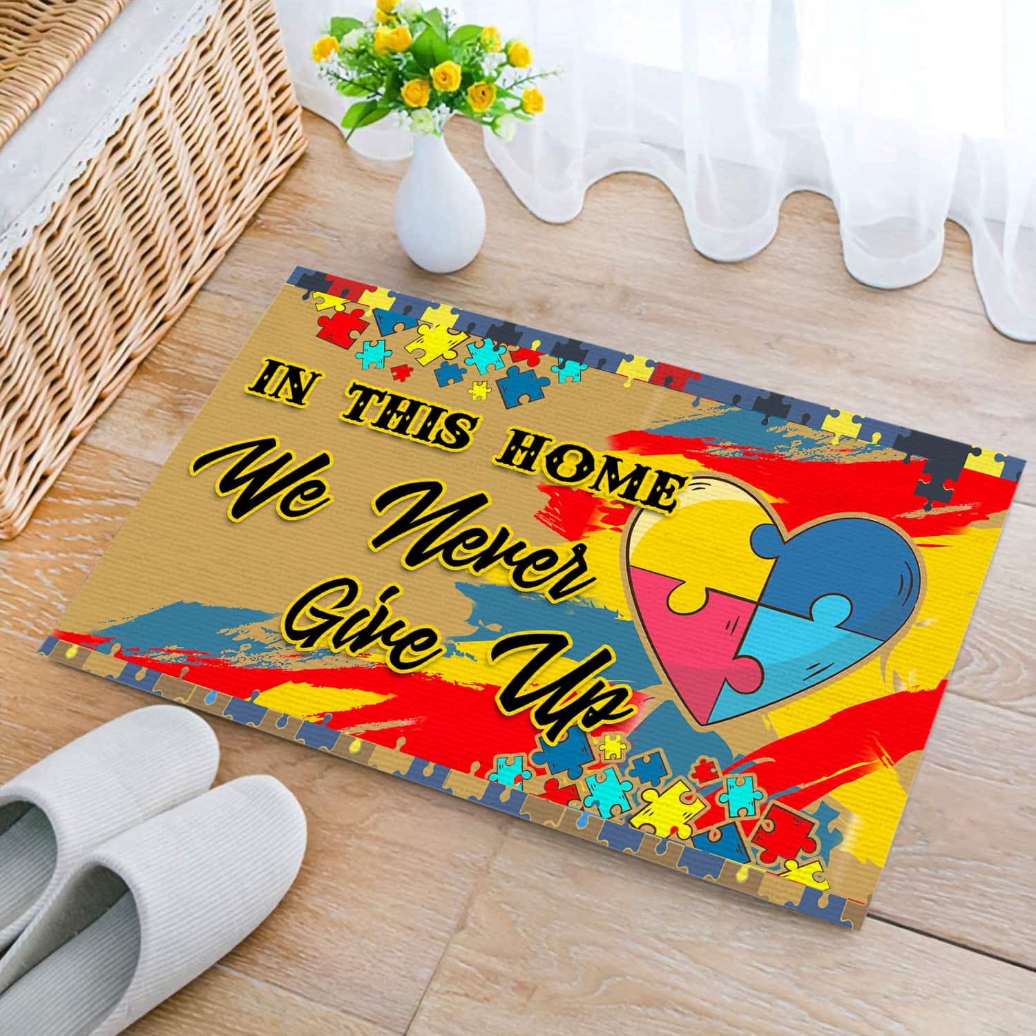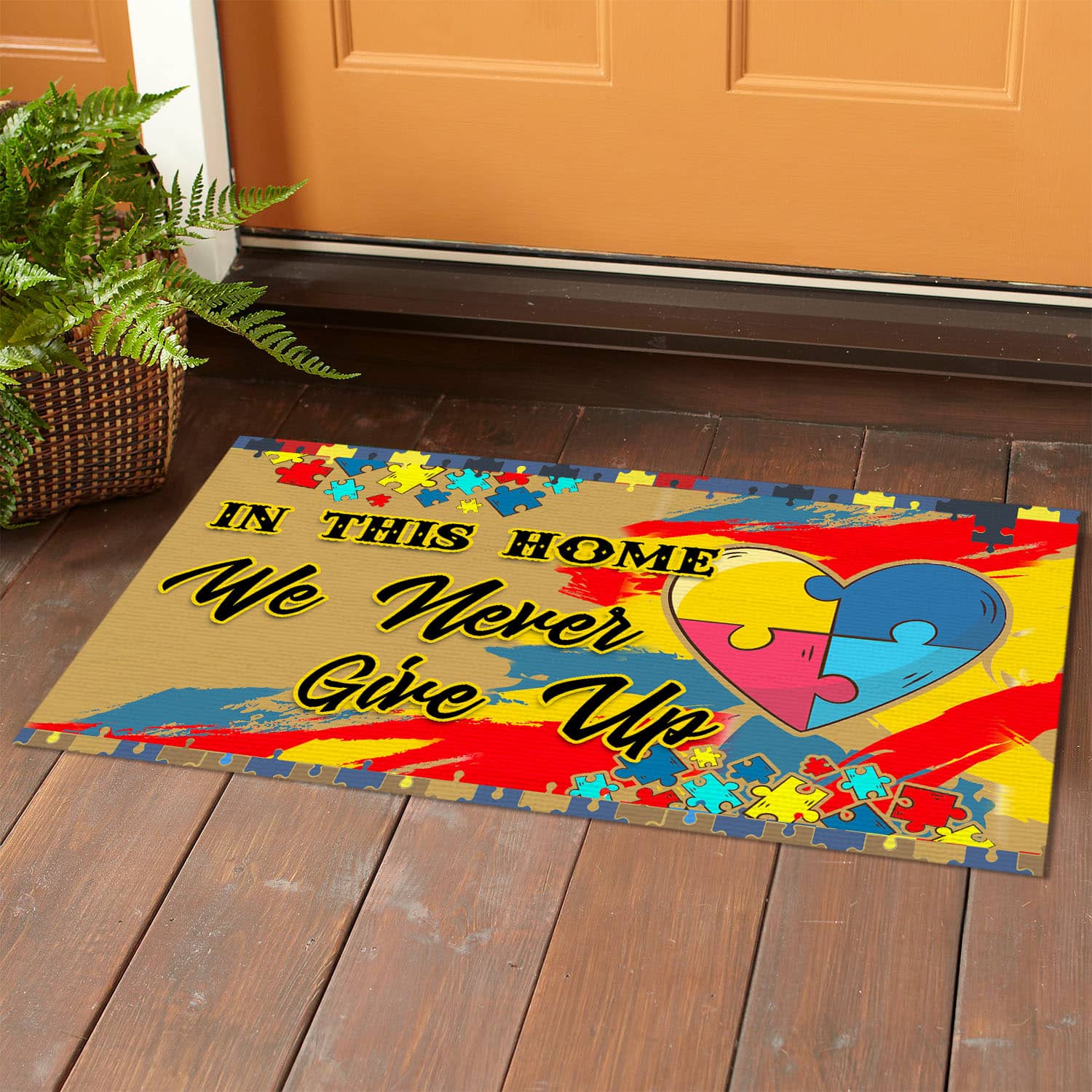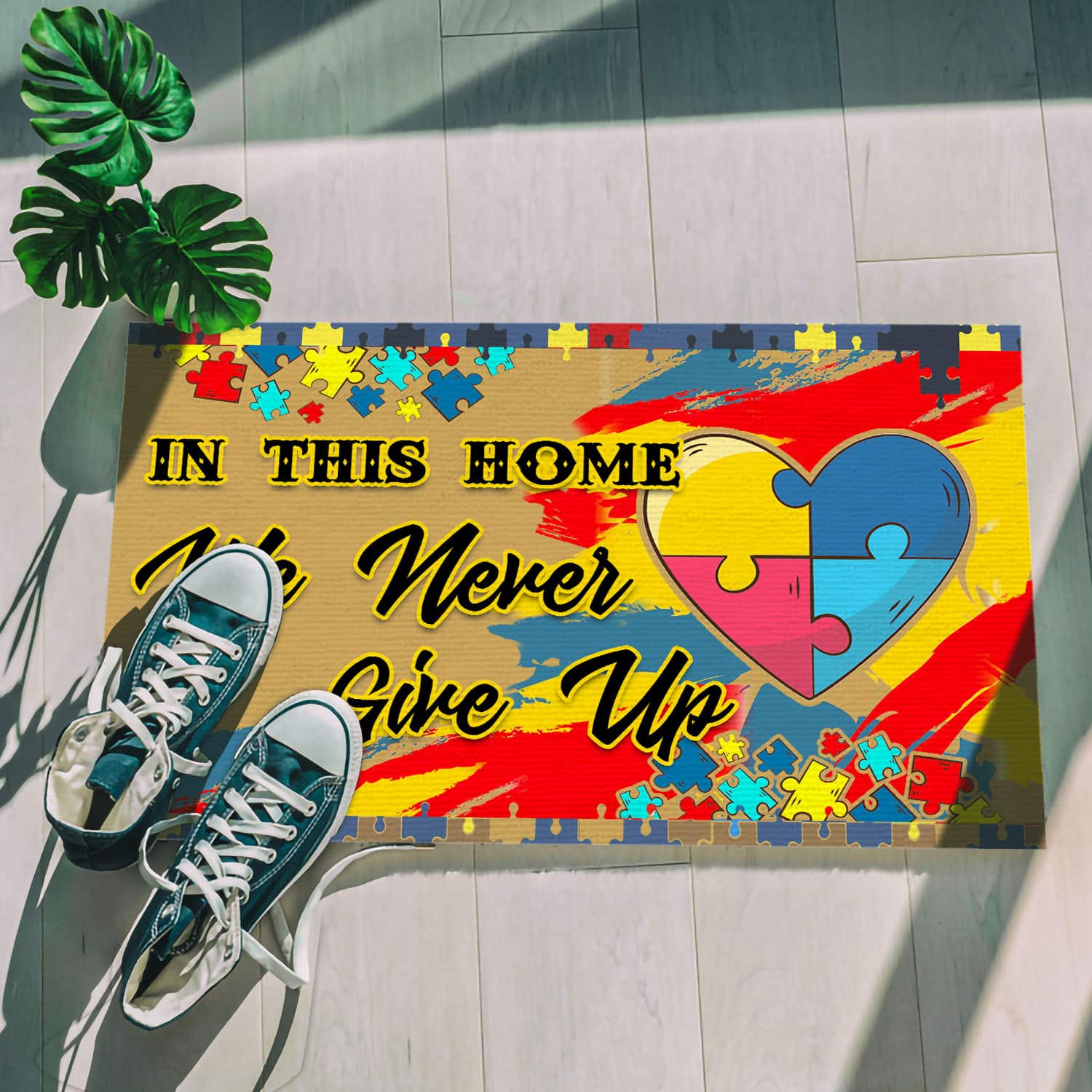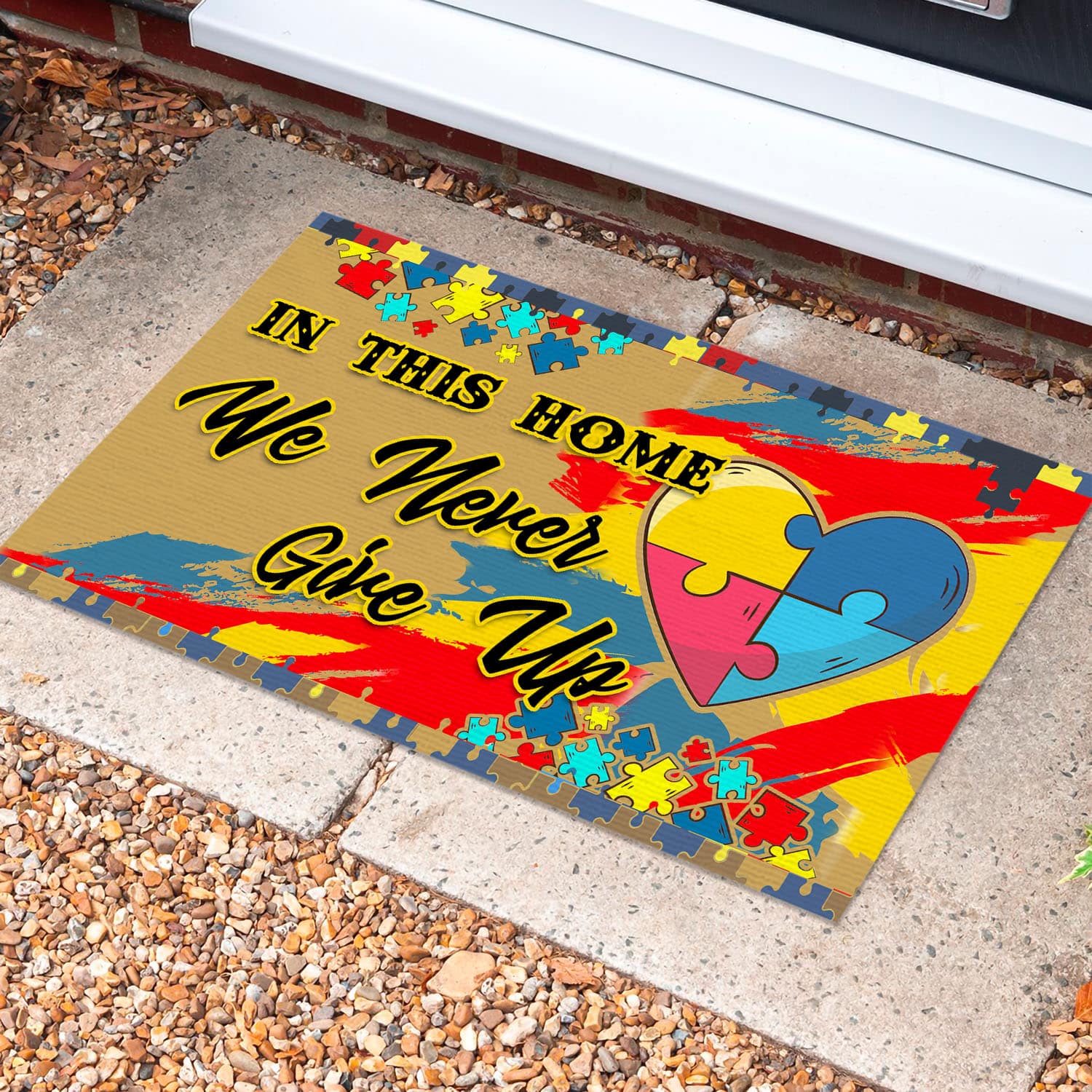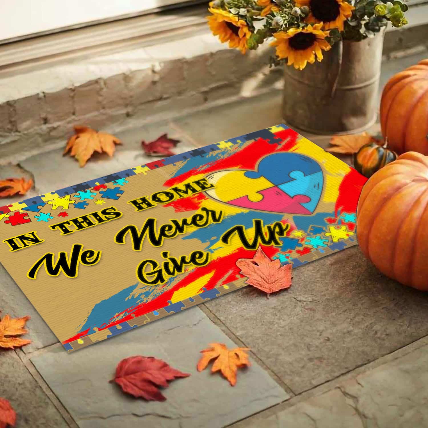 Let’s Shop In This House We Never Give Up Autism Awareness Puzzle Entrance Indoor Outdoor Decorative Doormat!