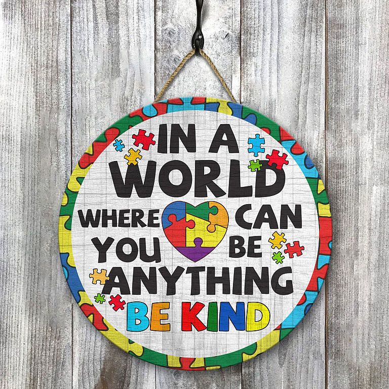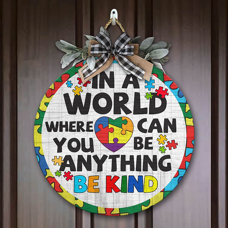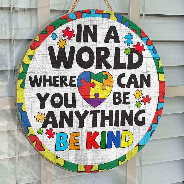Let’s Shop In A World Where You Can Be Anything Be Kind Autism Circle Wooden Door Sign – Front Porch Sign Outdoor Decor!