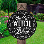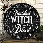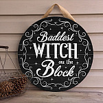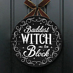 Let’s Shop Baddest Witch On The Block Decorative Circle Wooden Door Sign – Funny Halloween Witch Sign!