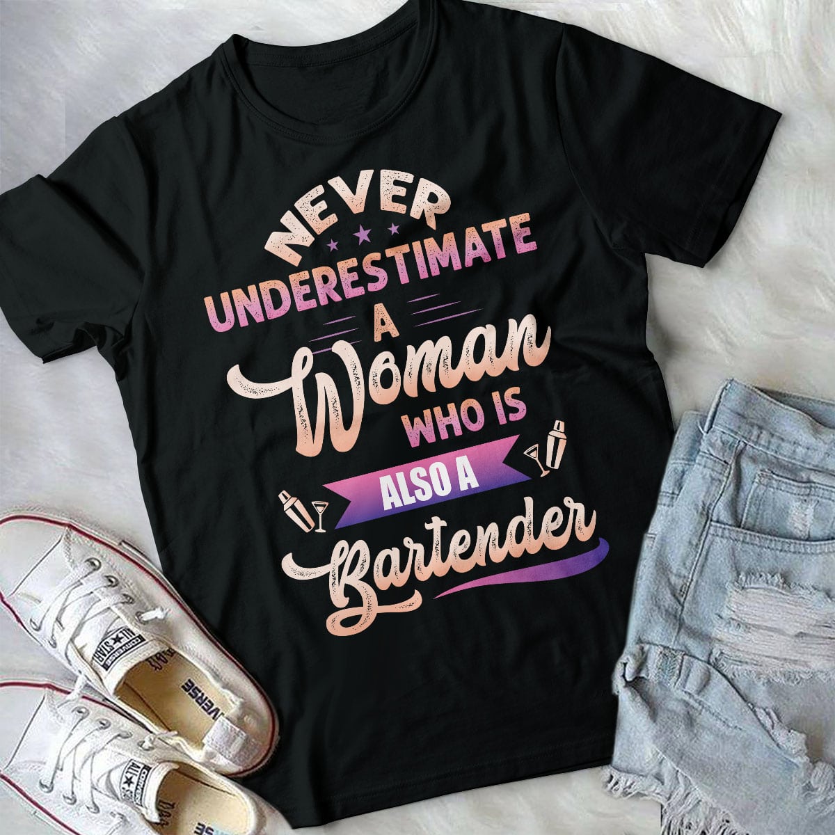 Never Underestimate A Woman Who Is Also A Bartender T-Shirt – V-Neck – Bartender Shirt For Women