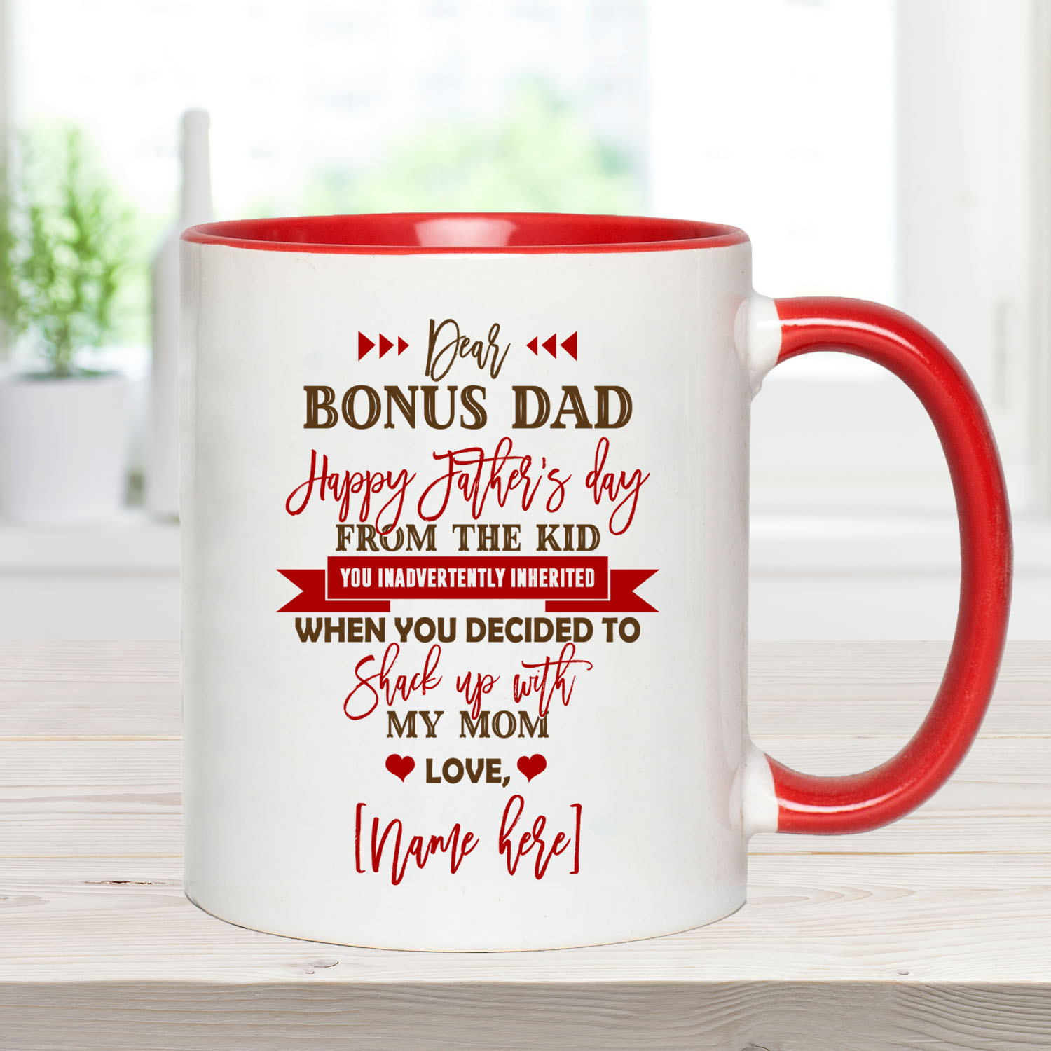 Shop Personalized Dear Bonus Dad Happy Father’s Day from the Kid Inadvertently Inherited Accent Coffee Mug.