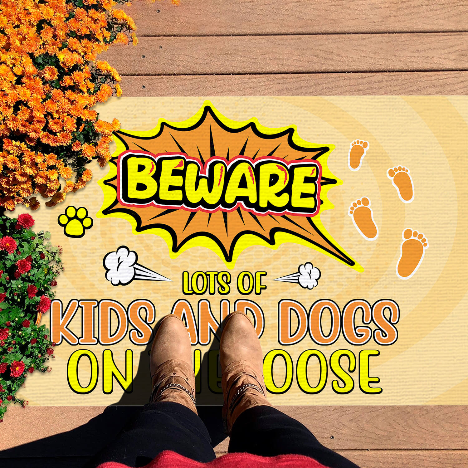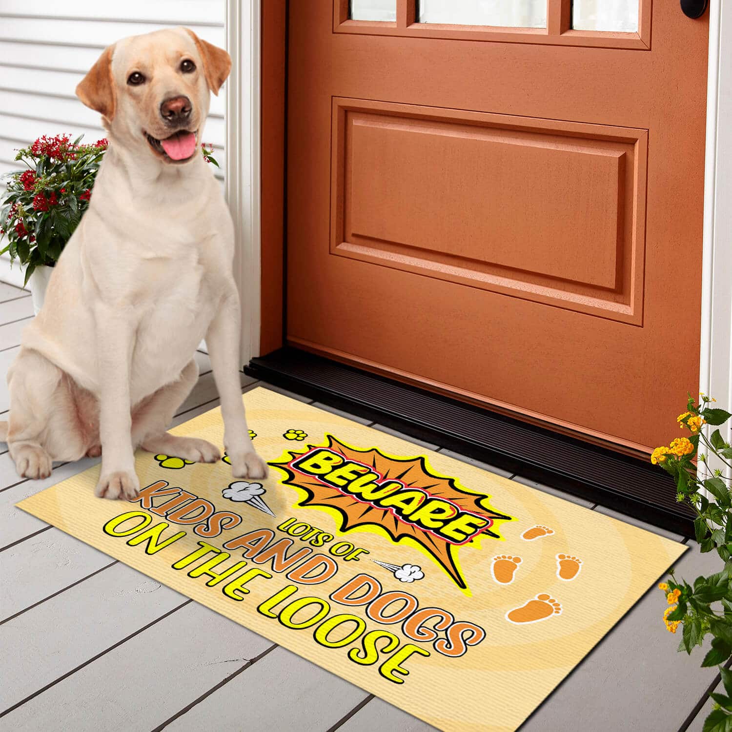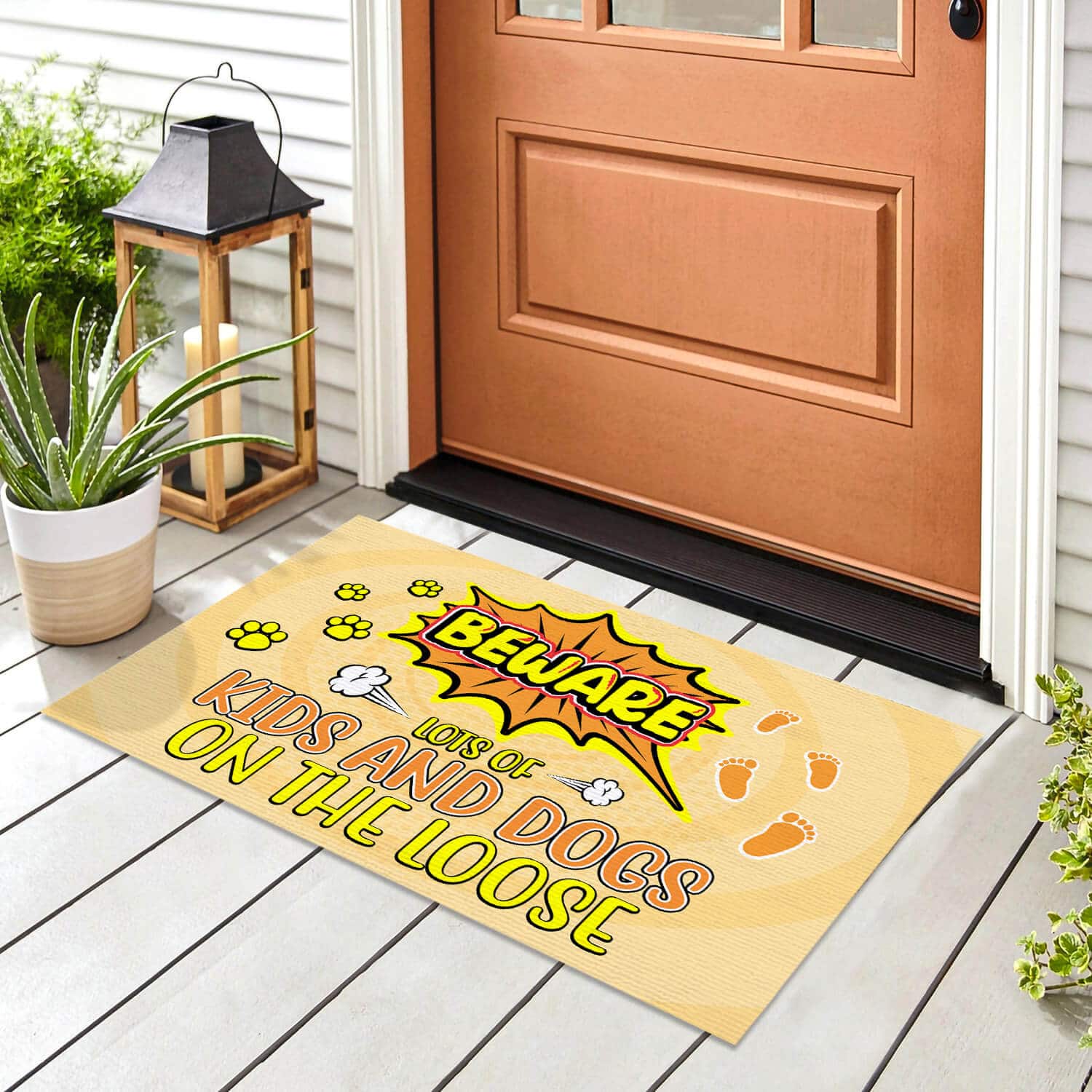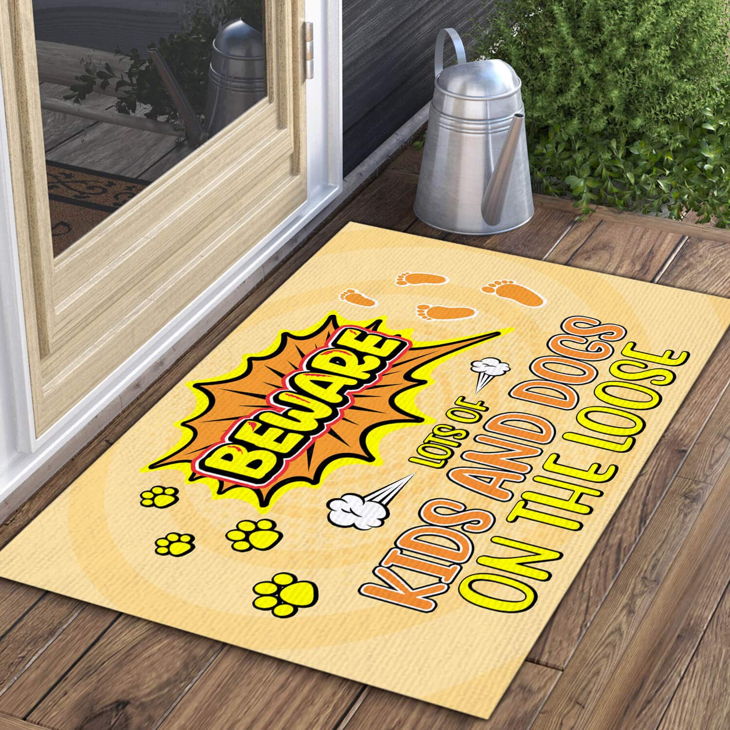Let’s Shop Beware Lots of Kids and Dogs On The Loose Funny Indoor Outdoor Decorative Doormat!