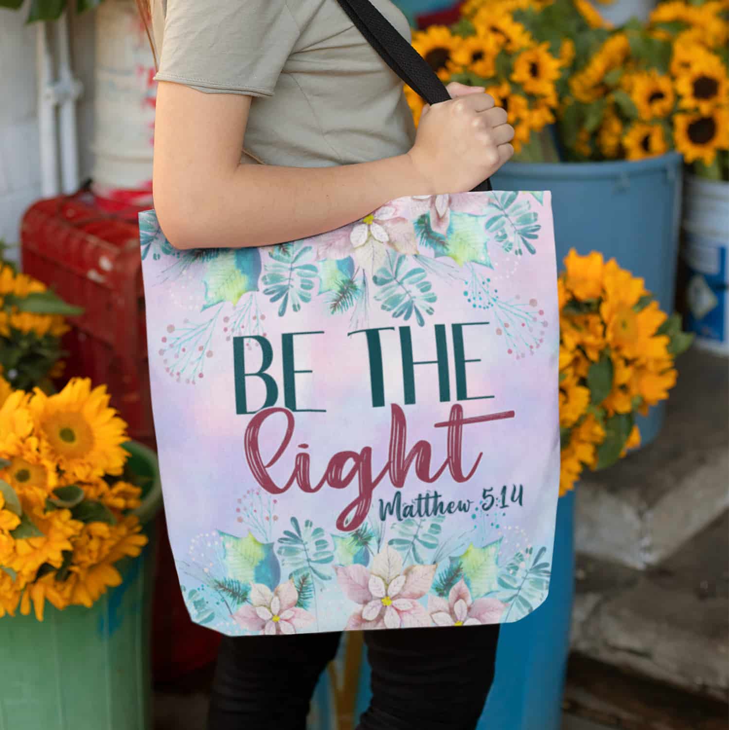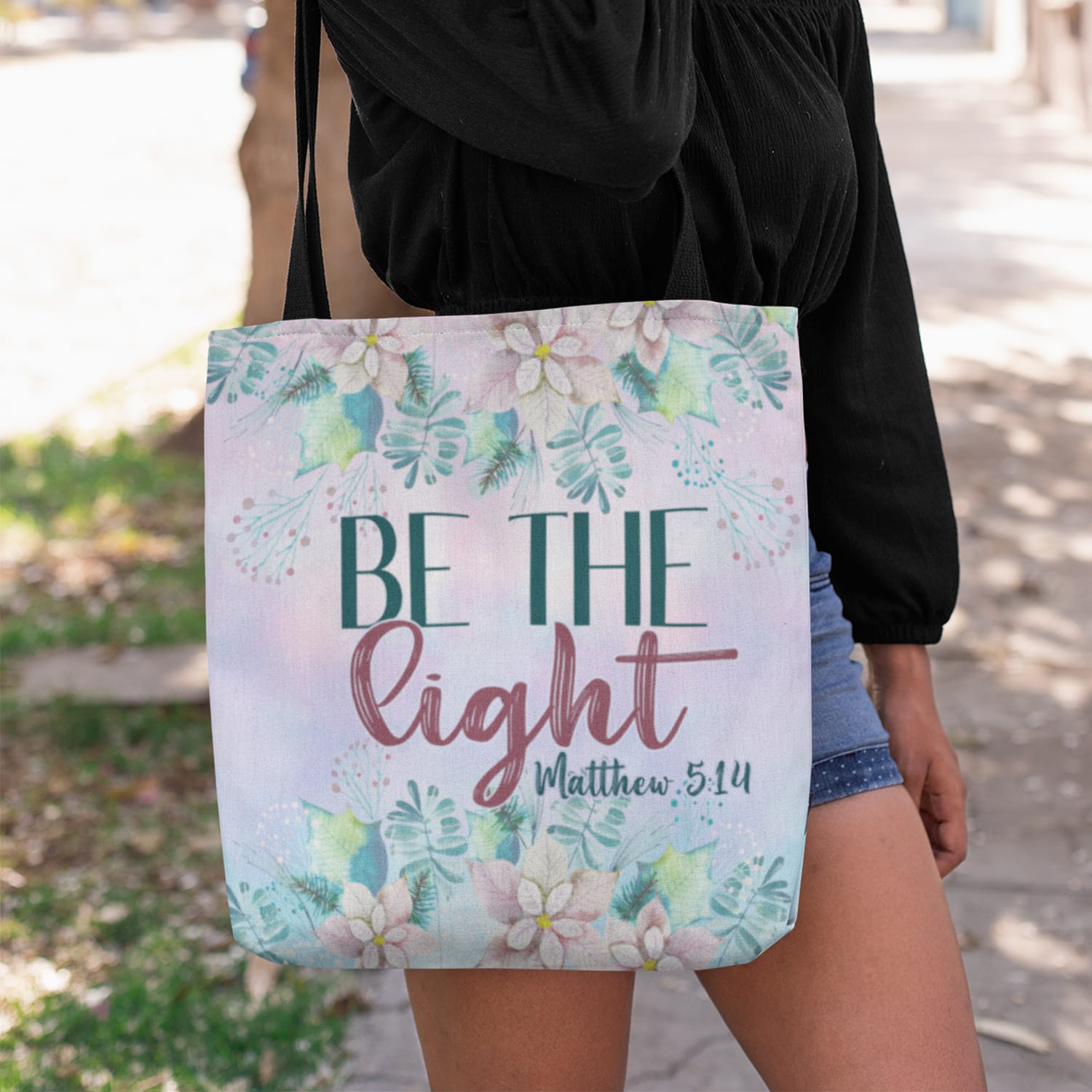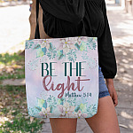 Let’s Shop Christian Be the Light Matthew 5 14 Floral All Over Print Tote Bag-Shoulder Bag-Reusable Grocery Shopping Bag!