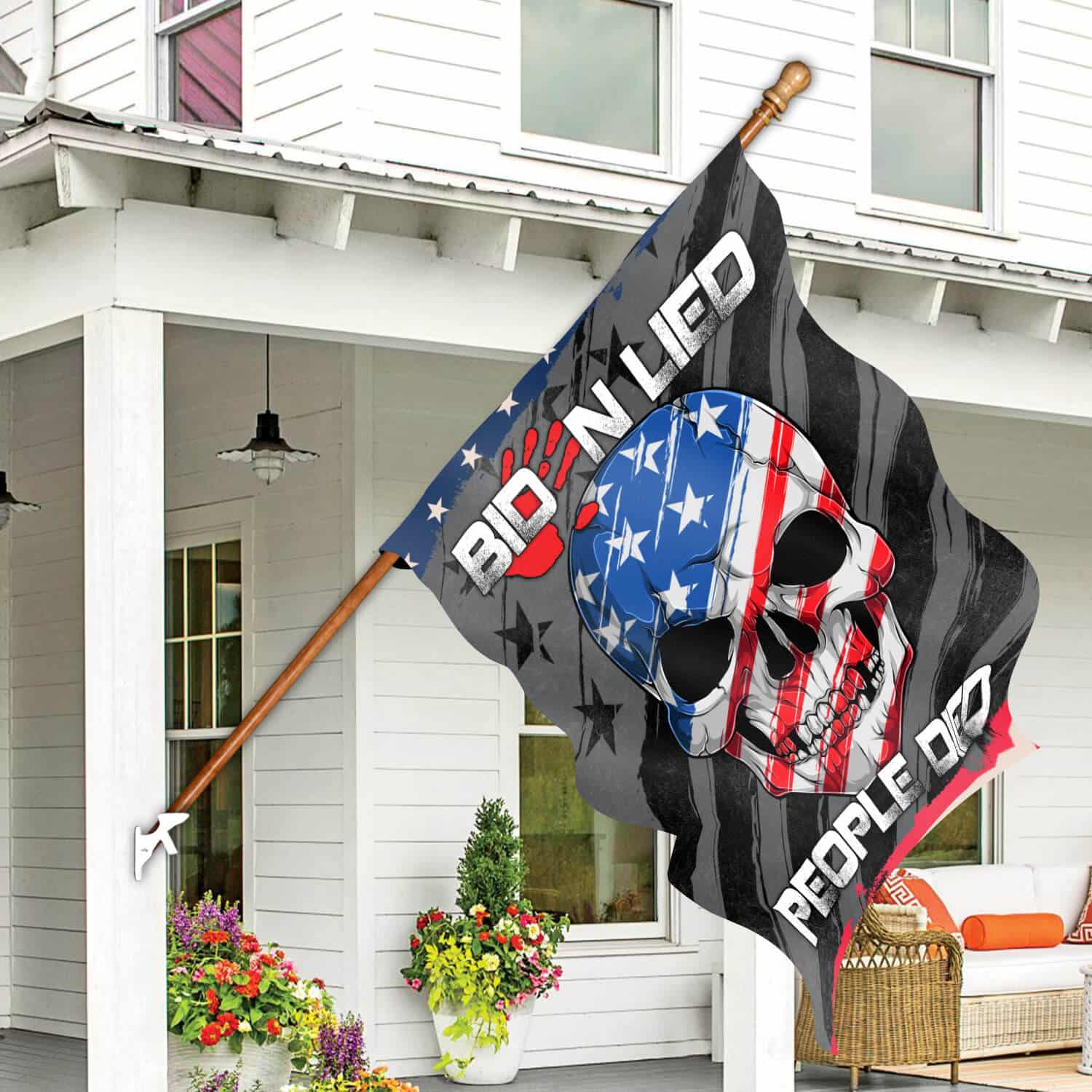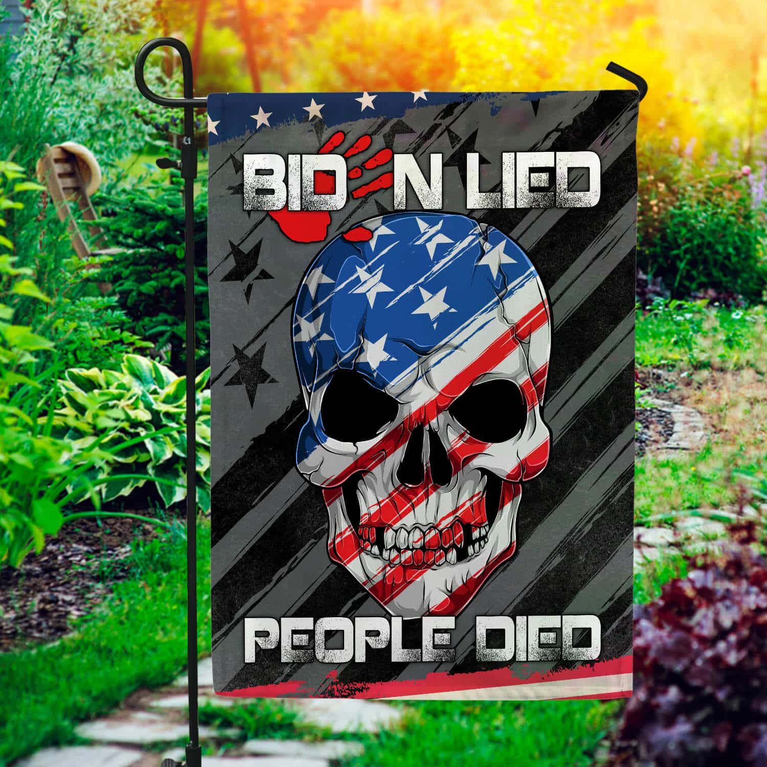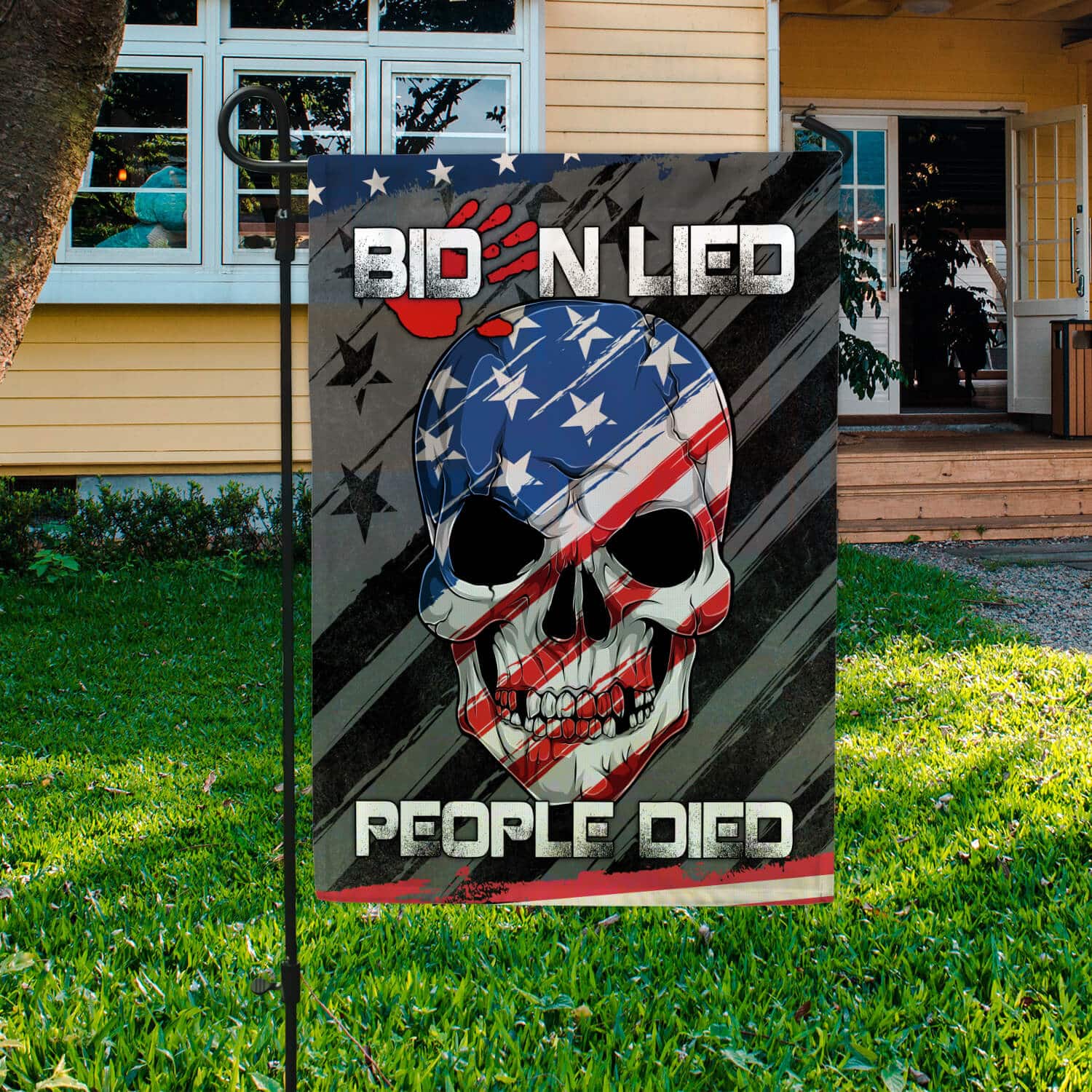 Let’s Shop Biden Lied People Died Skull Flag – Impeach Joe Biden Blood On His Hands Garden Flag – House Flag!