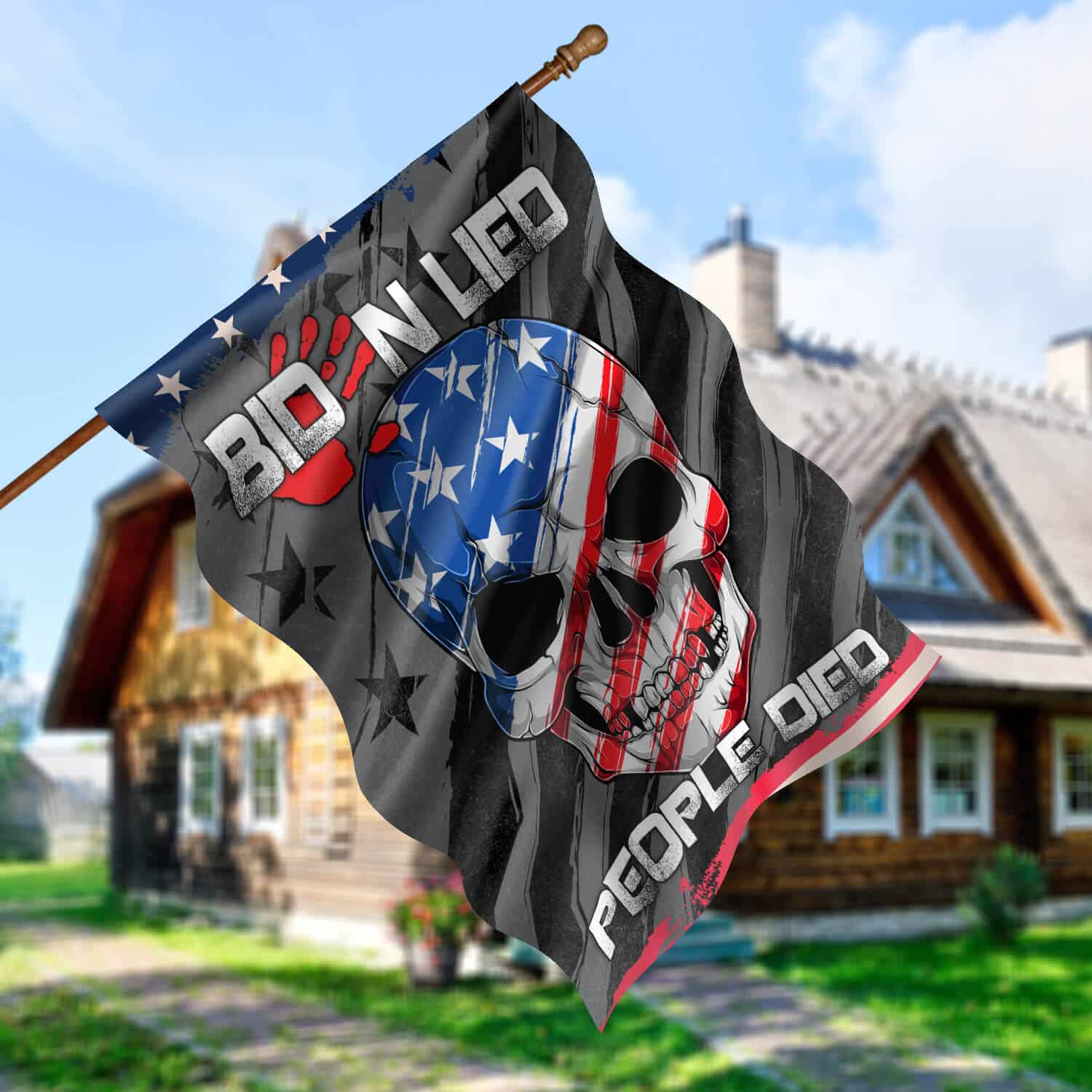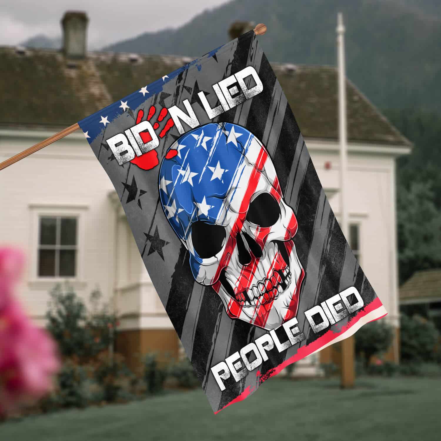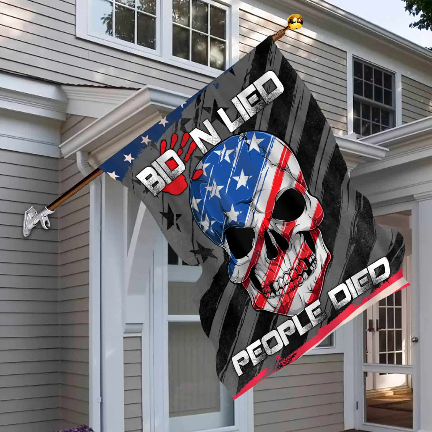 Let’s Shop Biden Lied People Died Skull Flag – Impeach Joe Biden Blood On His Hands Garden Flag – House Flag!
