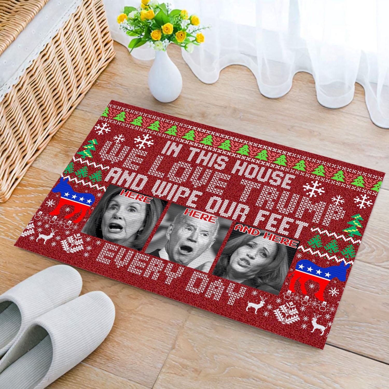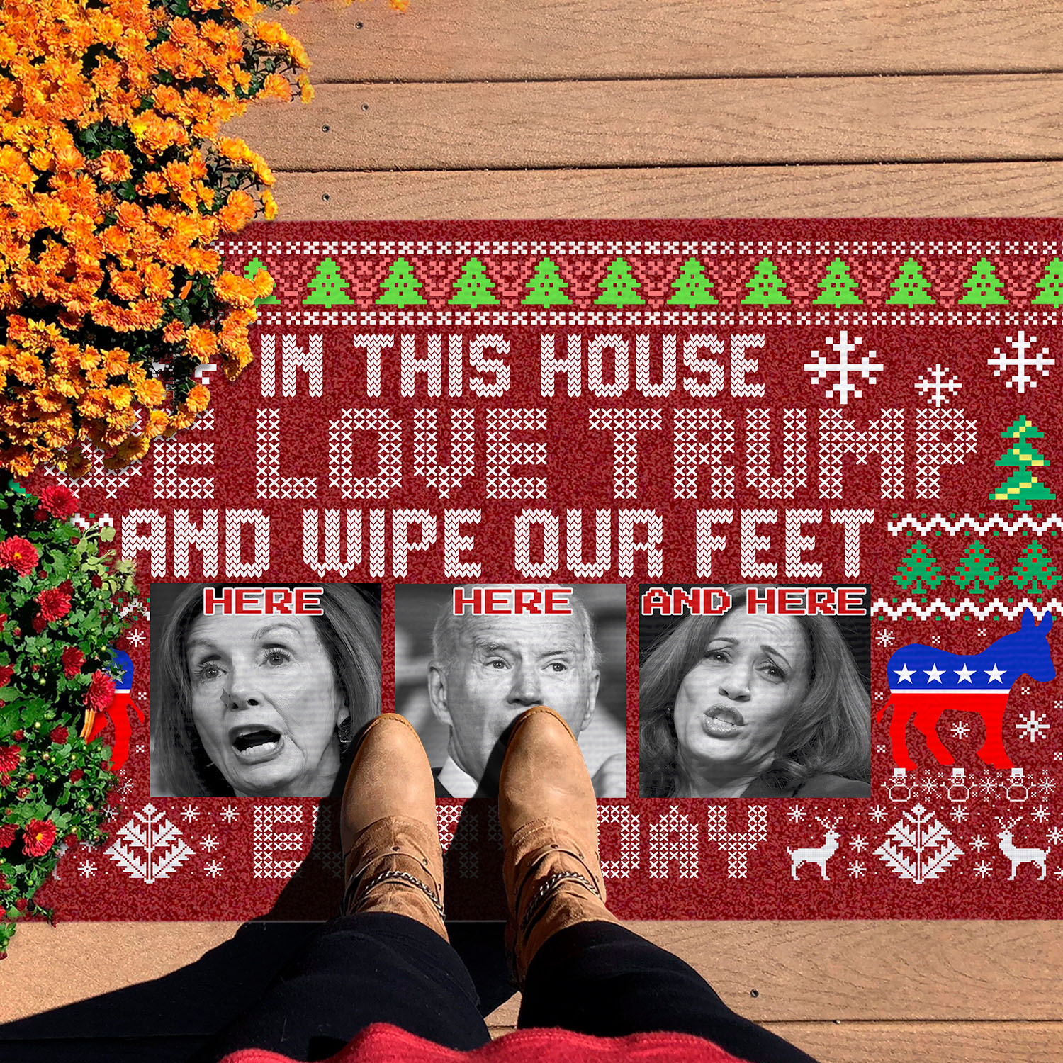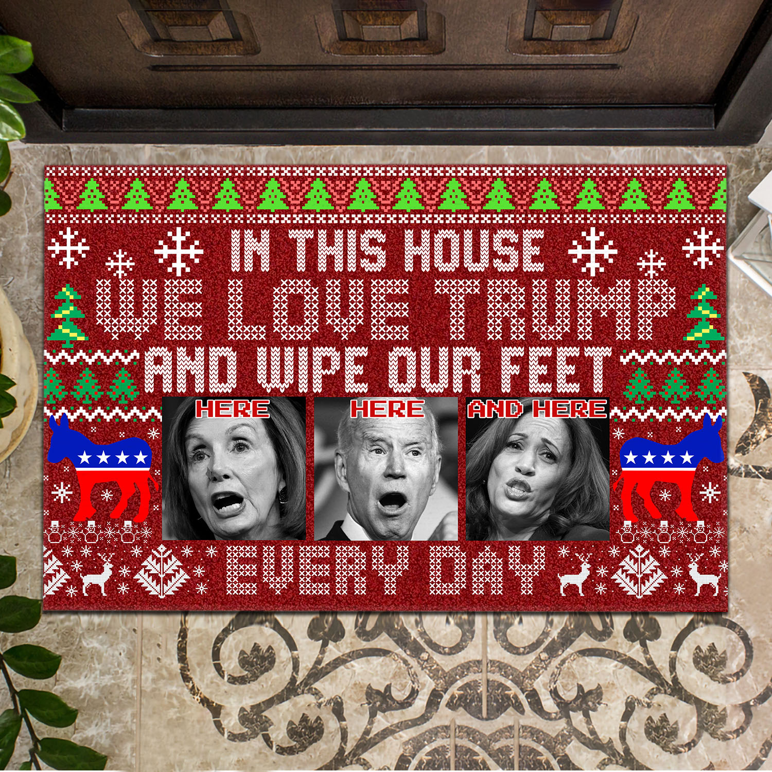 Let’s Shop In This House We Love Trump And Wipe Our Feet Here Every Day Funny Biden Harris Pelosi Ugly Christmas Doormat!