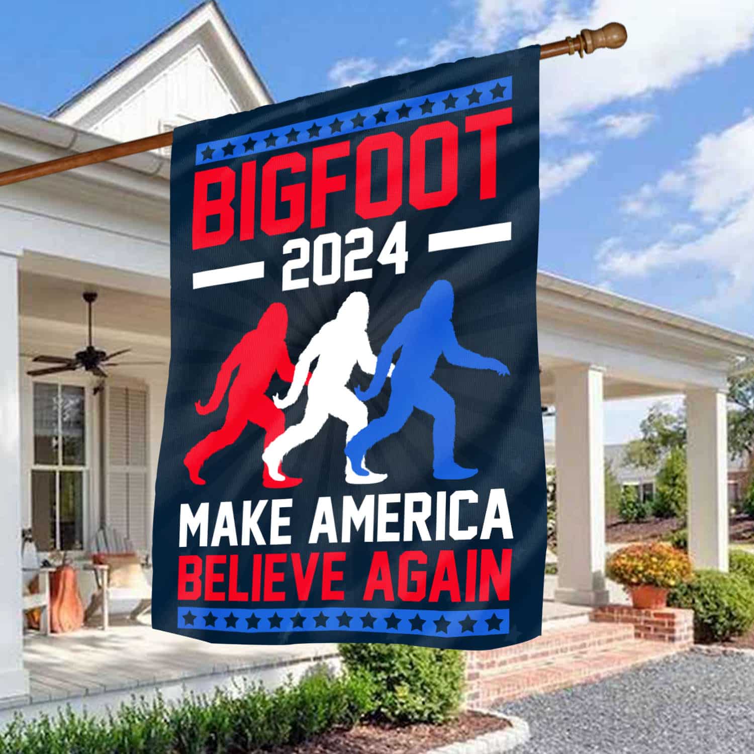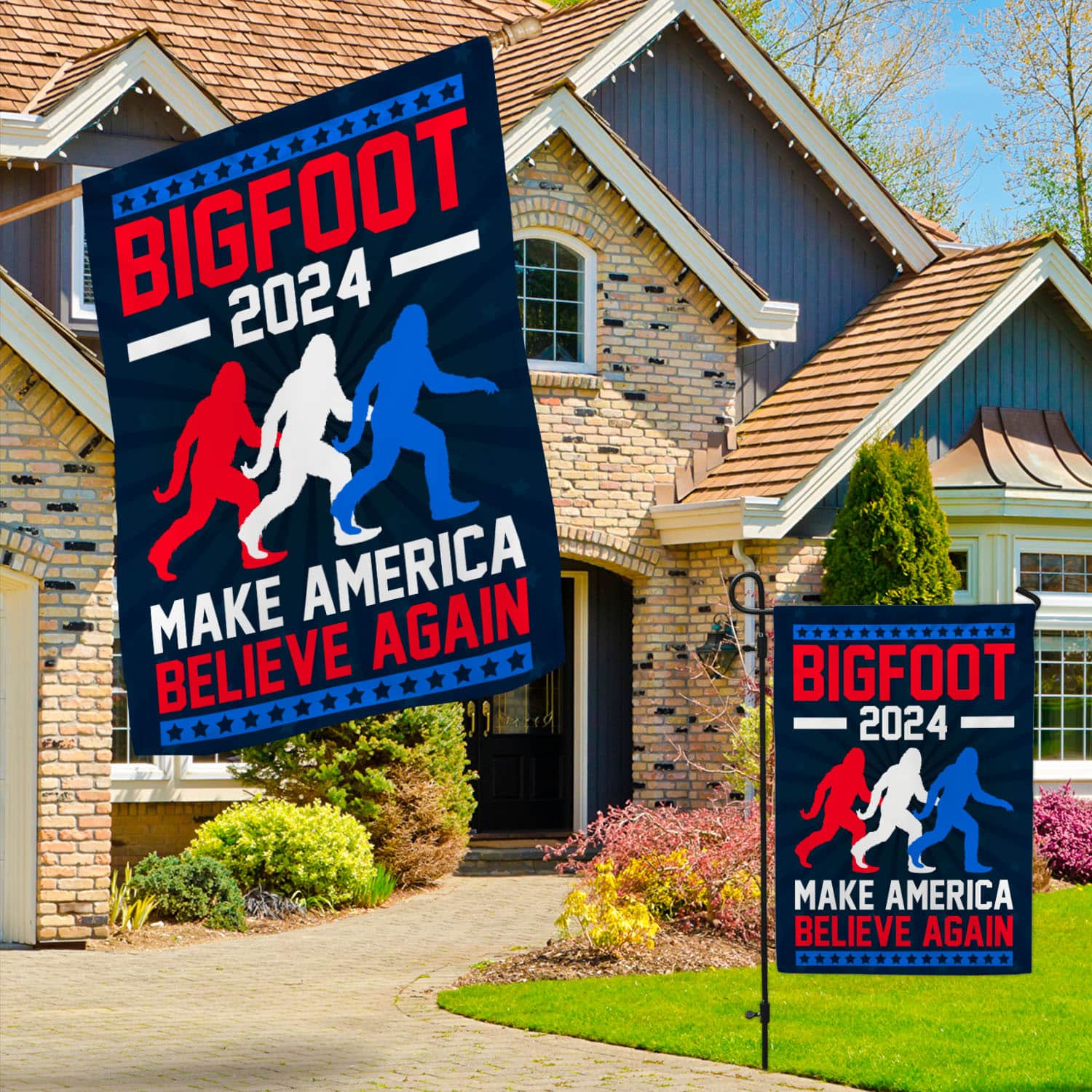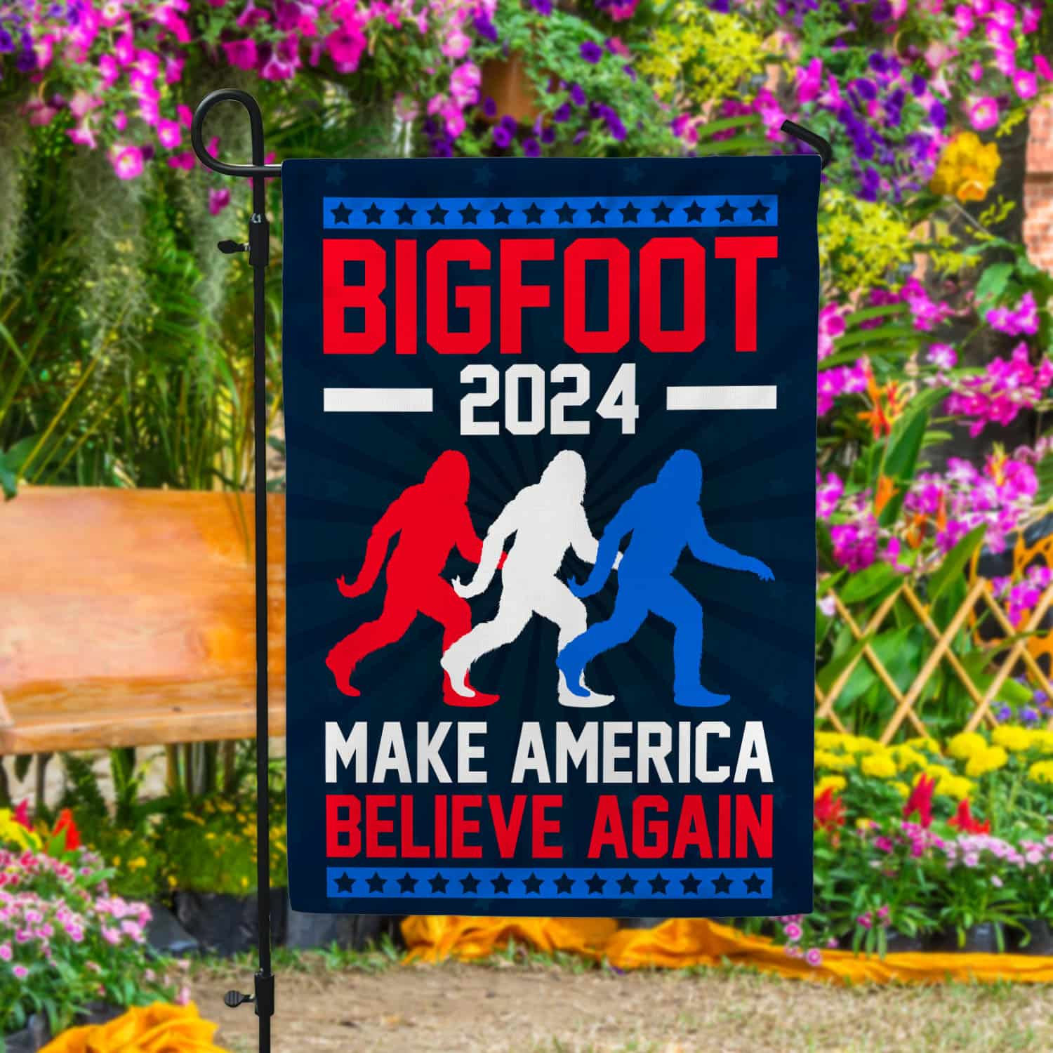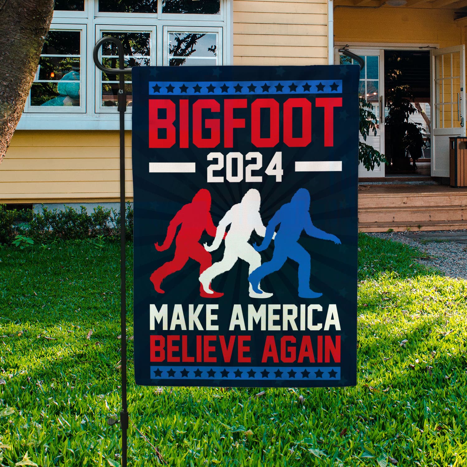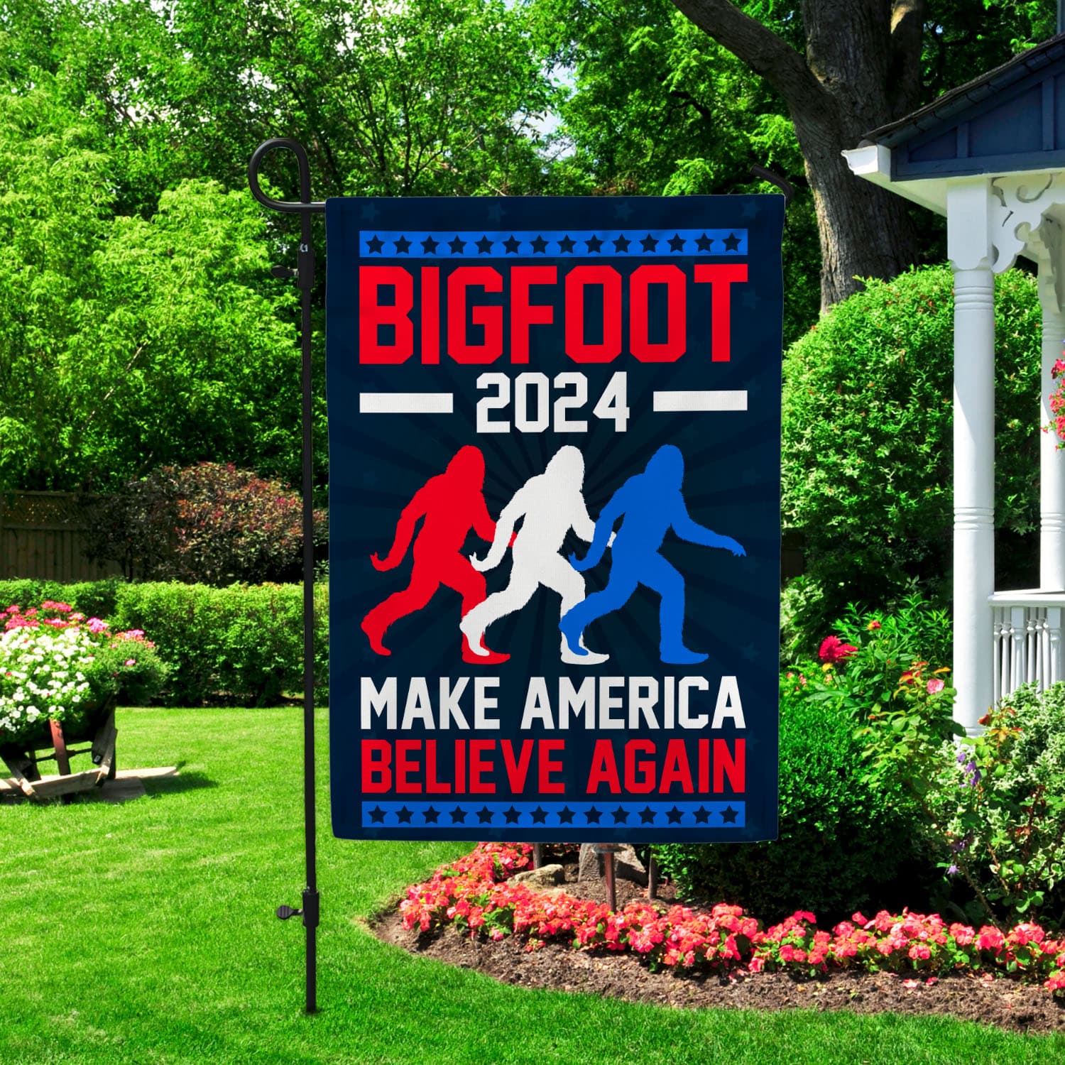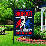 Let’s Shop Bigfoot 2024 Make American Believe Again Patriotic Garden Flag – Sasquatch House Flag!