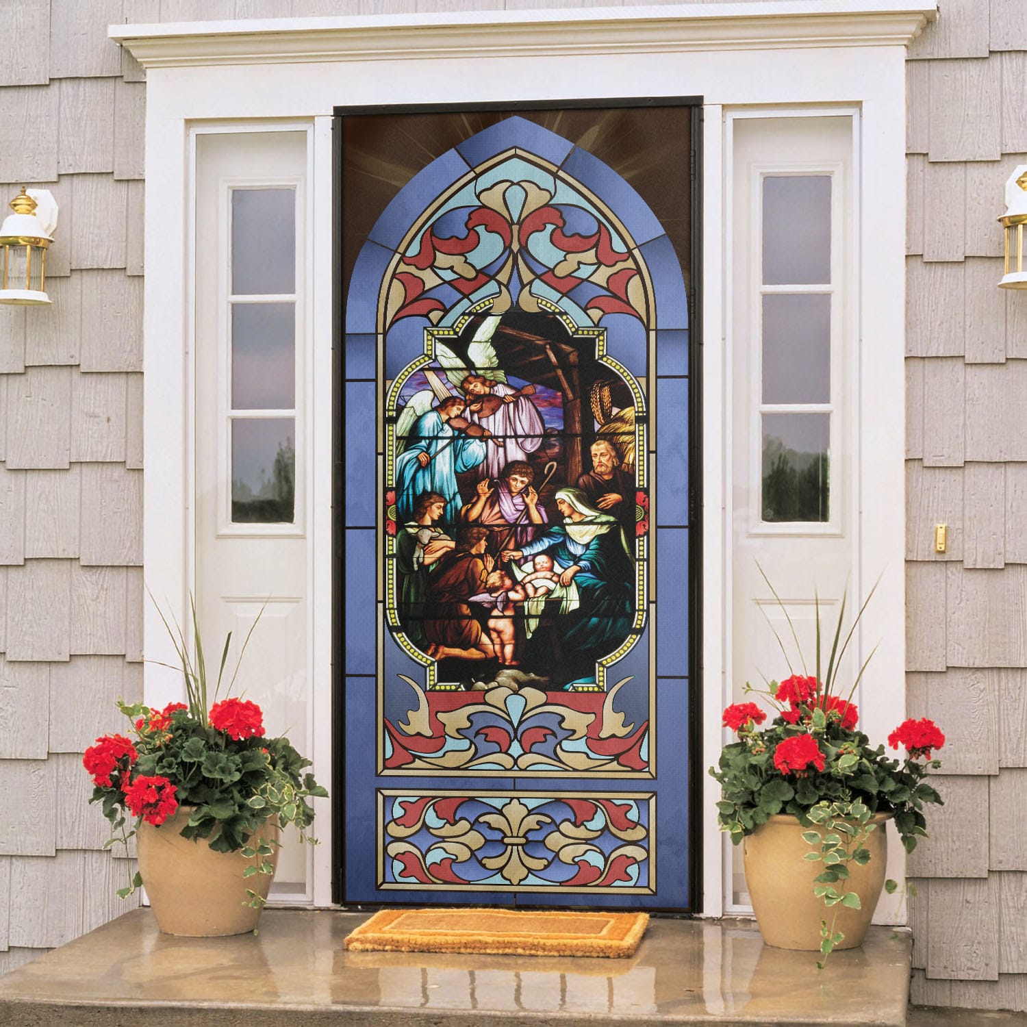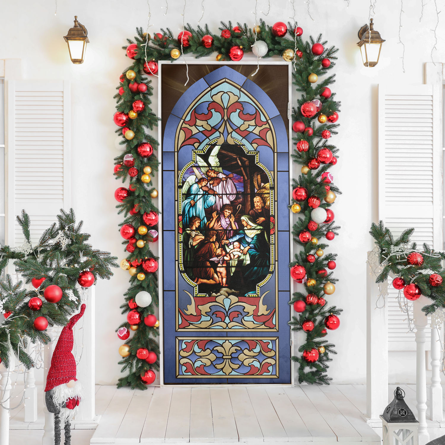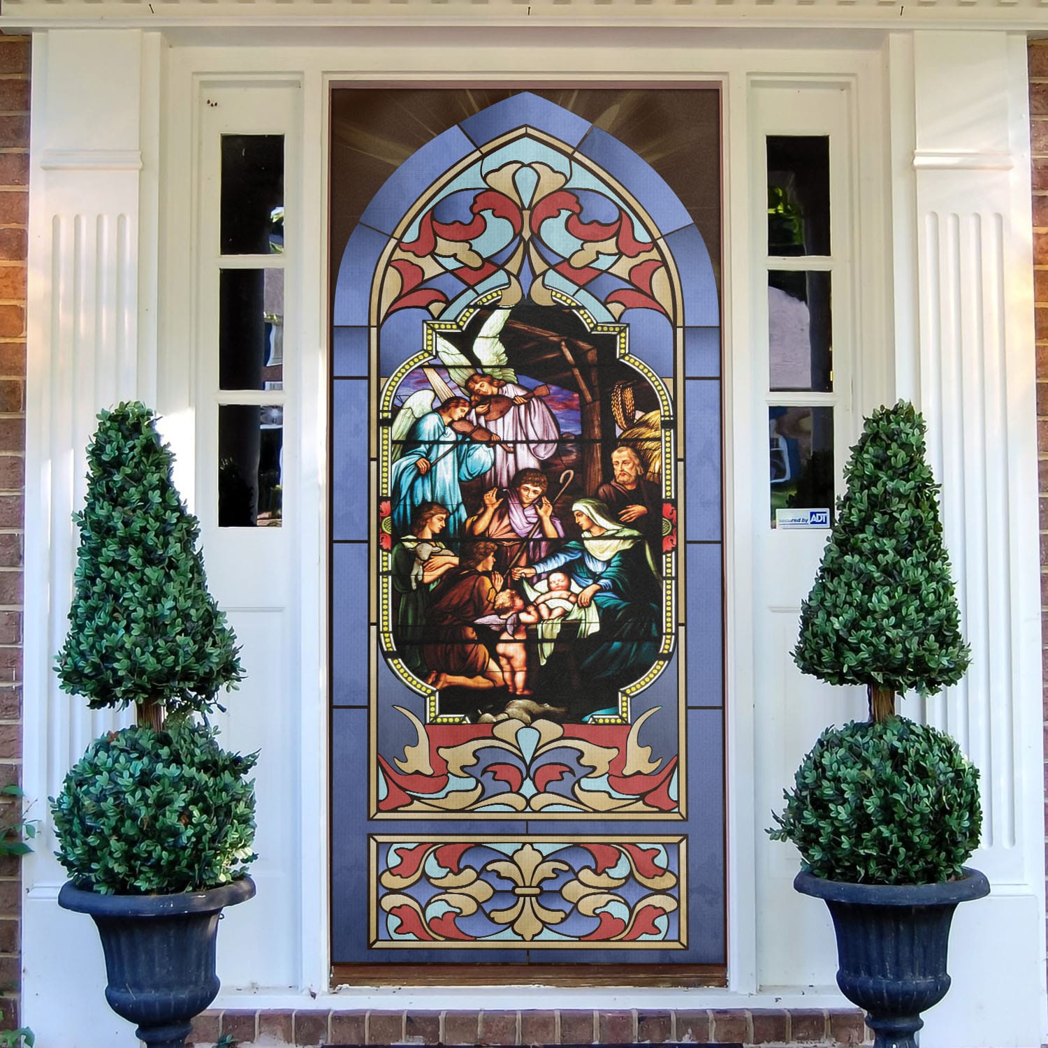 Let’s Shop The Nativity Scene Of Jesus Stained Glass Door Cover – The Birth Of Jesus Christ Scene Holy Family Christmas Door Cover!