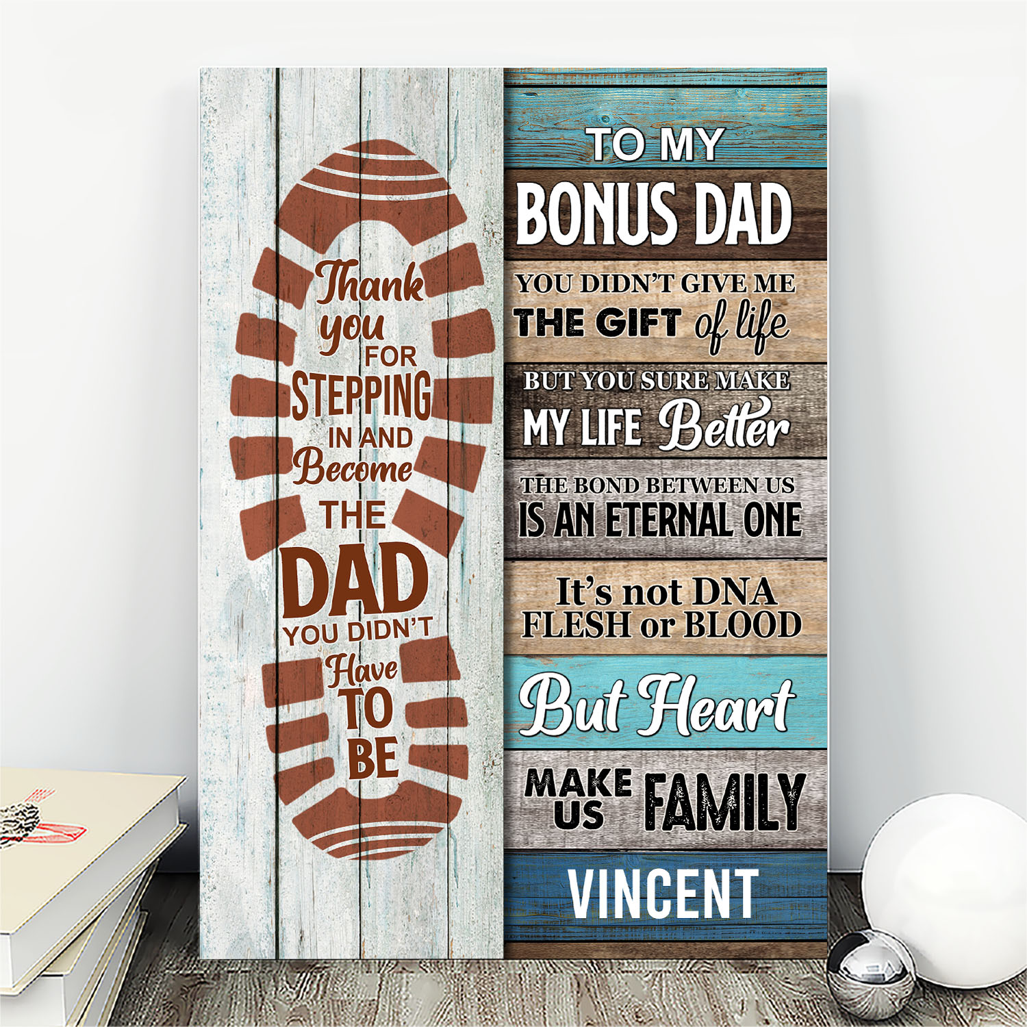 Are you spending too much time to find creative merchandise for you or suitable & special gifts for your mommy, your daddy, your son, your daughter, your children, your friends or someone you love? The struggle is over because we have various Bonus Dad Canvas, Step Dad Wall Canvas, Step Dad Canvas, Step Dad Poster, to My Step Dad Poster, Step Dad Wall Art, Step Dad Wall Decor, Bonus Dad Poster, Bonus Dad Gifts Personalized, Personalized Bonus Dad Day Gifts for Dad, Step Dad Personalized Gifts which will make perfect presents for your beloveds. In order to make your present stand out, we have created lots of unique and awesome customized photo gifts & personalized designs.