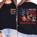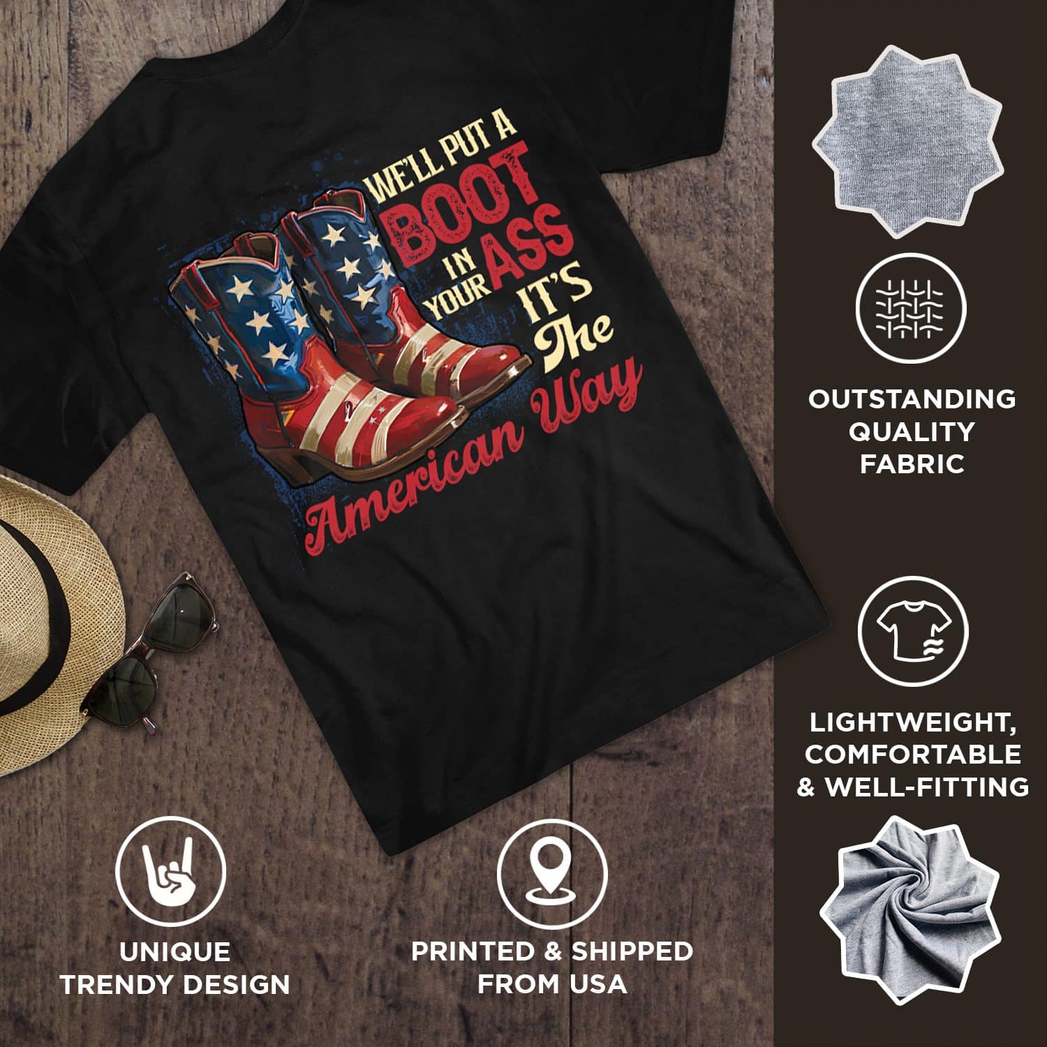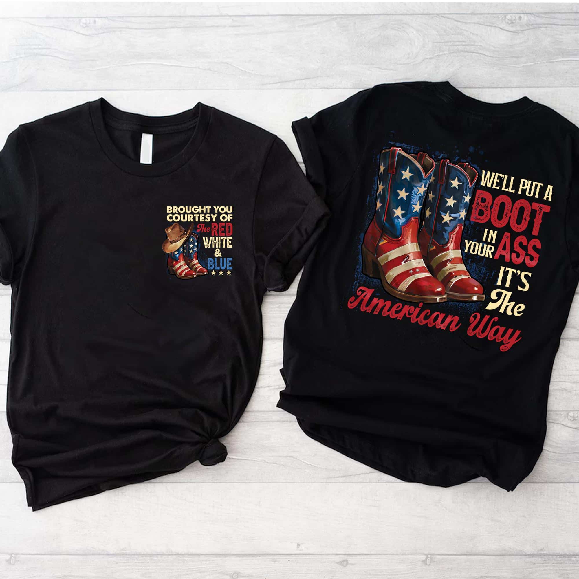 Let’s Shop Brought To You Courtesy Of The Red White And Blue Printed On 2 Sides T-Shirt – We’ll Put A Boot In Your Ass Funny Shirt!