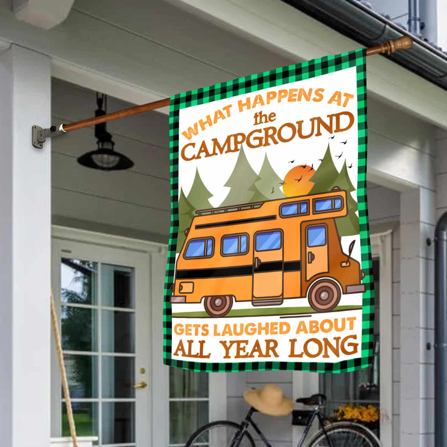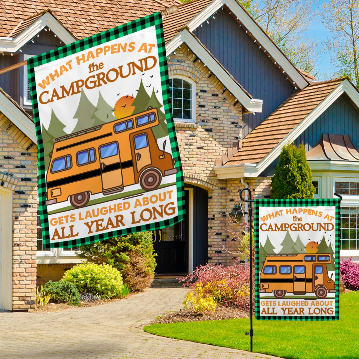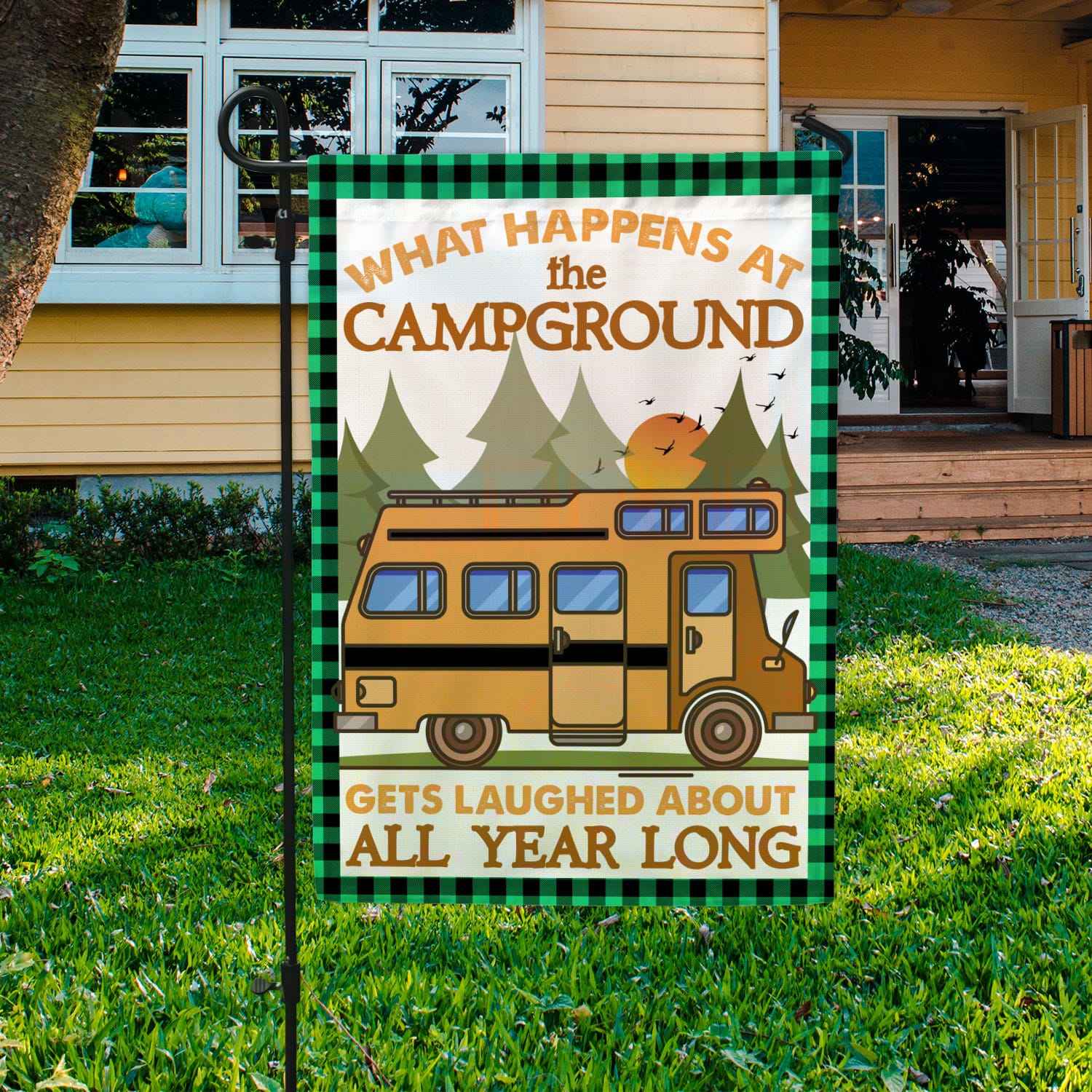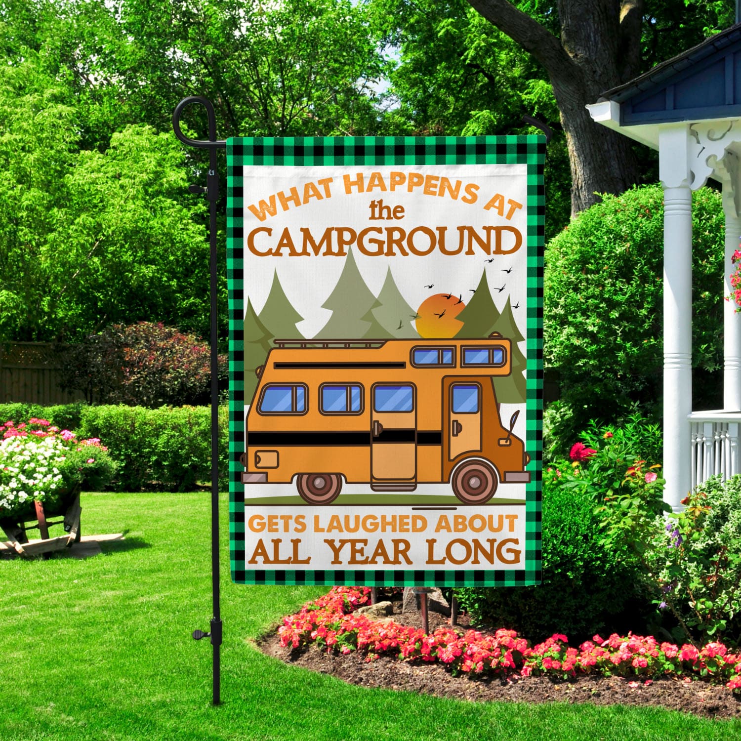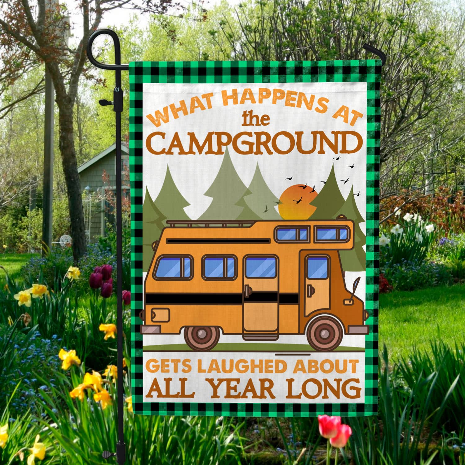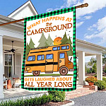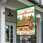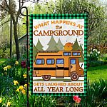Let’s Shop Camping What Happens At The Campground Gets Laugh About All Year Long Garden Flag – Camper Gift House Flag!
