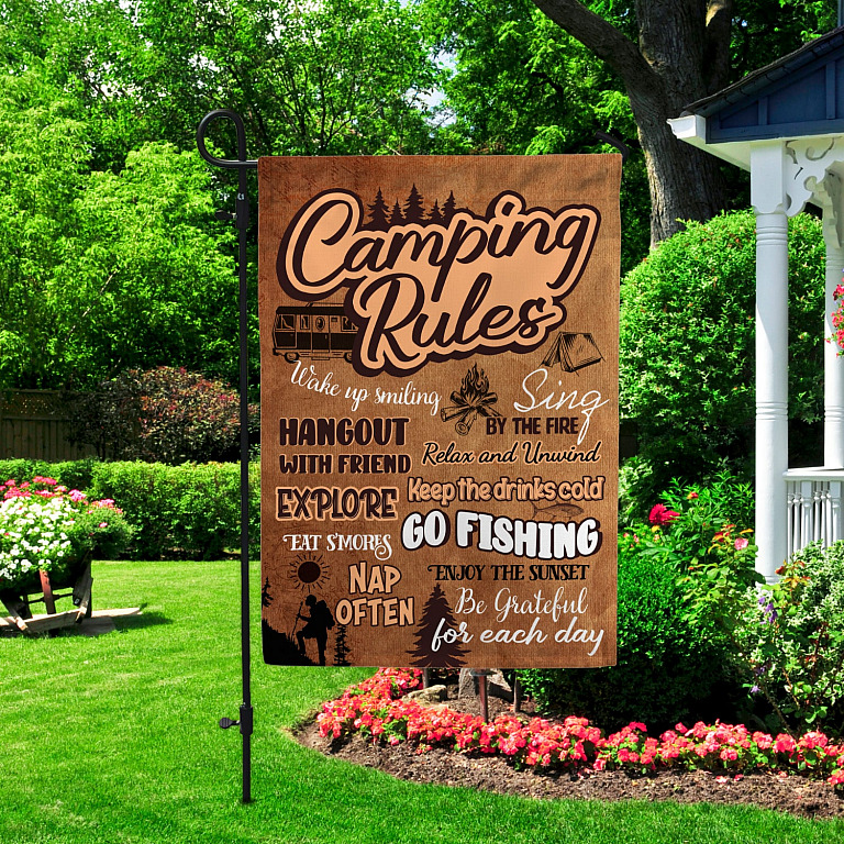 Let’s Shop Camping Rules Wake up Smiling Hangout with Friends Decorative Garden Flag – House Flag!