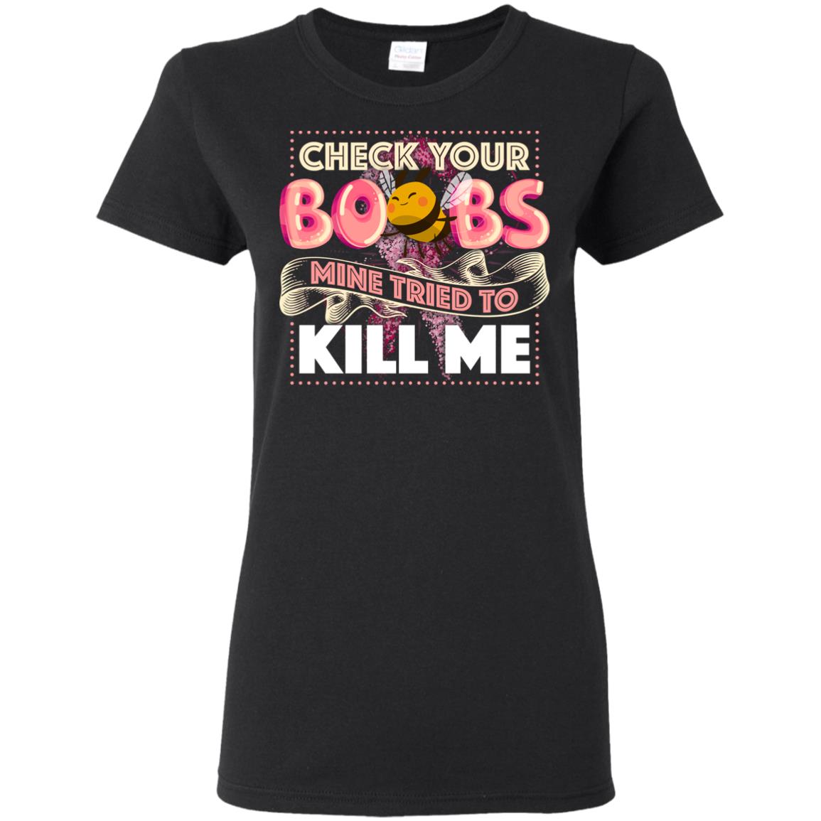 Check Your Boobs Mine Tried To Kill Me Woman T-Shirt – Ladies Shirt