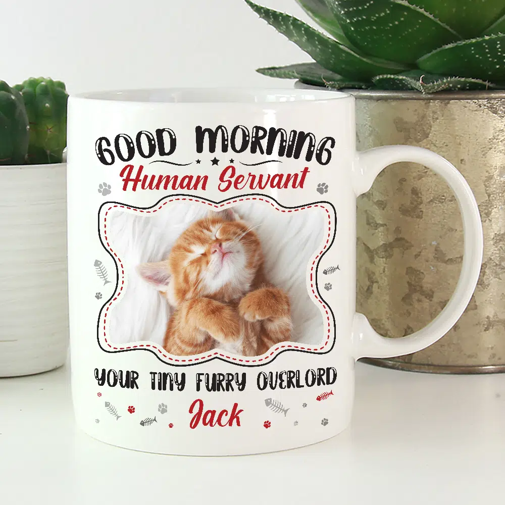 Let’s Shop Personalized Photo Good Morning Human Servant Your Tiny Furry Overlord Ceramic Coffee Mug – Cat Lover Custom Gifts!