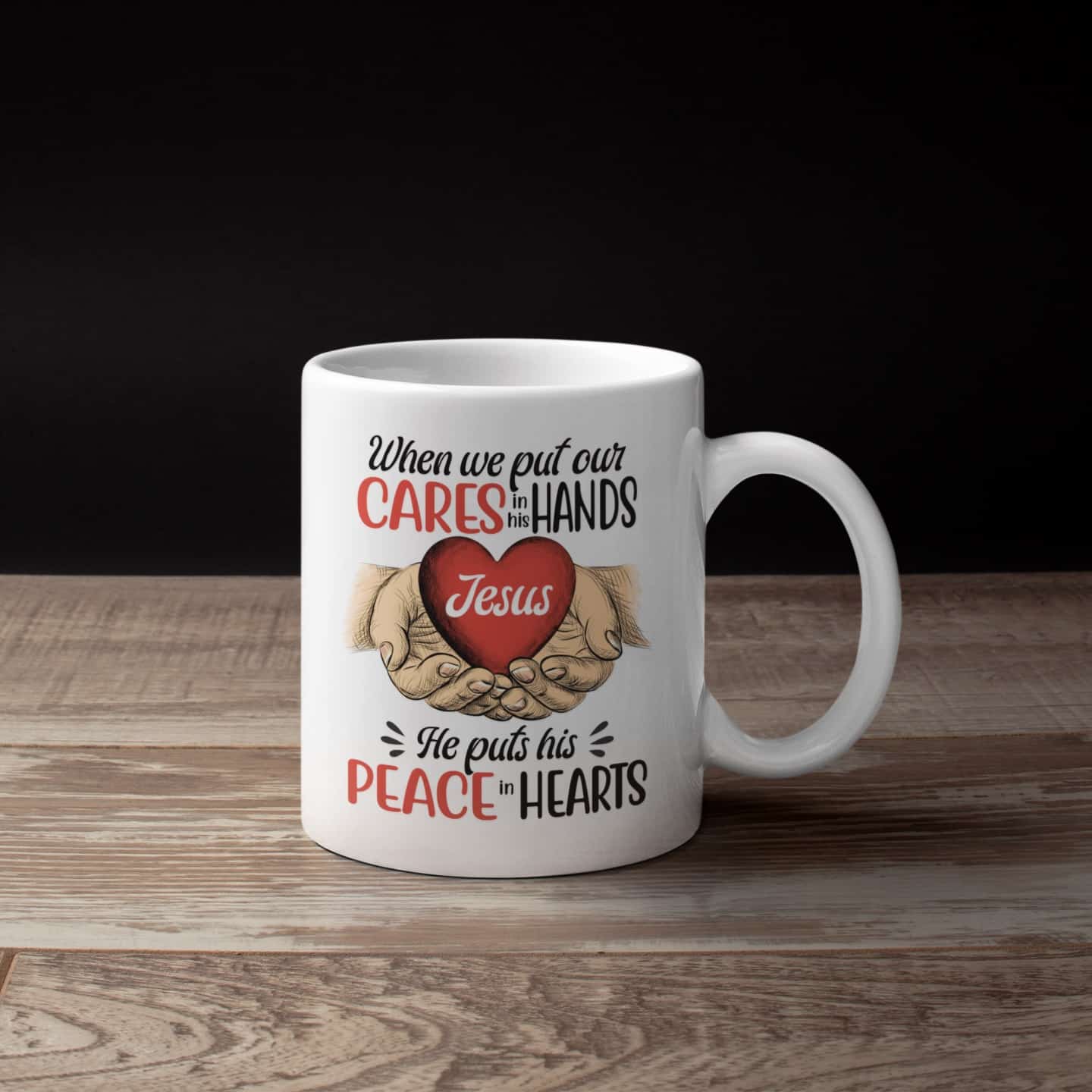 Let’s Shop If We Put Our Cares In His Hands He Puts His Peace In Our Heart Ceramic Coffee Mug!