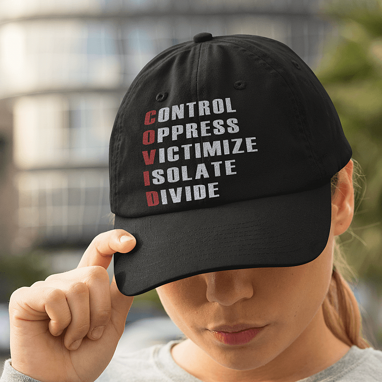 Let’s Shop C-O-V-I-D Control Oppress Victimize Isolate Divide Twill Cap – High-Profile Snapback Hat – Trucker Hat!
