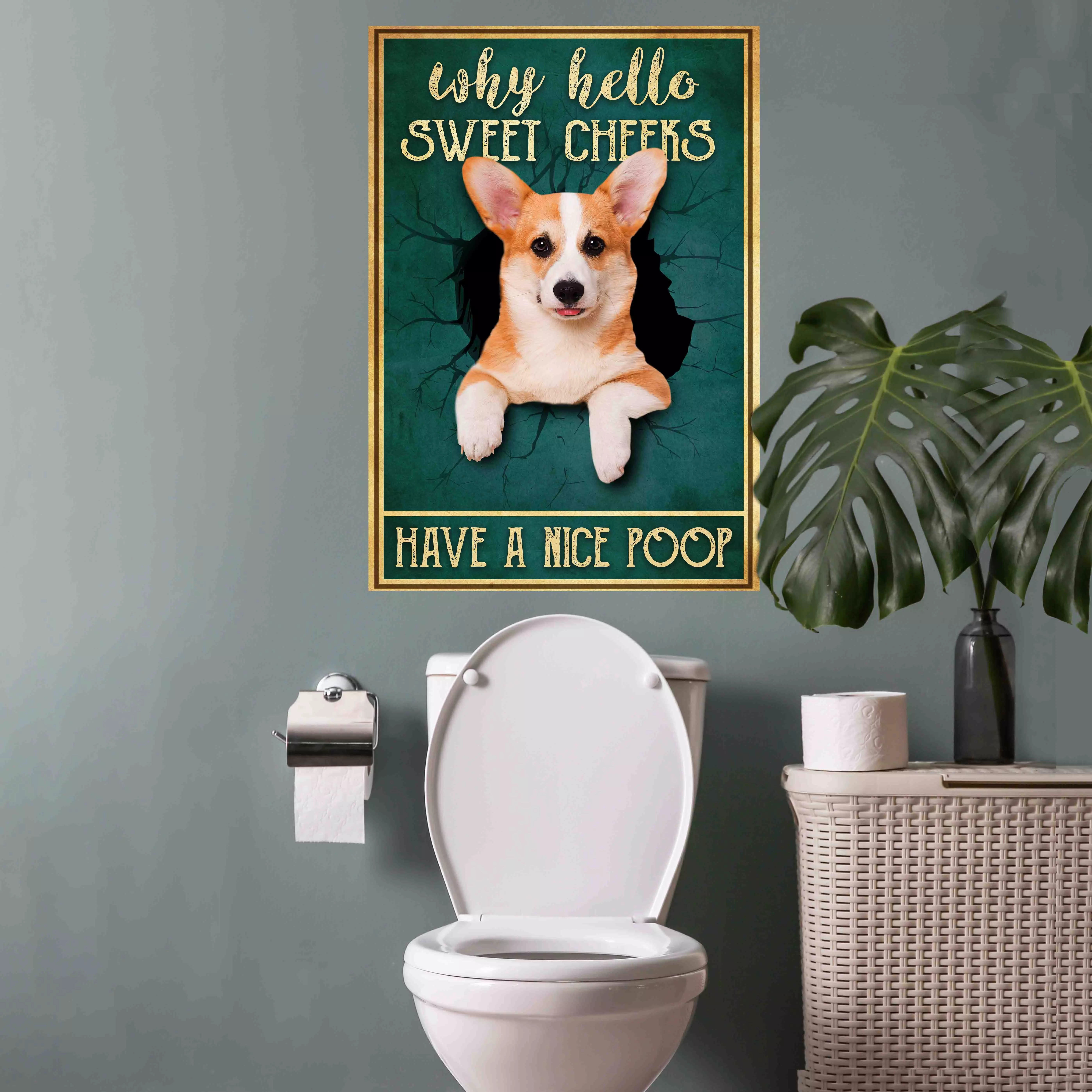 Let’s Shop Corgi Why Hello Sweet Cheeks Have A Nice Poop Framed Canvas – Unframed Poster – Funny Bathroom Decor!
