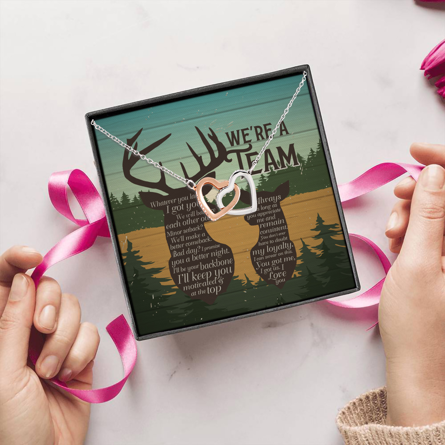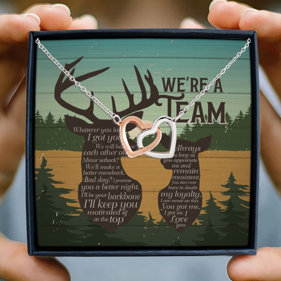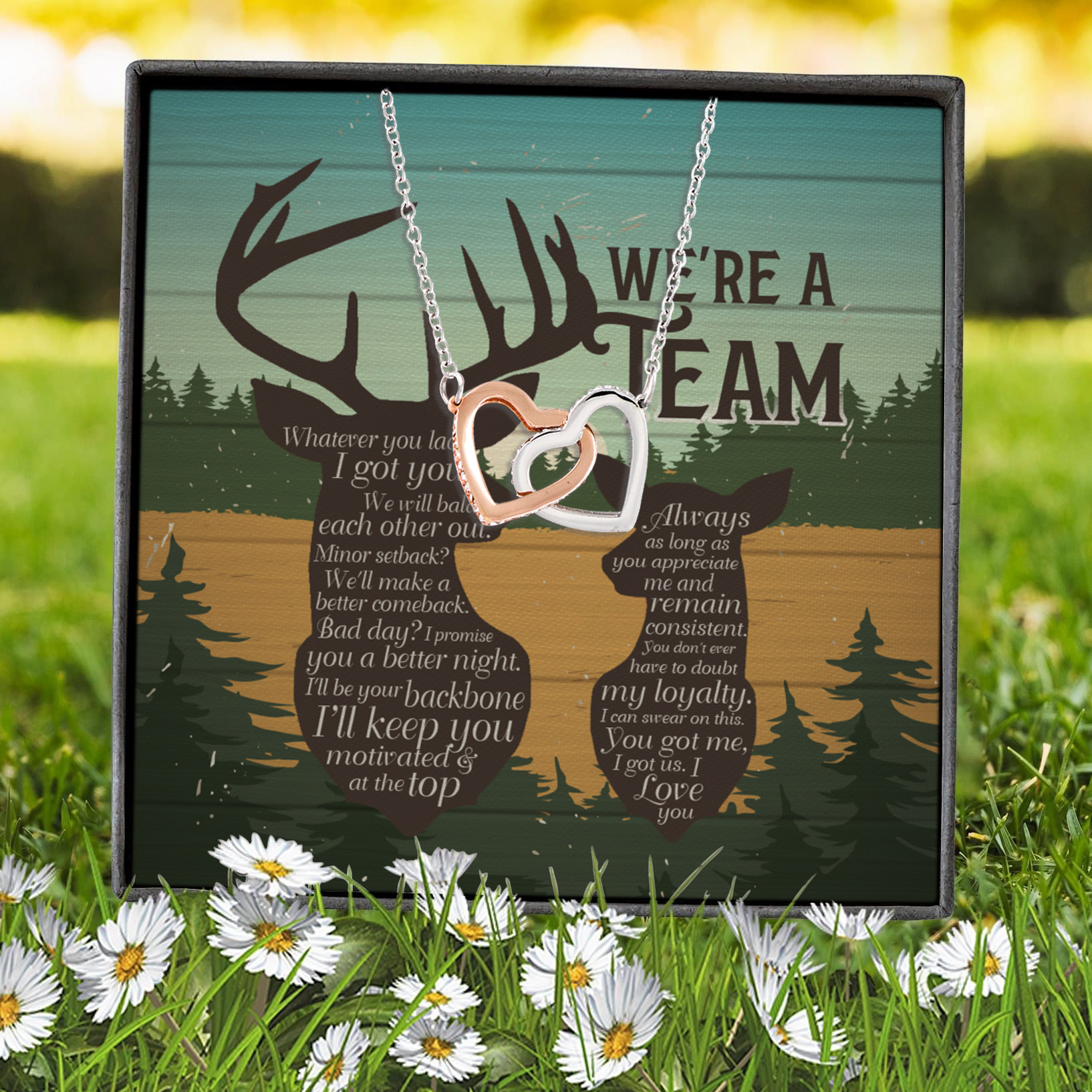 Let’s Shop Couple Deer Hunting We’re A Team Quote Interlocking Hearts Necklace – Buck Doe Deer Couple Saying Necklace!