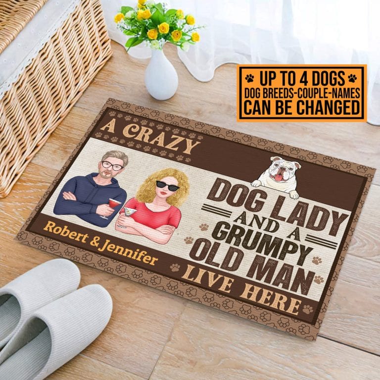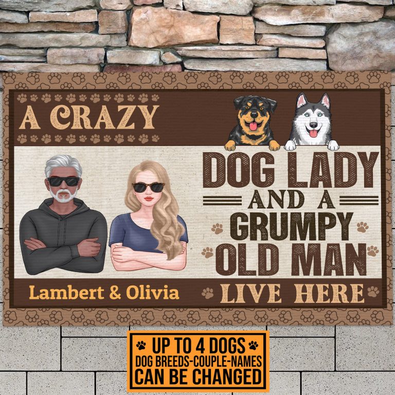 Let’s Shop Personalized A Crazy Dog Lady And A Grumpy Old Man Live Here House Doormat – Outdoor Indoor Doormat!