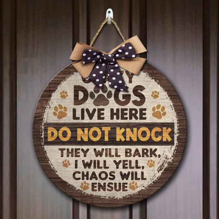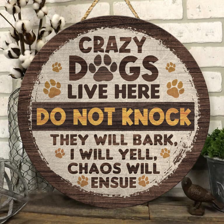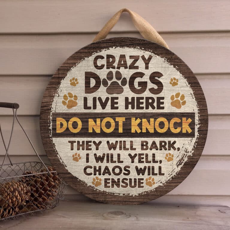 Let’s Shop Crazy Dogs Live Here Don’t Knock Door Sign They Will Bark I Will Yell Doorsign – Funny Dogs Wooden Door Hangers!