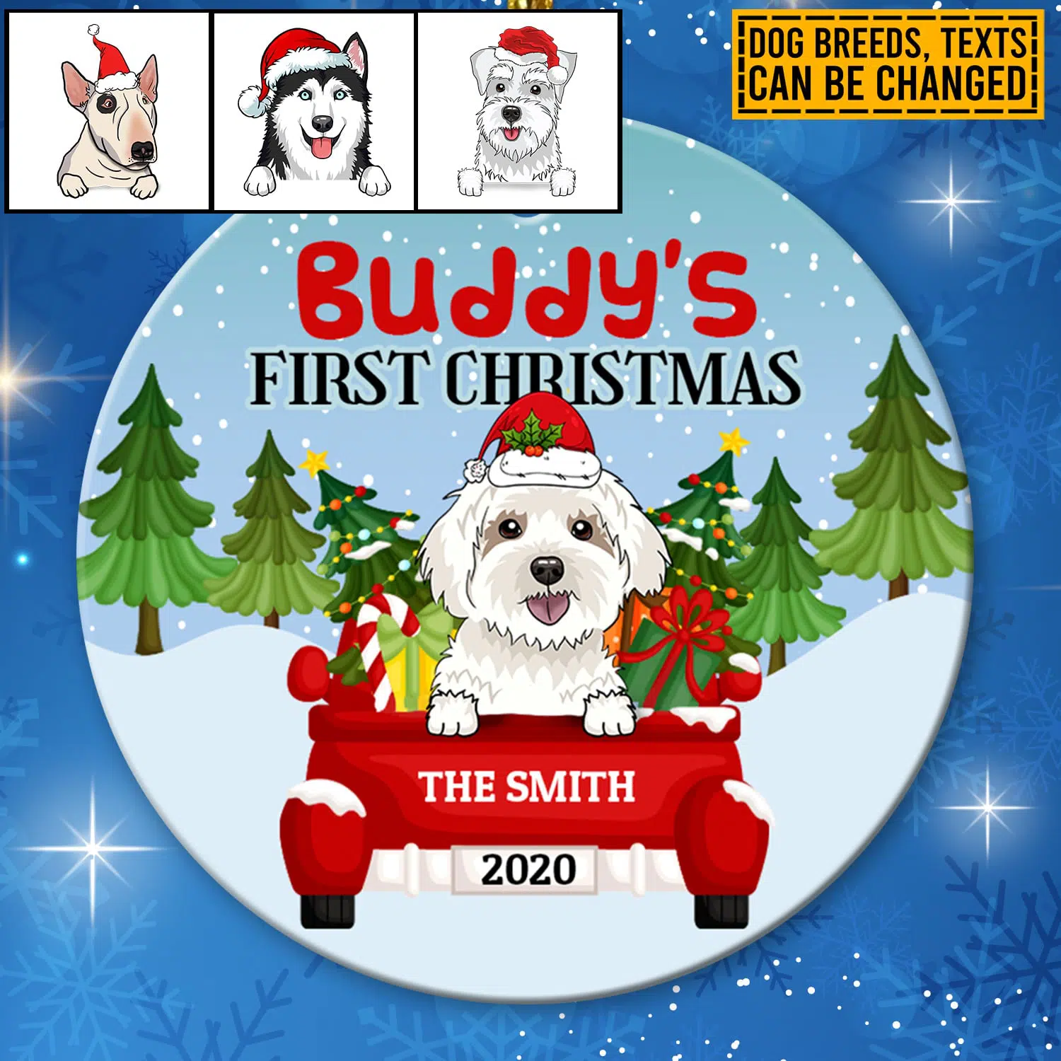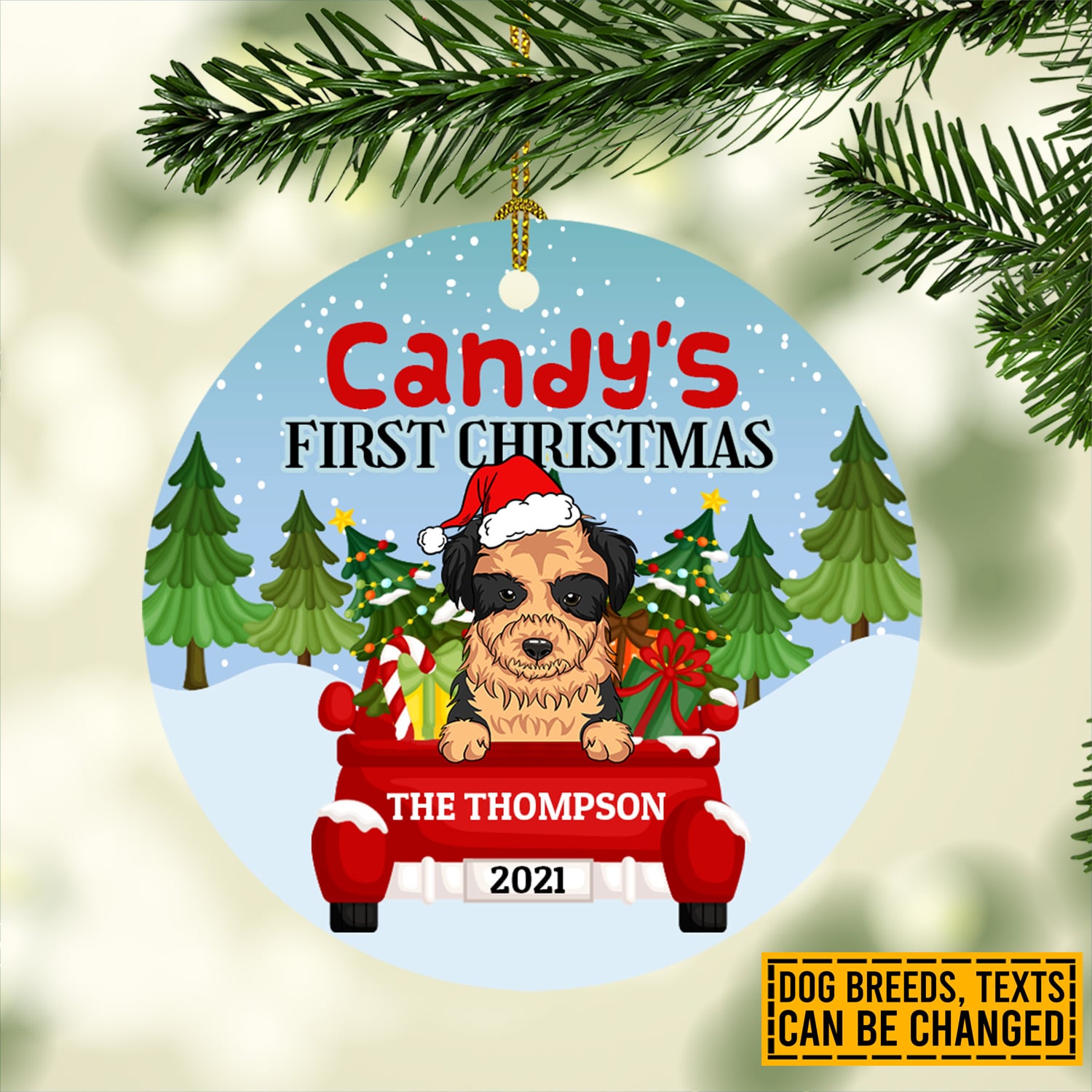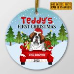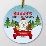 Let’s Shop Personalized Dog’s First Christmas Red Truck Circle Christmas Ornament Keepsake – Custom Dog Breeds Ornament!