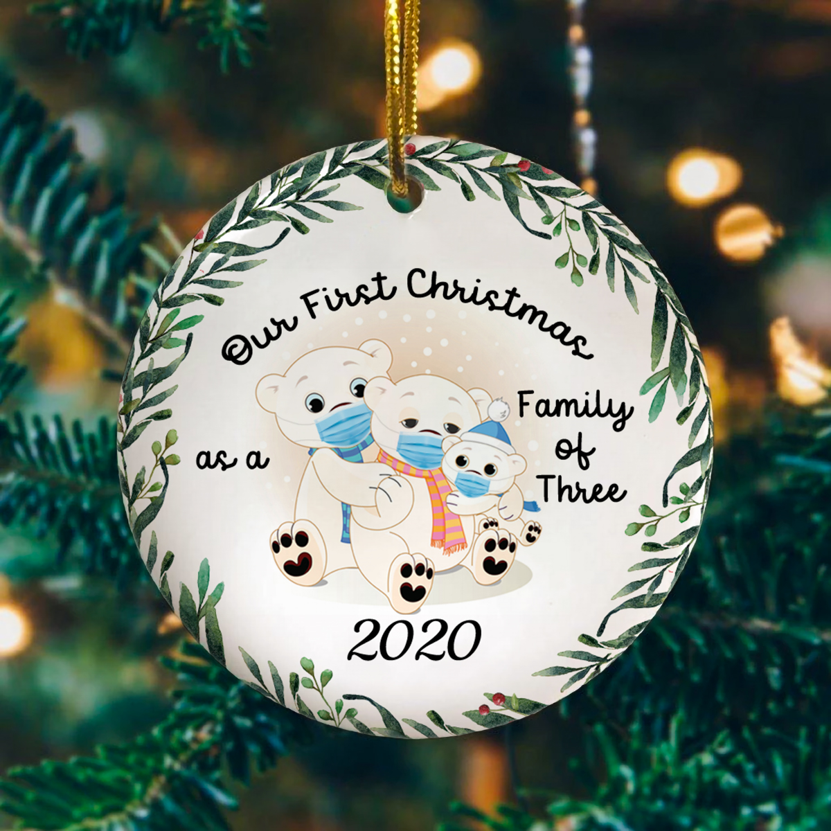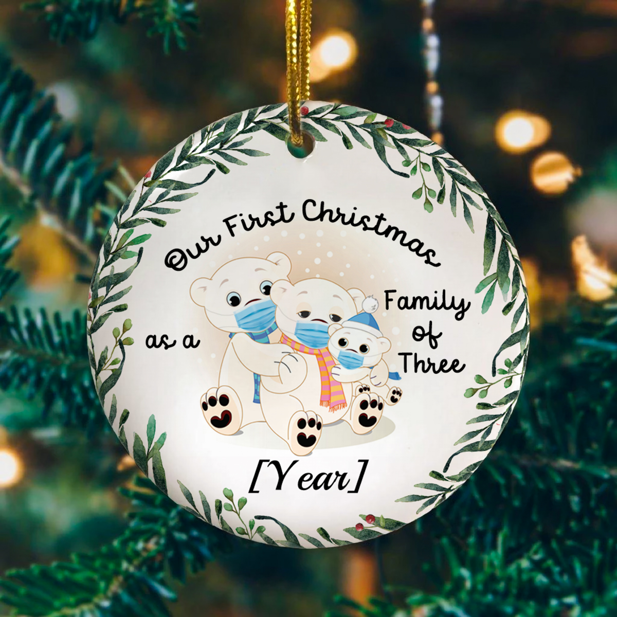 Let’s Shop Personalized Family Of Three Polar Bears With Mask Decorative Christmas Ornament-Holiday Flat Circle Ornament!