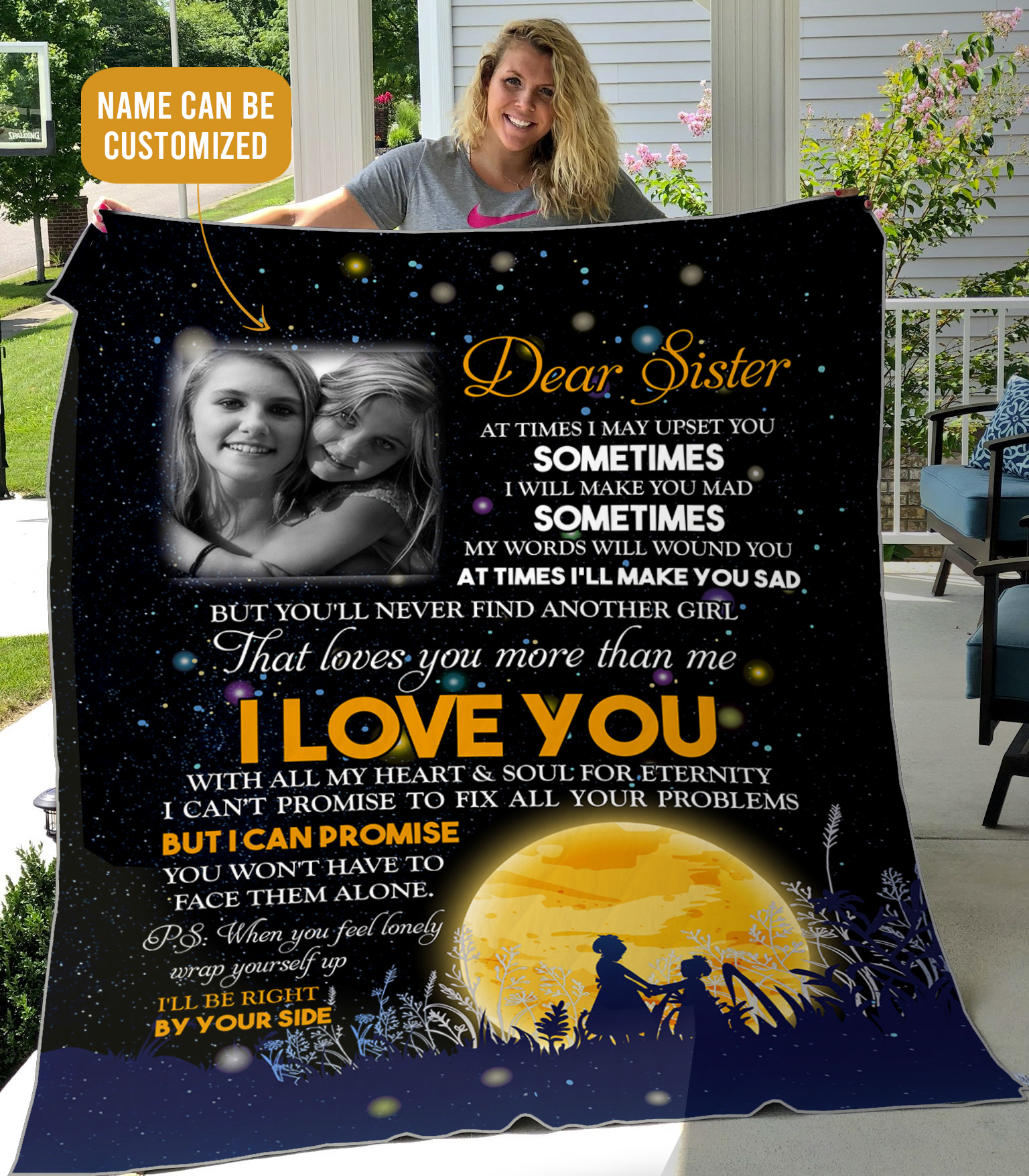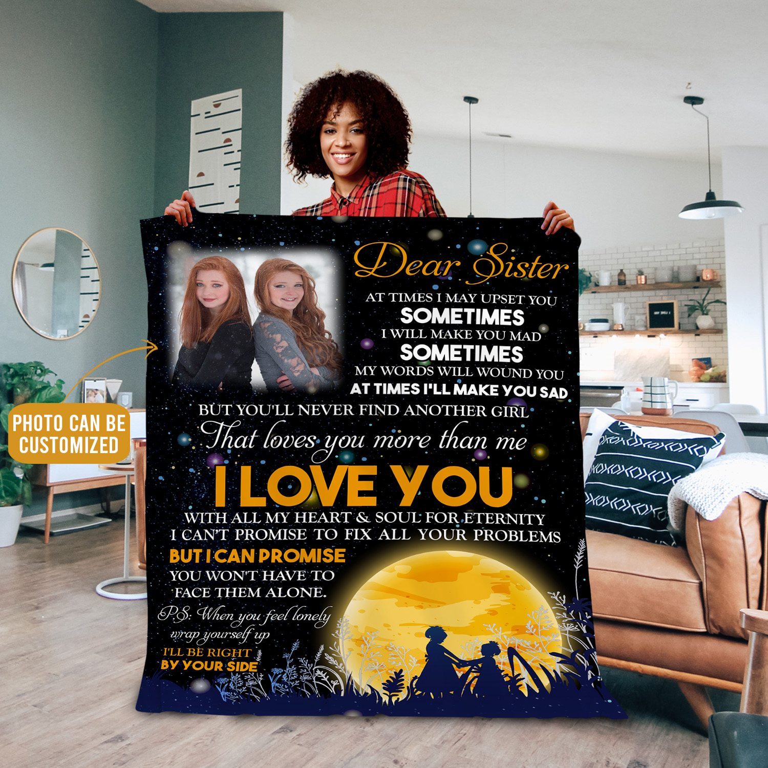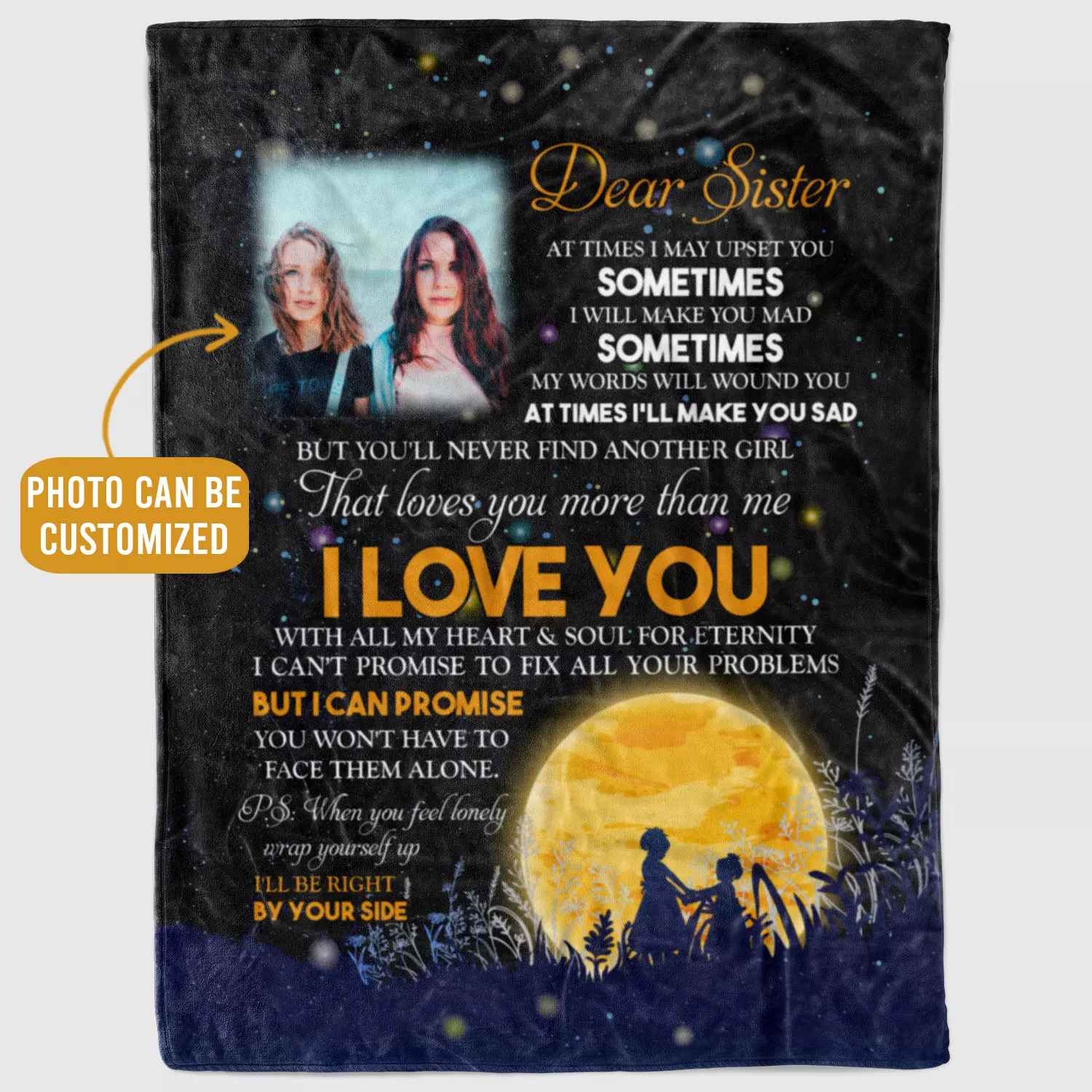 Are you spending too much time to find creative merchandise for you or suitable & special gifts for your mommy, your daddy, your son, your daughter, your children, your friends or someone you love? The struggle is over because we have various I Am Blessed to Have a Sister Like You, Sisters Are a Gift from God, Unusual Gifts for Sisters, Thoughtful Sister Gifts, Sentimental Gifts for Sister, Long Distance Sister Gift, Never Forget That I Love You, Dear Sister at Times I May Upset You Blanket, Dear Sister, I Love You with All My Heart, Sisters Gift, Personalized Gifts for Sister, I Love You to the Moon and Back Blanket, I Love You with All My Heart and Soul, Ill Be Right by Your Side, Customized Gifts for Sister, Wrap Yourself Up which will make perfect presents for your beloveds. In order to make your present stand out, we have created lots of unique and awesome customized photo gifts & personalized designs.