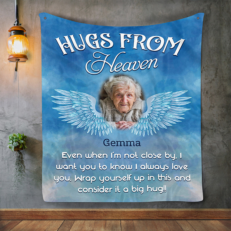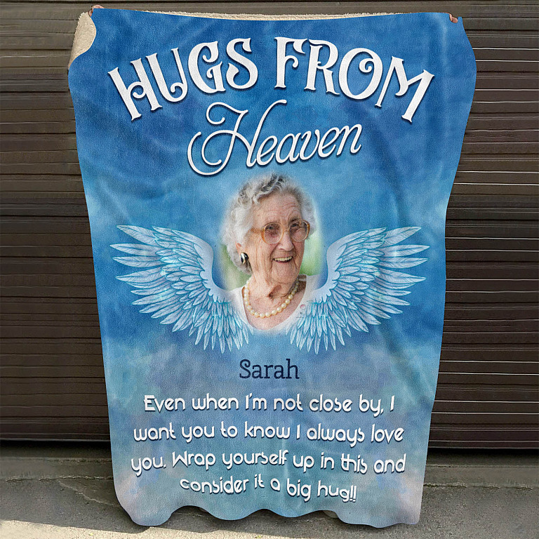 Let’s Shop Custom Photo Hugs from Heaven Memorial Gift Fleece Blanket – Premium Sherpa Blanket – Woven Blanket!