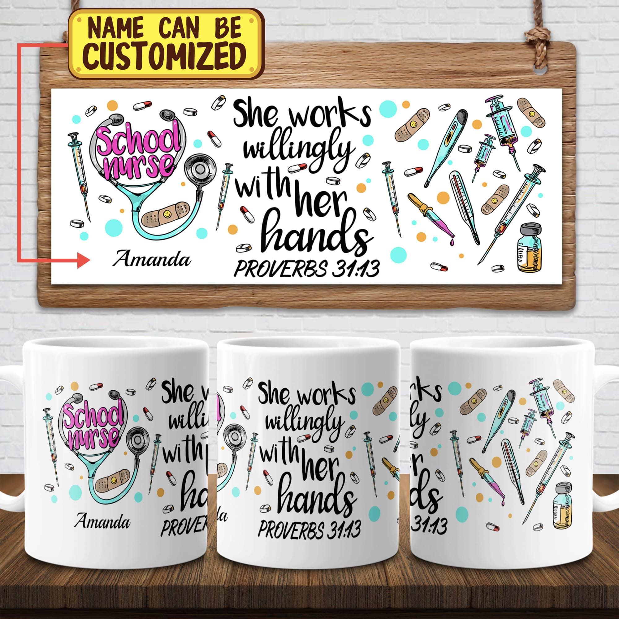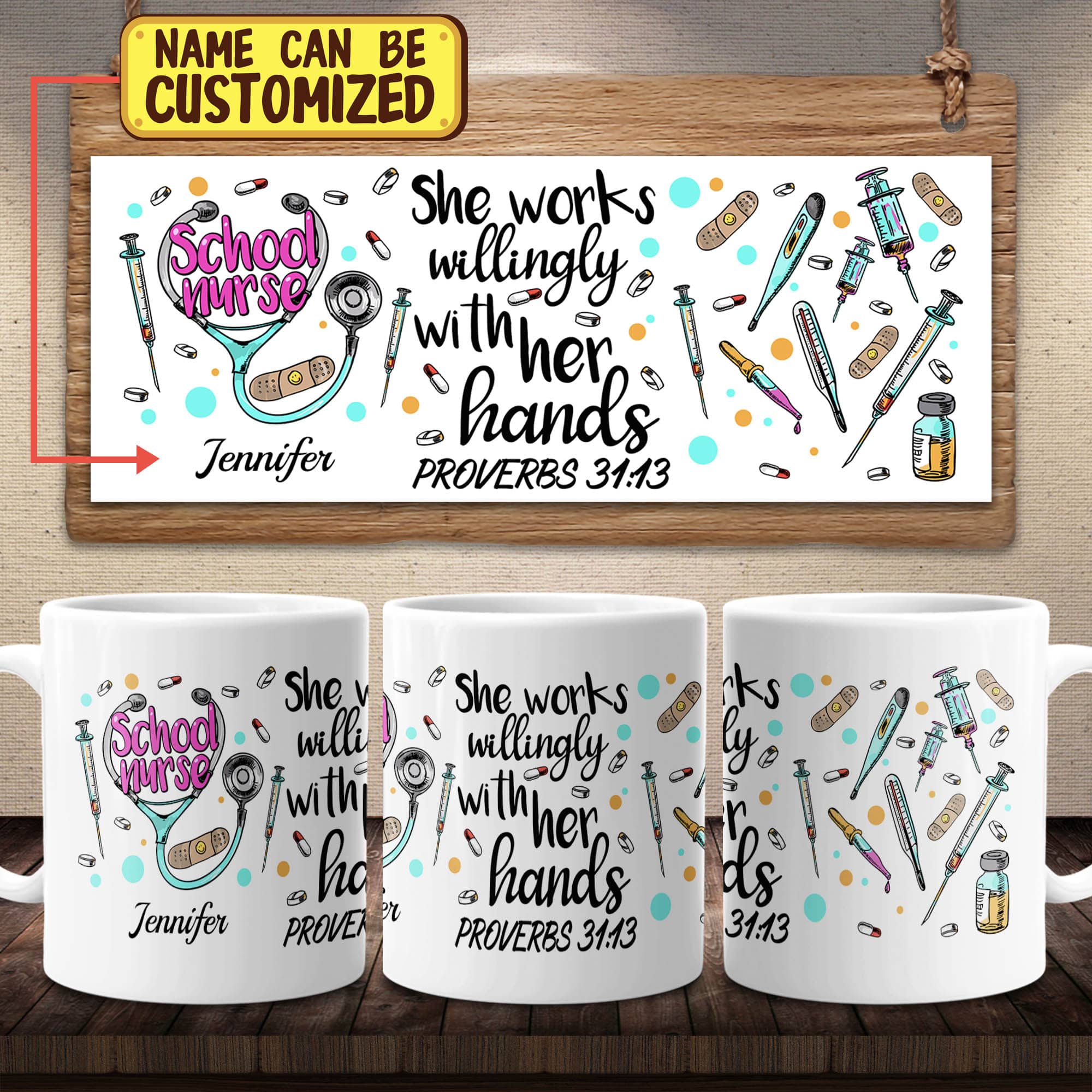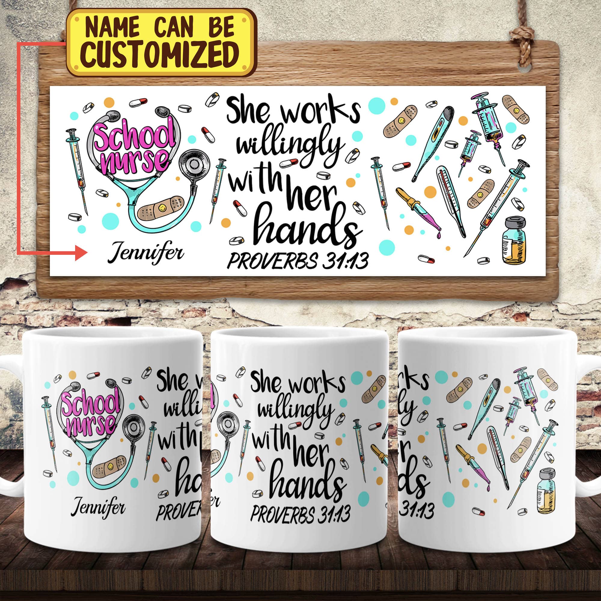 Let’s Shop Personalized School Nurse She Works Willingly with Her Hands Ceramic Coffee Mug – Color Changing Mug!