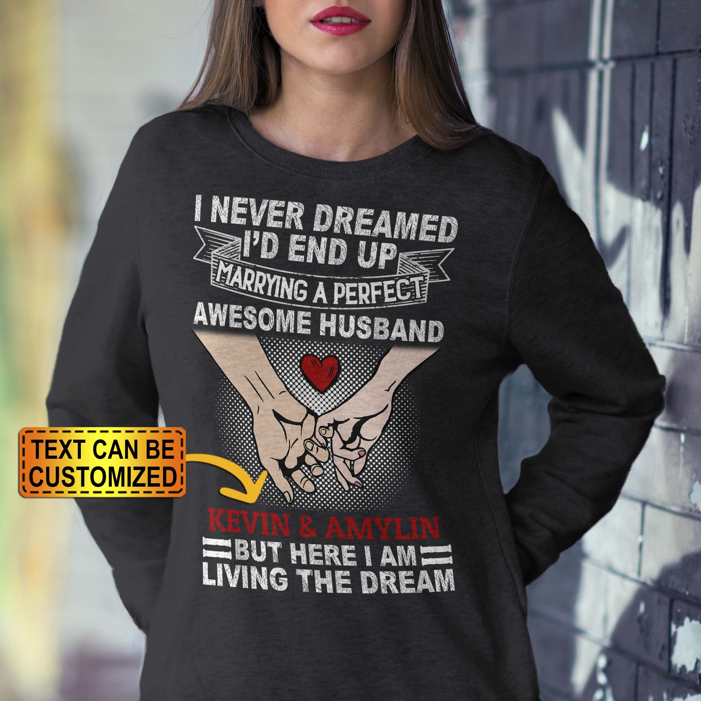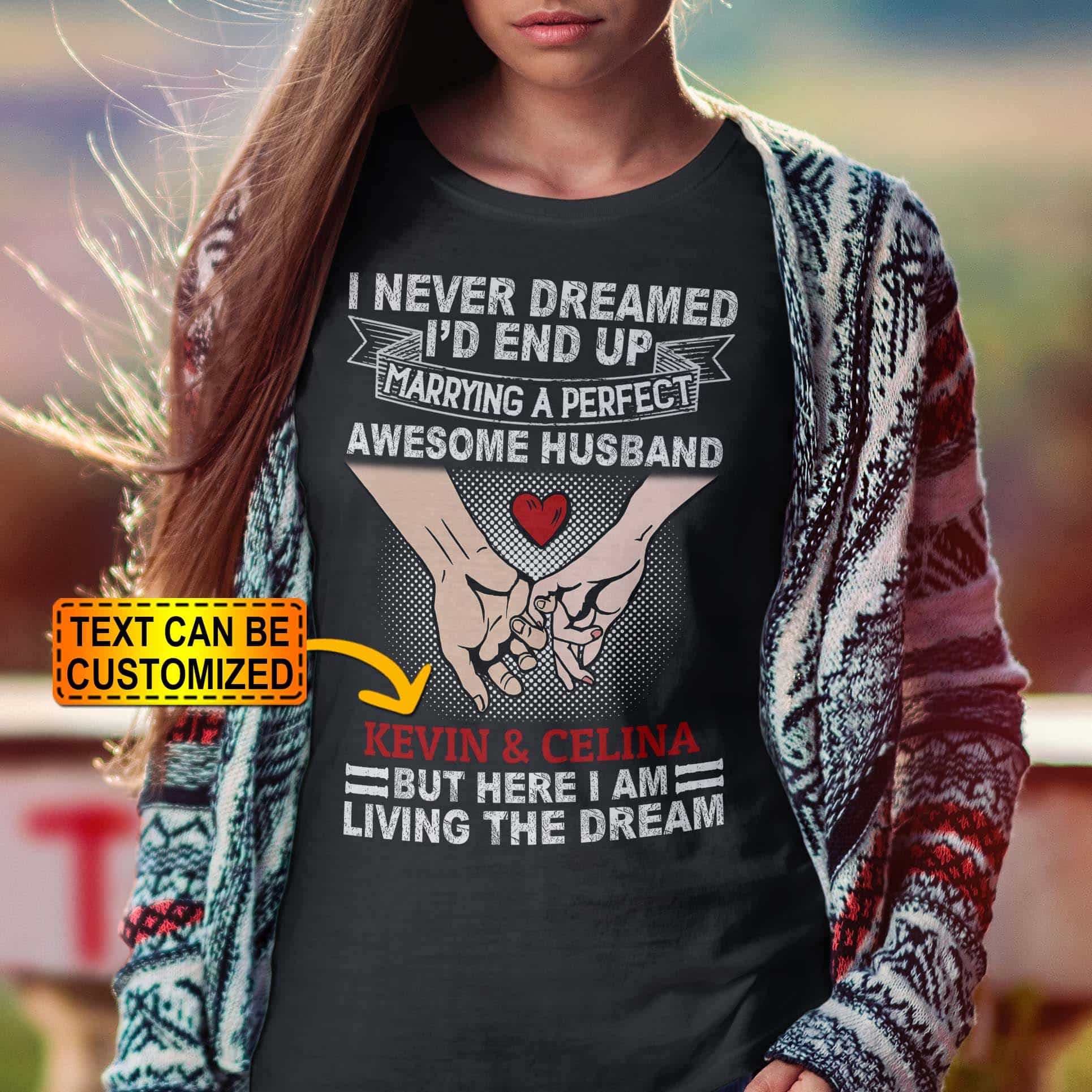 Are you spending too much time to find creative merchandise for you or suitable & special gifts for your mommy, your daddy, your son, your daughter, your children, your friends or someone you love? The struggle is over because we have various I Never Dreamed I’d End Up Marrying A Perfect Awesome Husband But Here I Am Living The Dream Shirt, Funny Gift For Wife, Wife Gift From Husband, Custom Shirt For Wife, Personalized Gift For Wife, Personalized Birthday Gift For Wife, Custom Name Shirt For Wife which will make perfect presents for your beloveds. In order to make your present stand out, we have created lots of unique and awesome customized photo gifts & personalized designs.