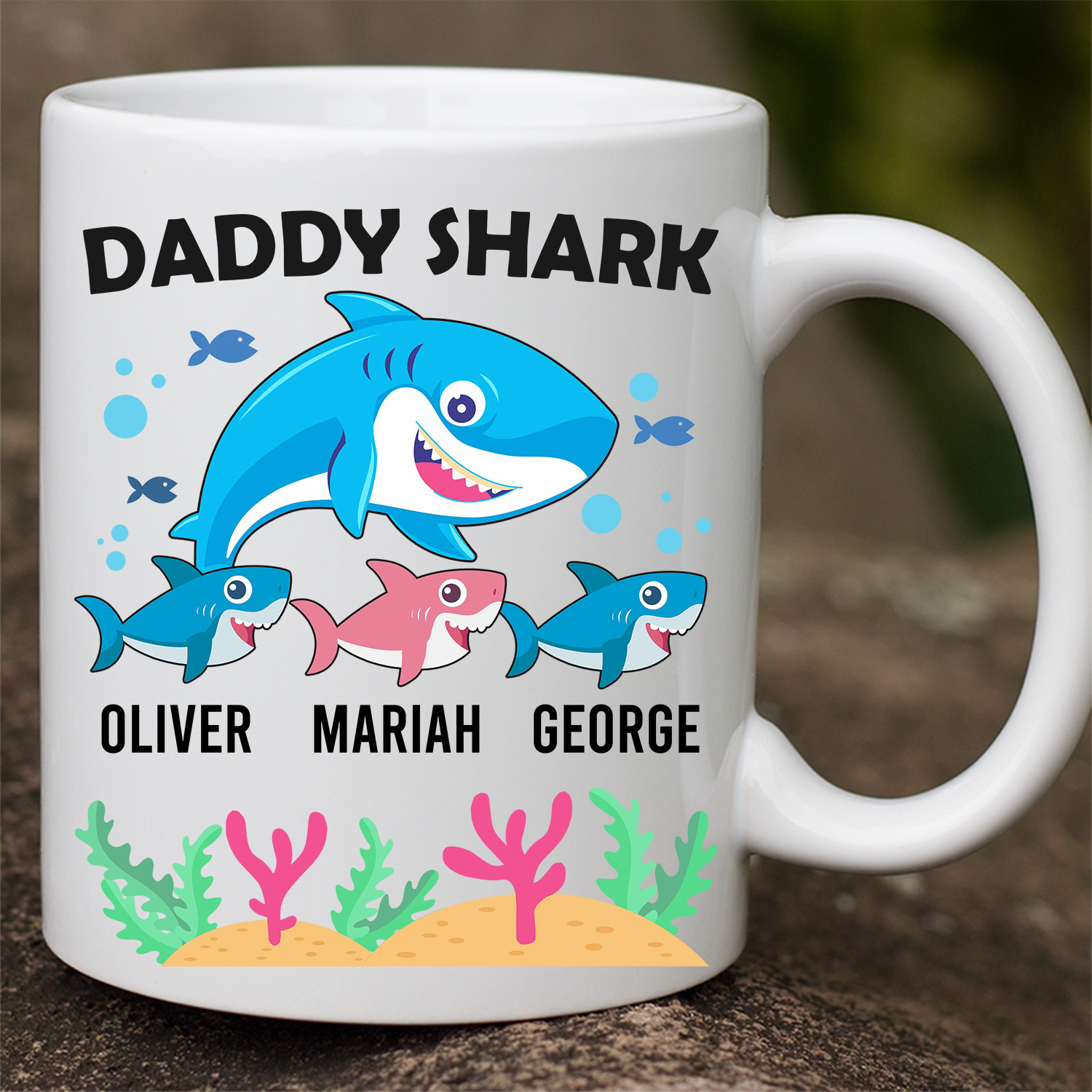 Shop Personalized Daddy Shark With 3 Kids Ceramic Coffee Mug – Beer Stein – Water Bottle – Dad Shark Gifts.