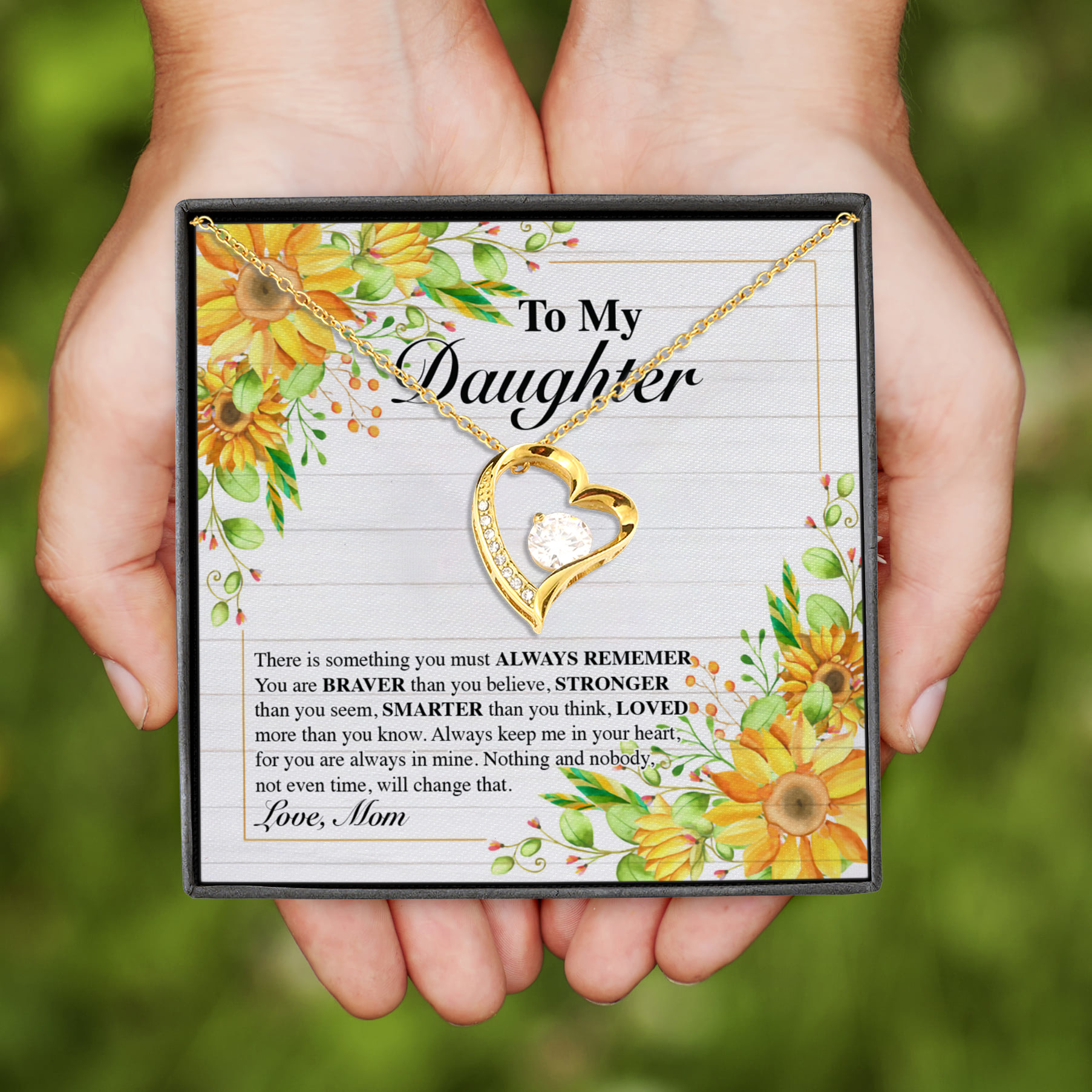 Are you spending too much time to find creative merchandise for you or suitable & special gifts for your mommy, your daddy, your son, your daughter, your children, your friends or someone you love? The struggle is over because we have various Daughter Graduation Gifts, Daughter Gift from Dad, Mom Gift To Daughter, Birthday Gift To Daughter from Mom, Gift from Mom To Daughter on Her Wedding Day, Necklace for Daughter from Mom, To My Daughter Heart Necklace from Mom, To My Daughter From Mom Forever Love Pendant Heart Necklace, Daughter Sunflower Heart Necklace, You Are Braver than You Believe Heart Necklace which will make perfect presents for your beloveds. In order to make your present stand out, we have created lots of unique and awesome customized photo gifts & personalized designs.