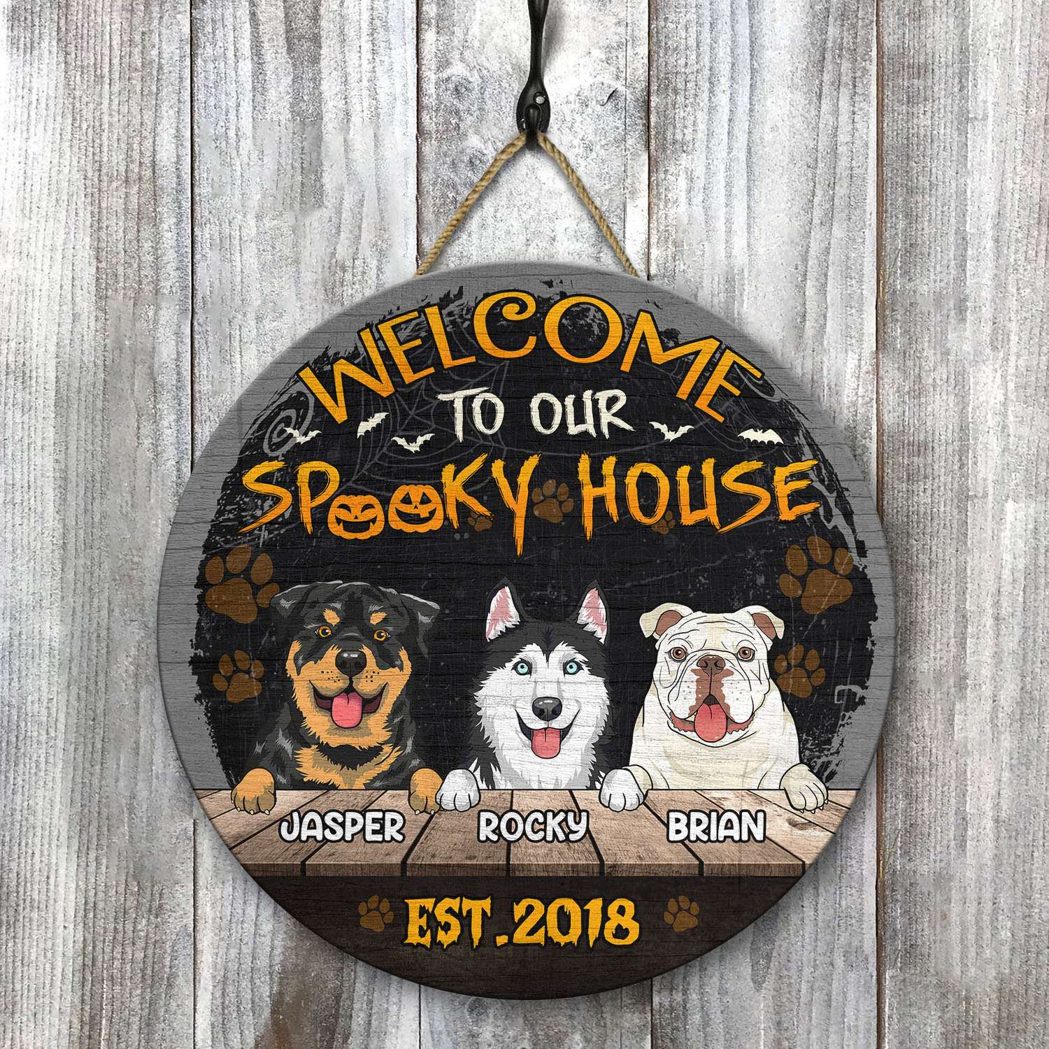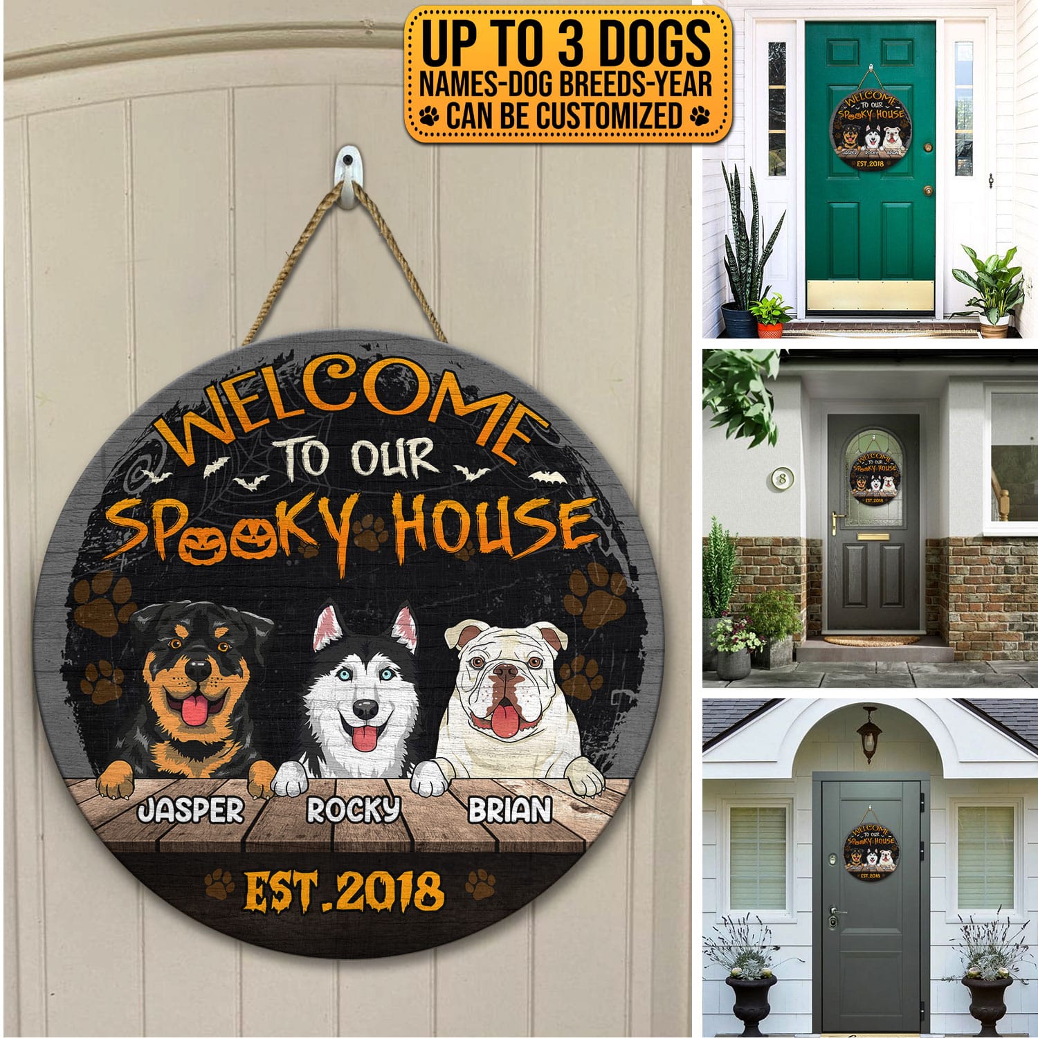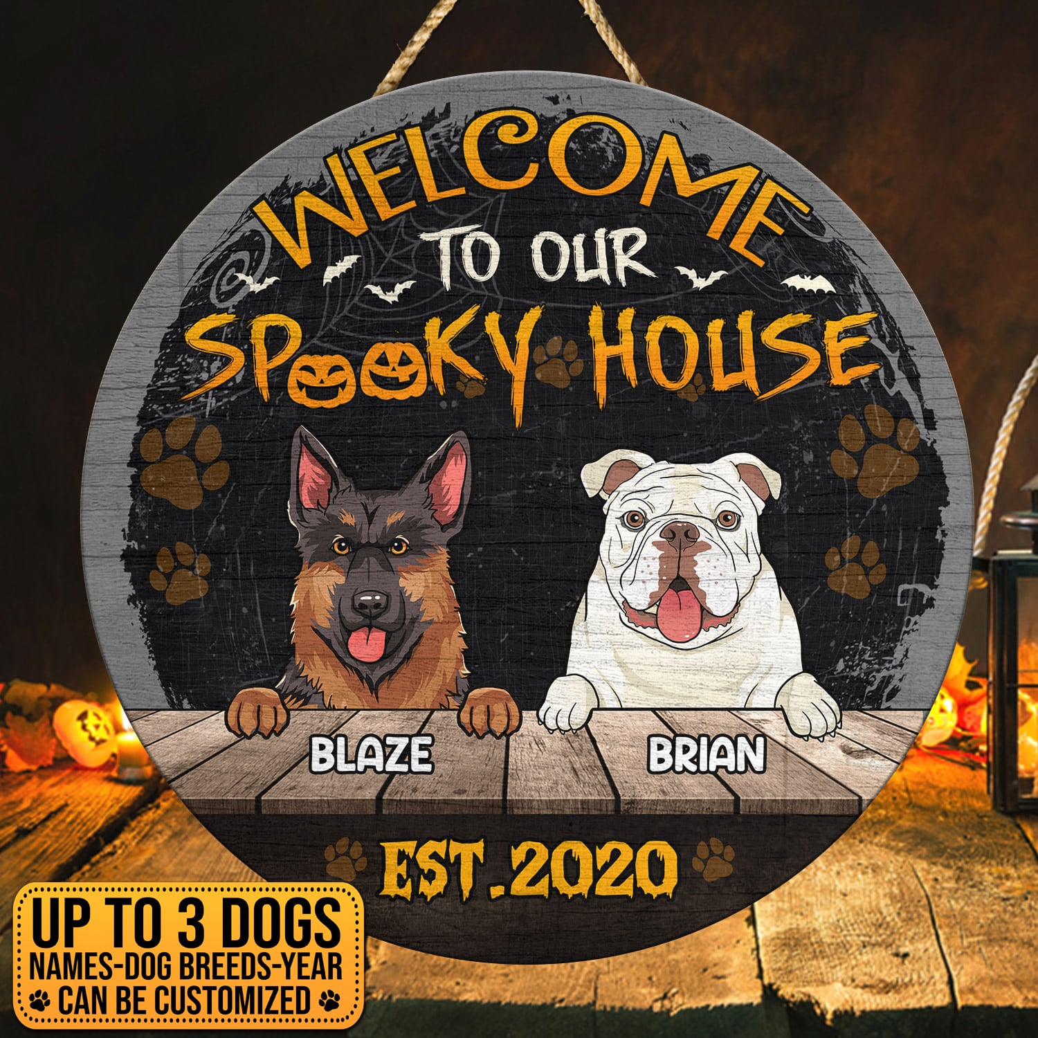 Let’s Shop Personalized Dog Breeds Welcome To Our Spooky House Funny Halloween Wooden Door Sign – Front Porch Sign Indoor!