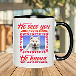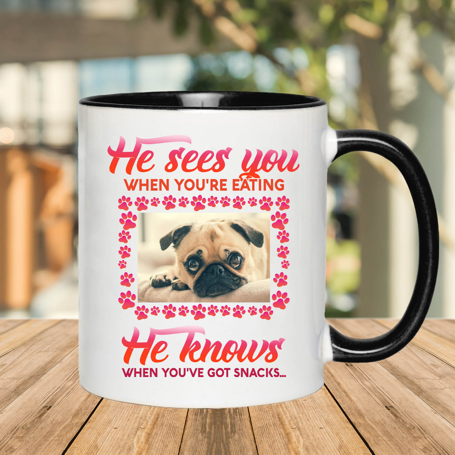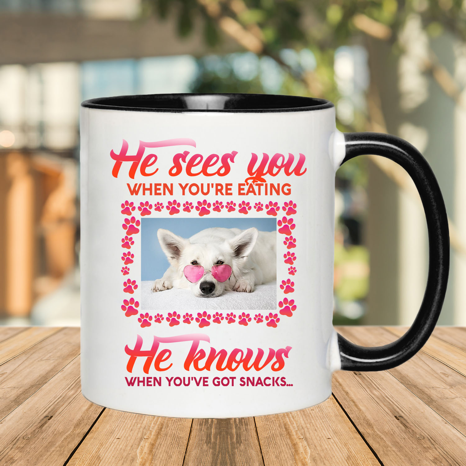Let’s Shop Personalized Photo Dog He Sees You when You’re Eating He Knows when You’ve Snacks Accent Mug!