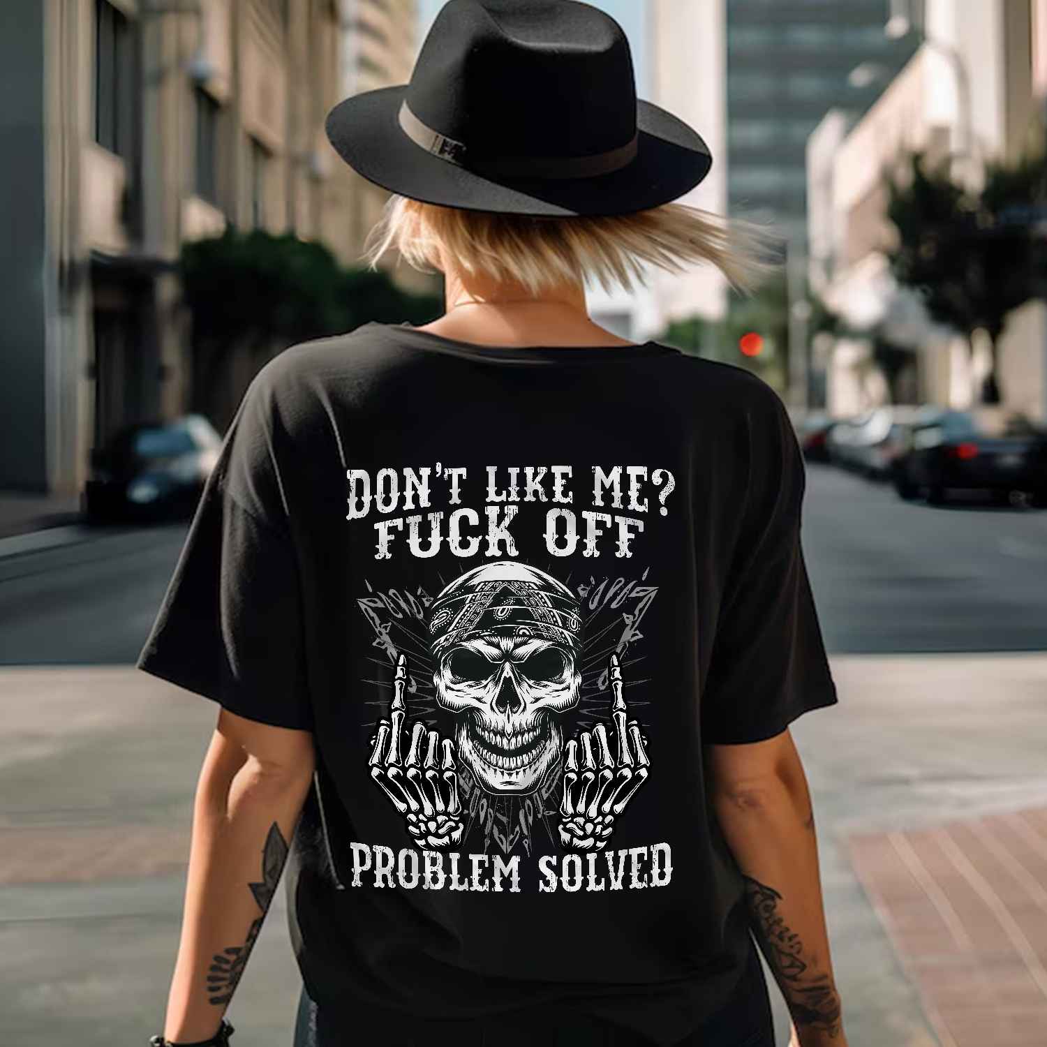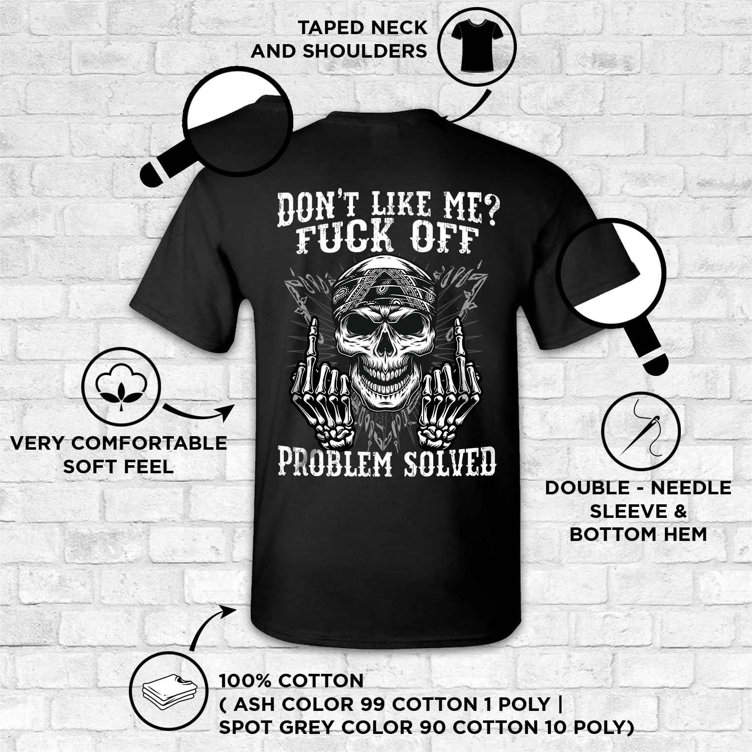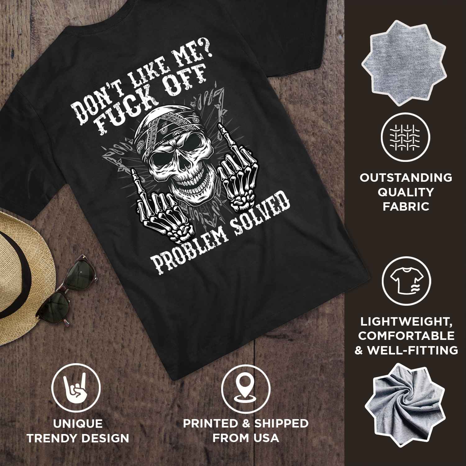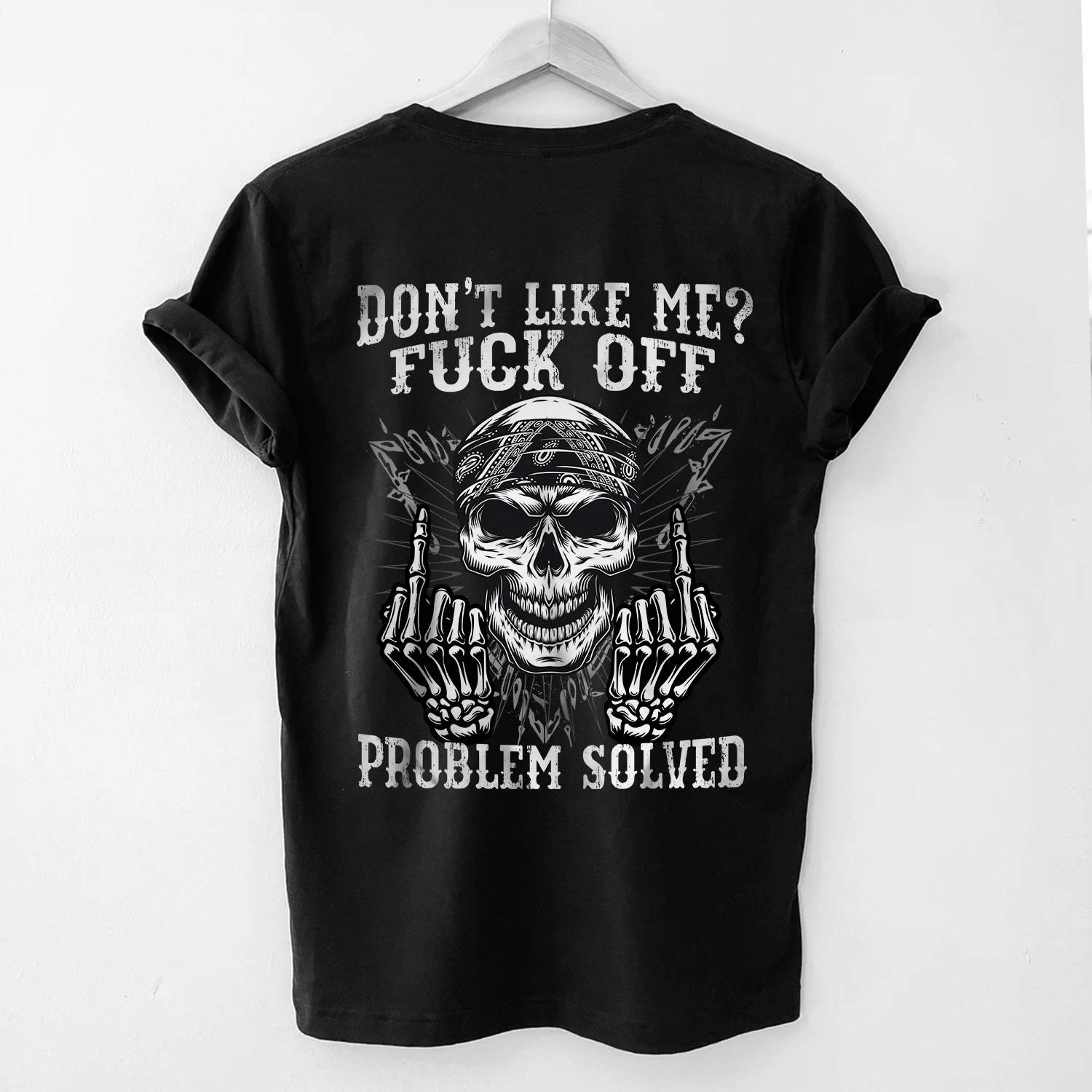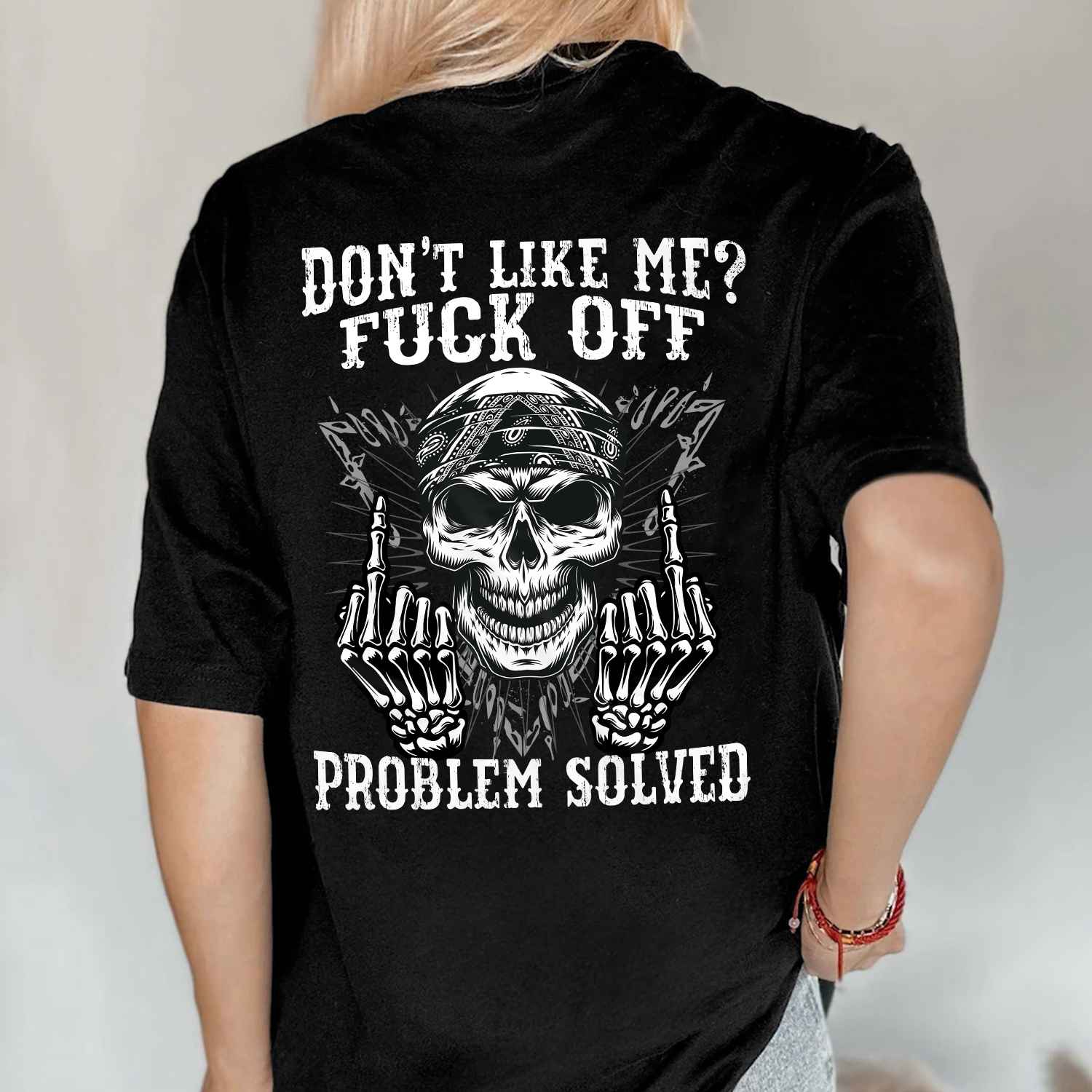 Don't Like Me Fuck Off Problem Solved Funny Skull Printed On Back T-Shirt Only - Plain Front Shirt