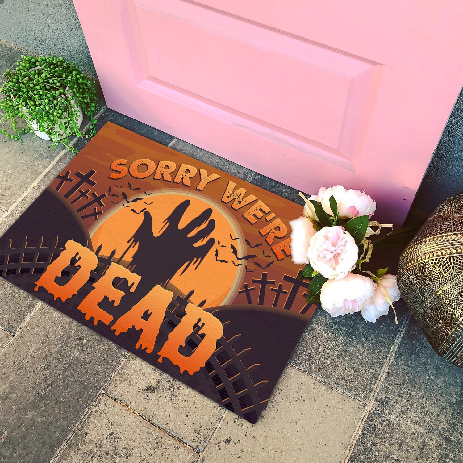 At CubeBik, besides doormats, we also offer tees, hoodies, sweaters, raglans, tanks, wall arts, canvases, posters, mugs, blankets, engraved jewelry, personalized necklaces, printed face masks, throw pillows, flags, tote bags, hats, accessories and more on our website, so do not miss our other Funny Halloween Doormat, Halloween Funny Horror Doormat, Halloween Doormat Funny, Funny Halloween Doormat Outdoor, Sorry We’re Dead Doormat, Funny Zombie Doormat, Zombie Doormat related merchandise. Moreover, all the products are made-to-order and one of a kind custom designs you can’t get elsewhere in normal stores. Let’s discover CubeBik.com now and find your favorite personalized items. We can’t wait to surprise and build beautiful memories with you and your loved ones.