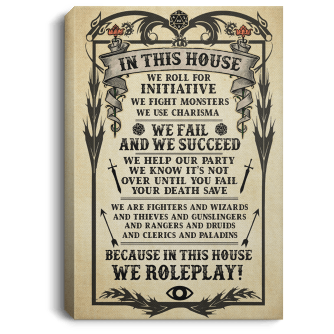 Shop In This House We Roll for Initiative We Fight Monsters We Use Charisma Framed Canvas – Unframed Poster.