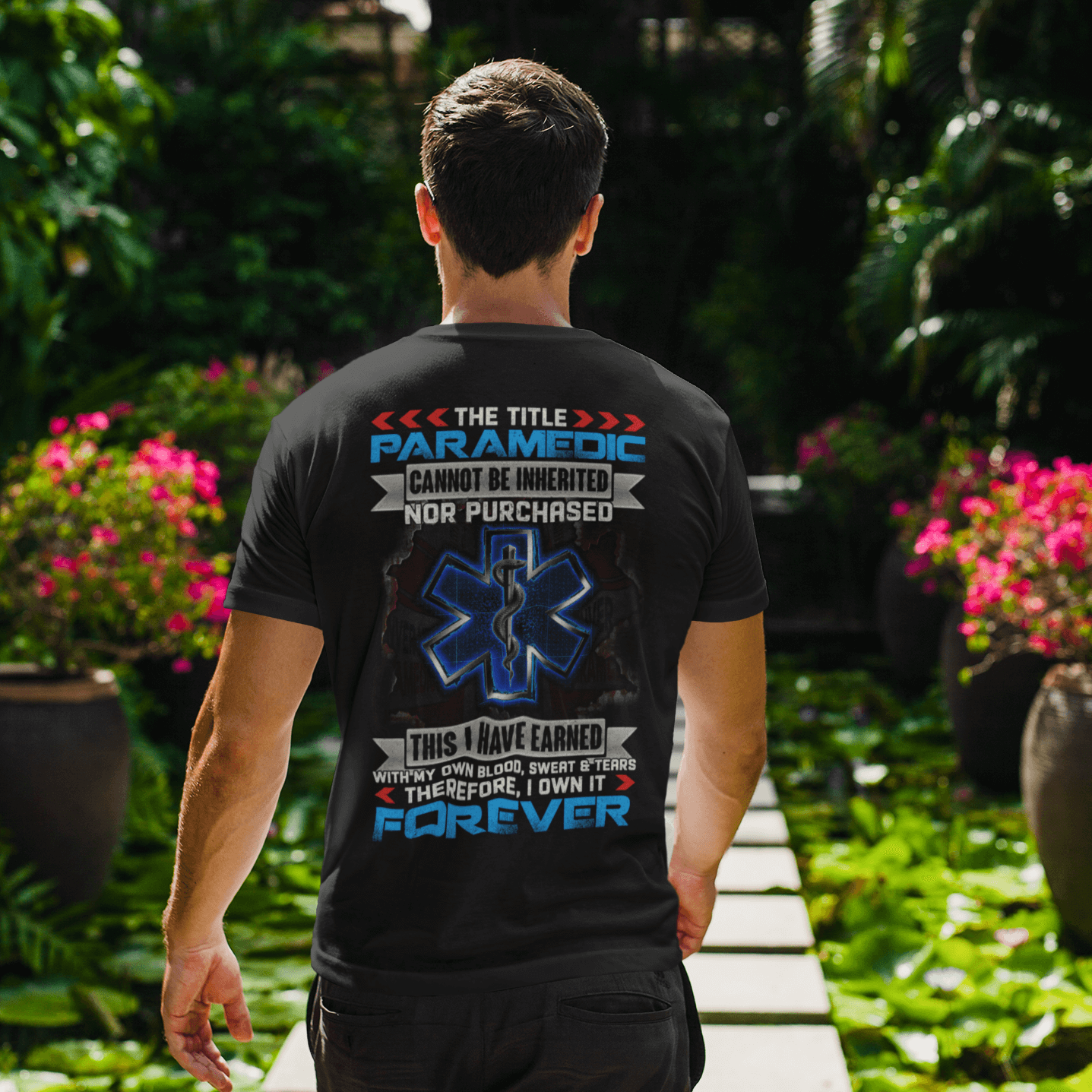 EMS The Title Paramedic Cannot Be Inherited Nor Purchased Blood Sweat And Tear Print On Back Only T-shirt