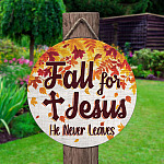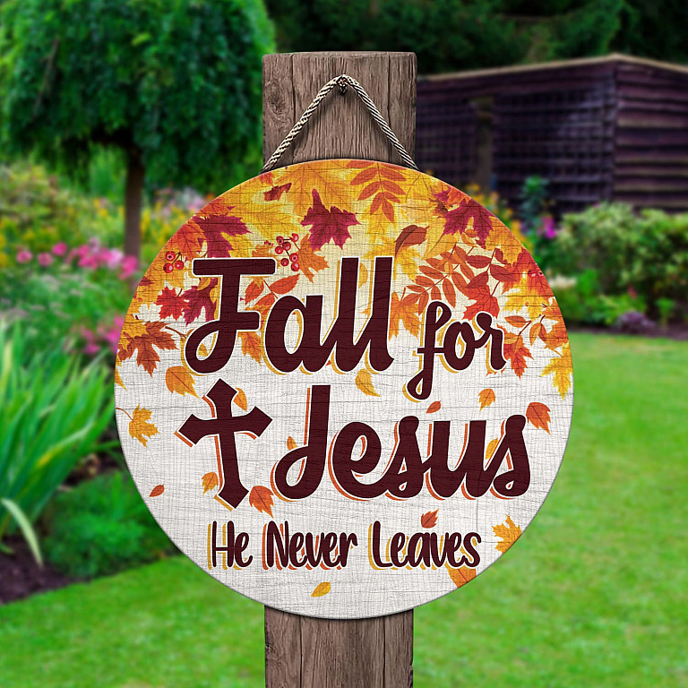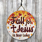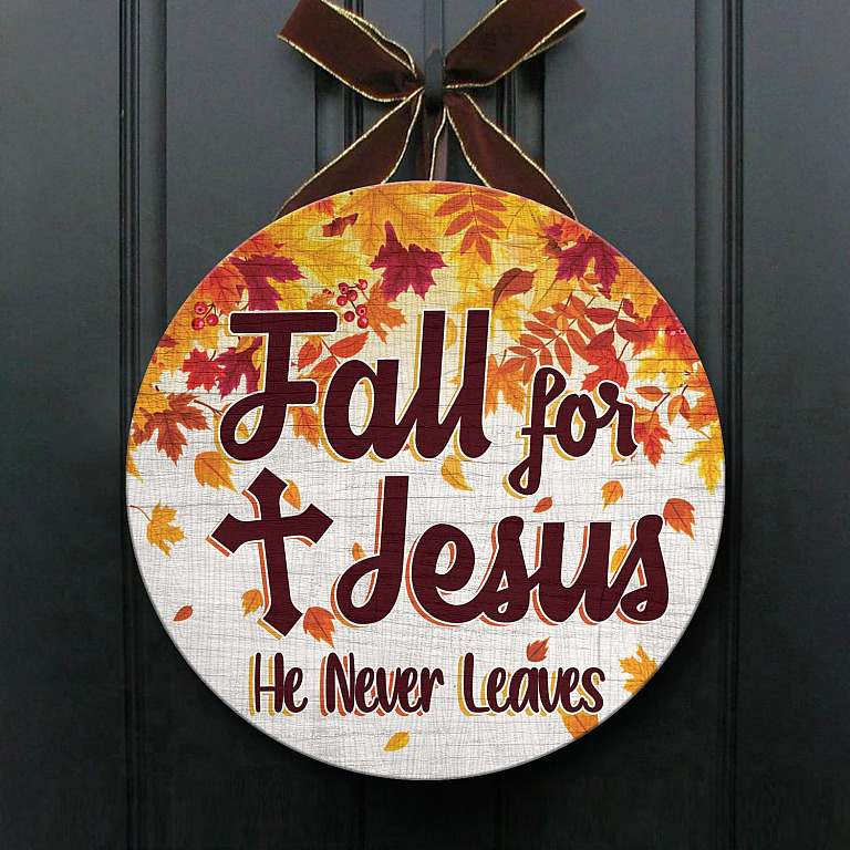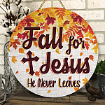 Let’s Shop Fall For Jesus He Never Leaves Decorative Circle Wooden Door Sign – Front Porch Sign!