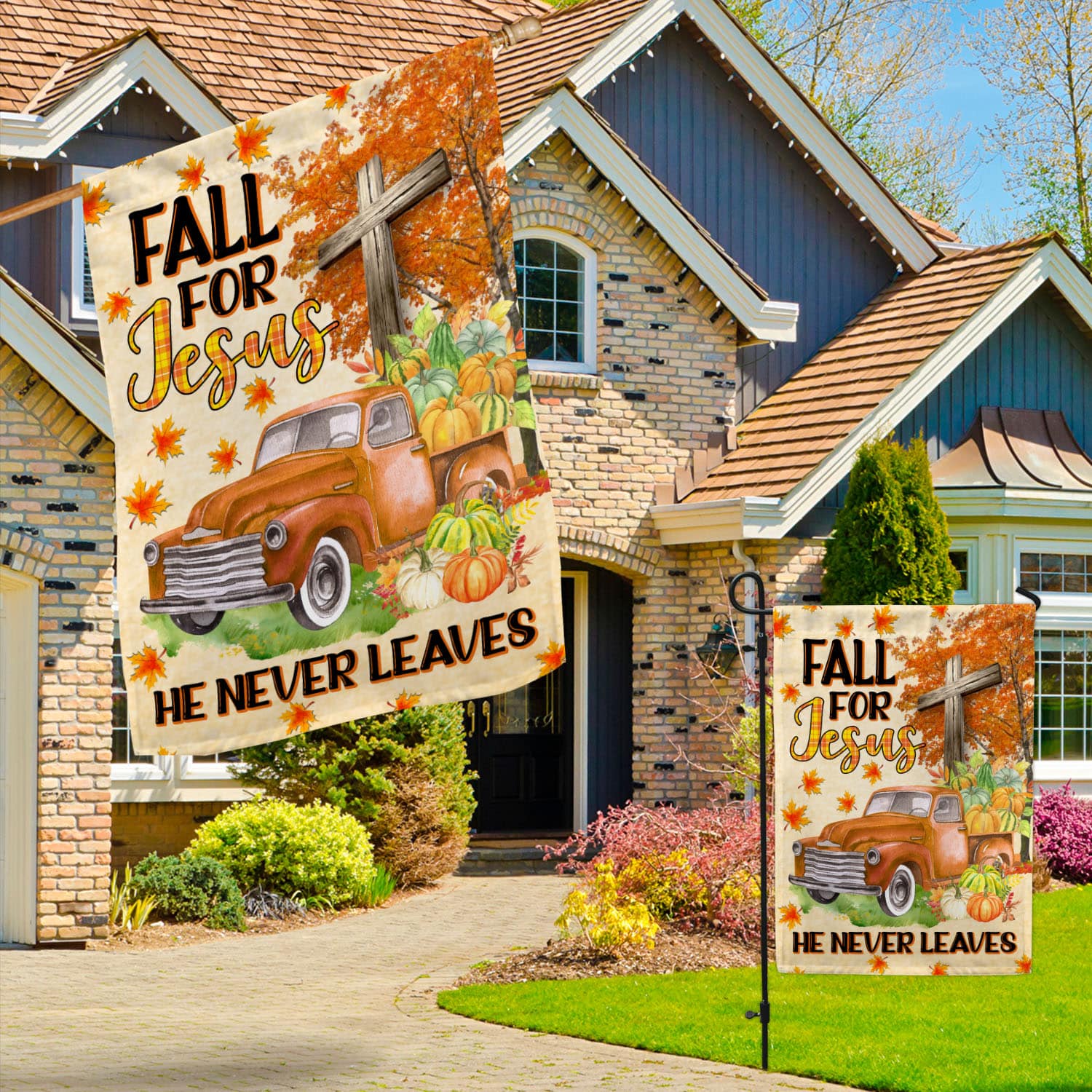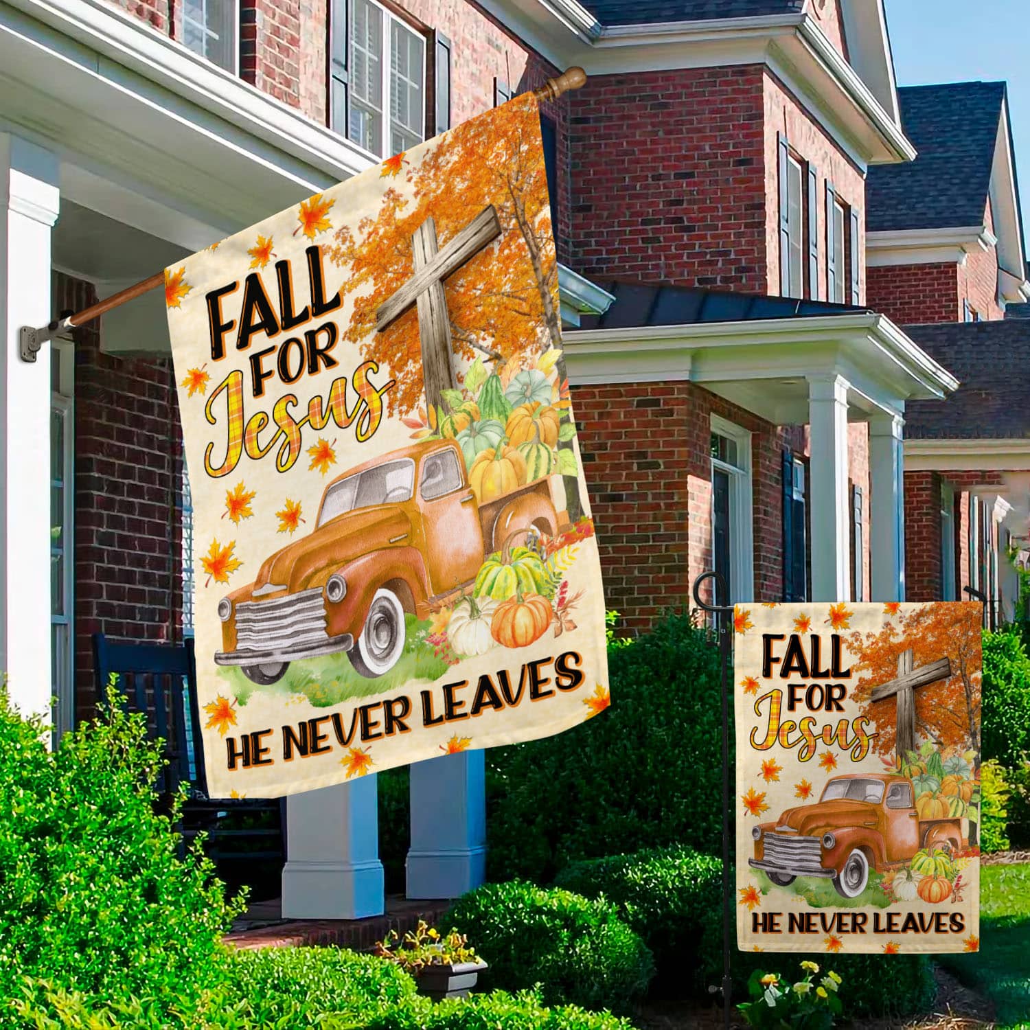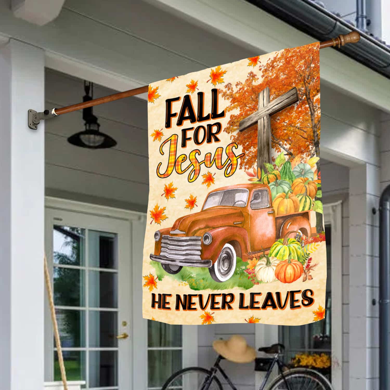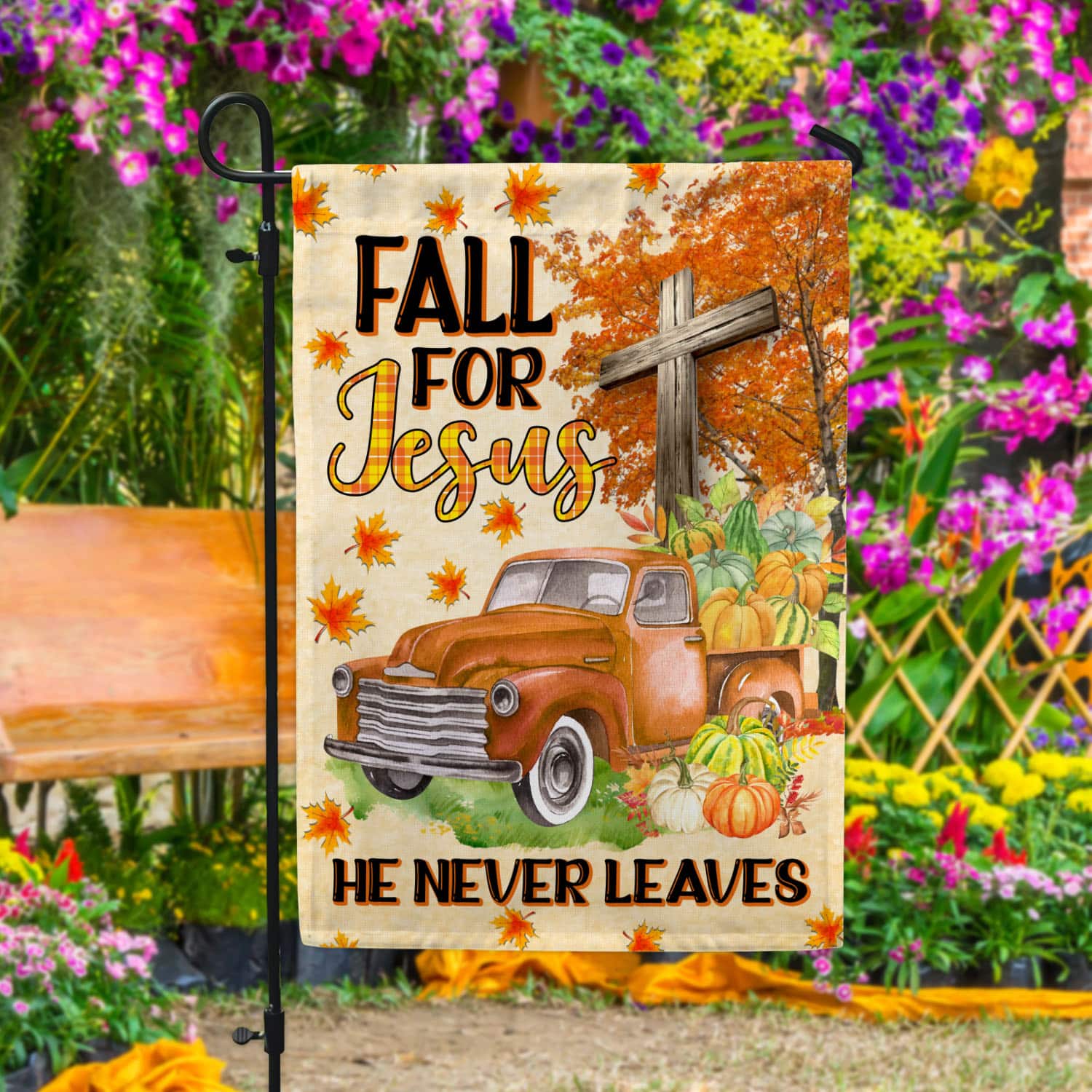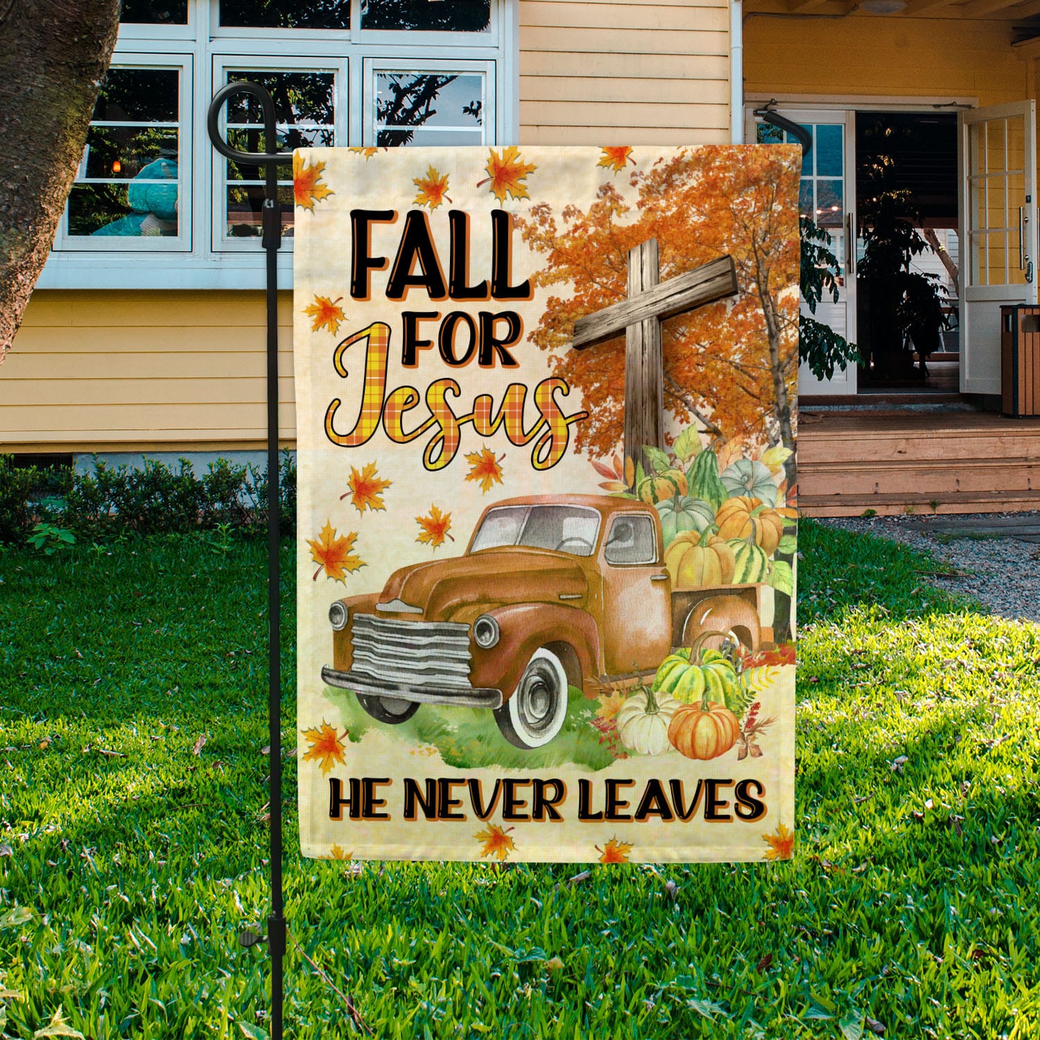 Let’s Shop Fall For Jesus He Never Leaves Garden Flag – Christian Cross Autumn Pumpkin Truck Halloween House Flag!