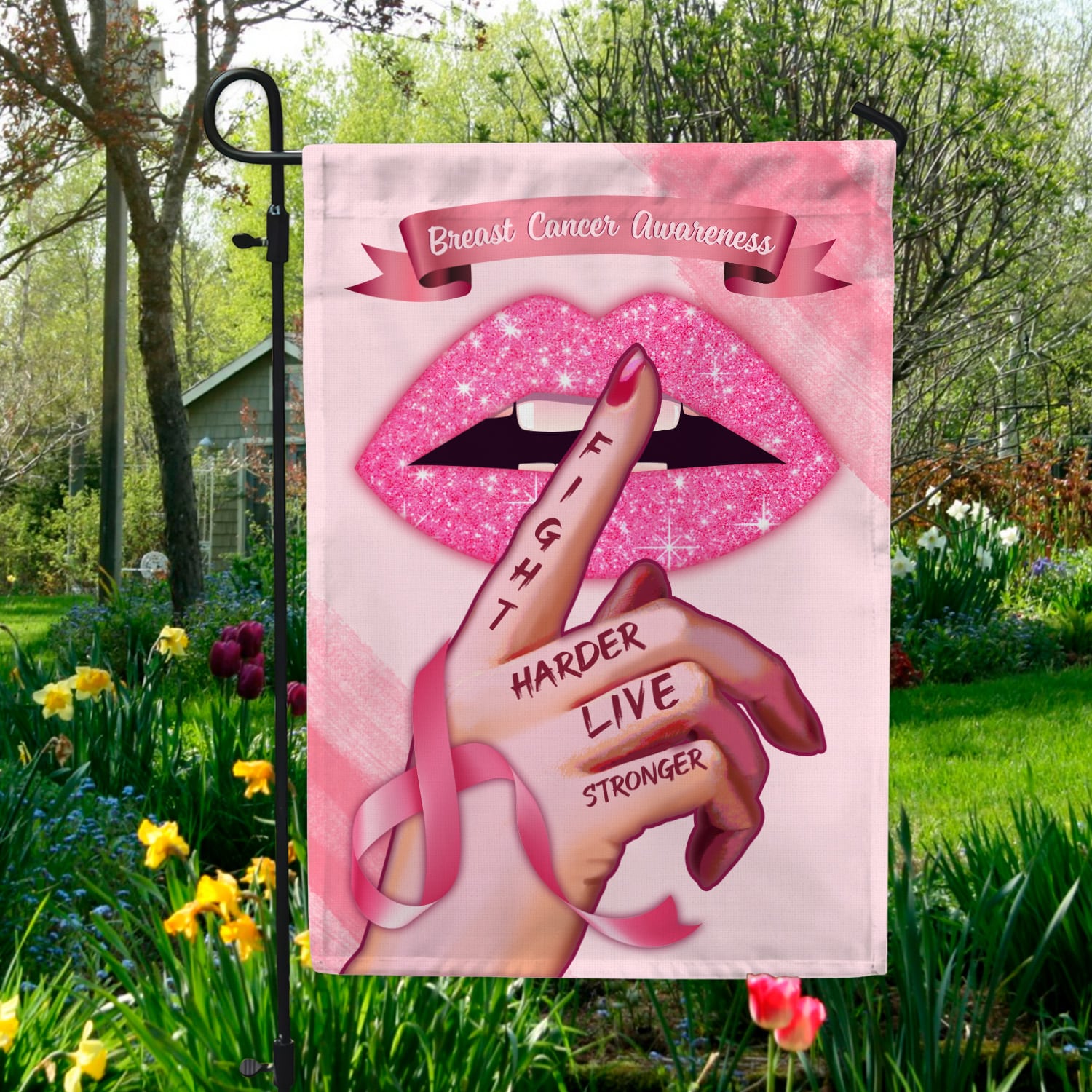 Let’s Shop Fight Harder Live Stronger Breast Cancer Awareness Garden Flag – House Flag – Wall Flag!