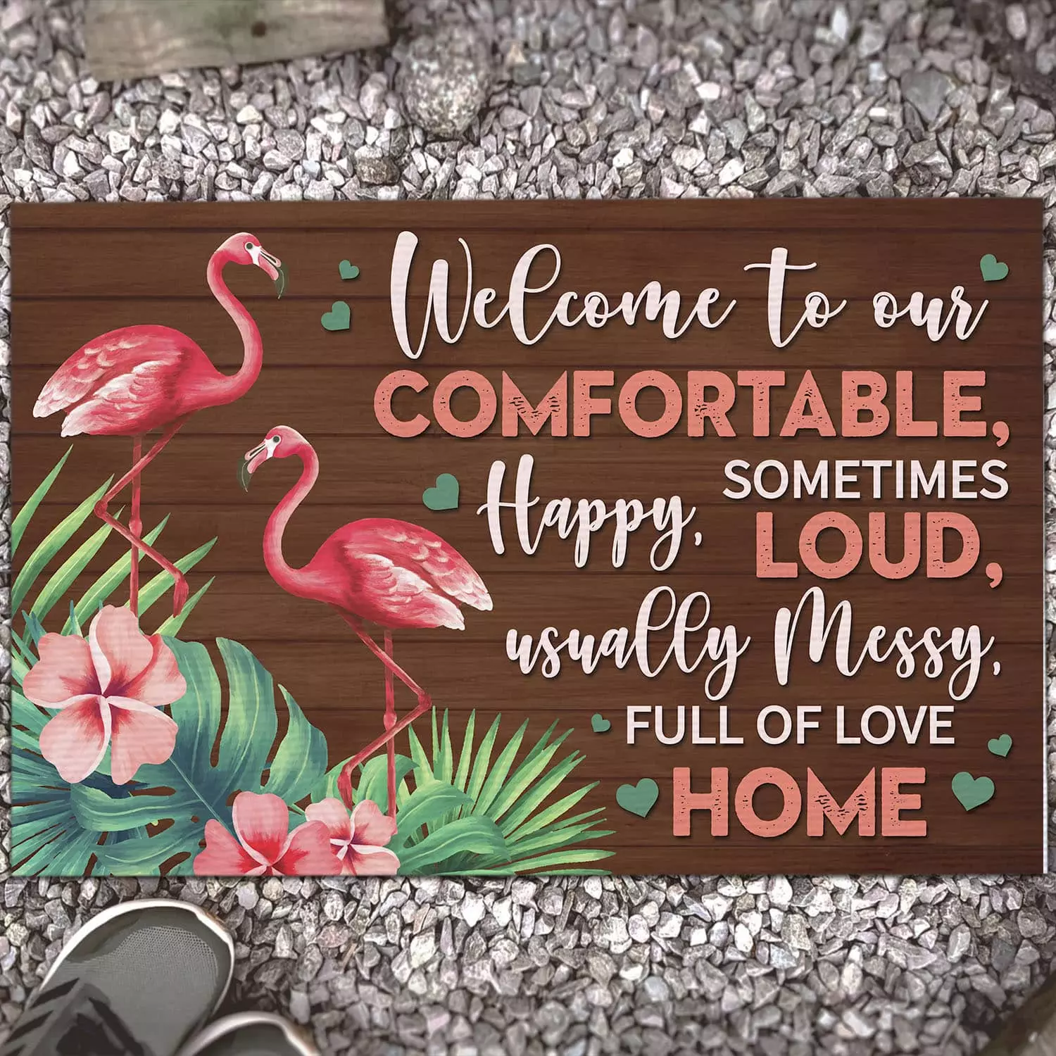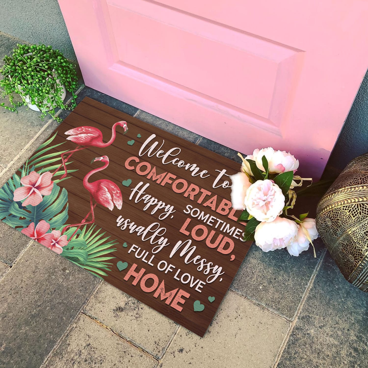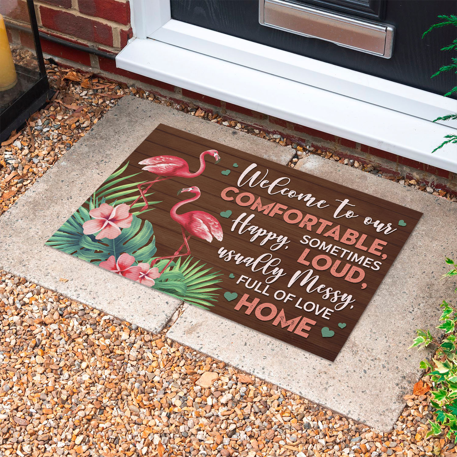 Let’s Shop Flamingos Welcome To Our Comfortable Happy Sometimes Loud Usually Messy Full Of Love House Doormat – Outdoor Doormat!