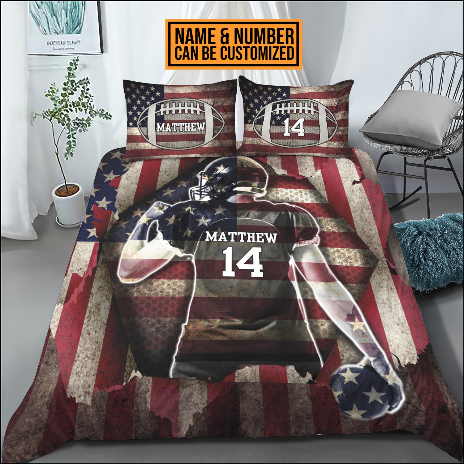 Let’s Shop Personalized Football American Flag Bedding Set – Pillow and Duvet Cover – Football Lover Gifts!