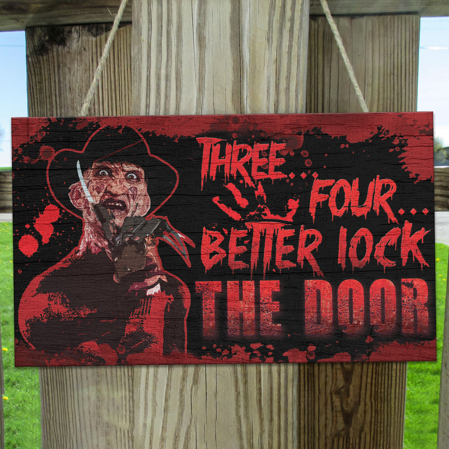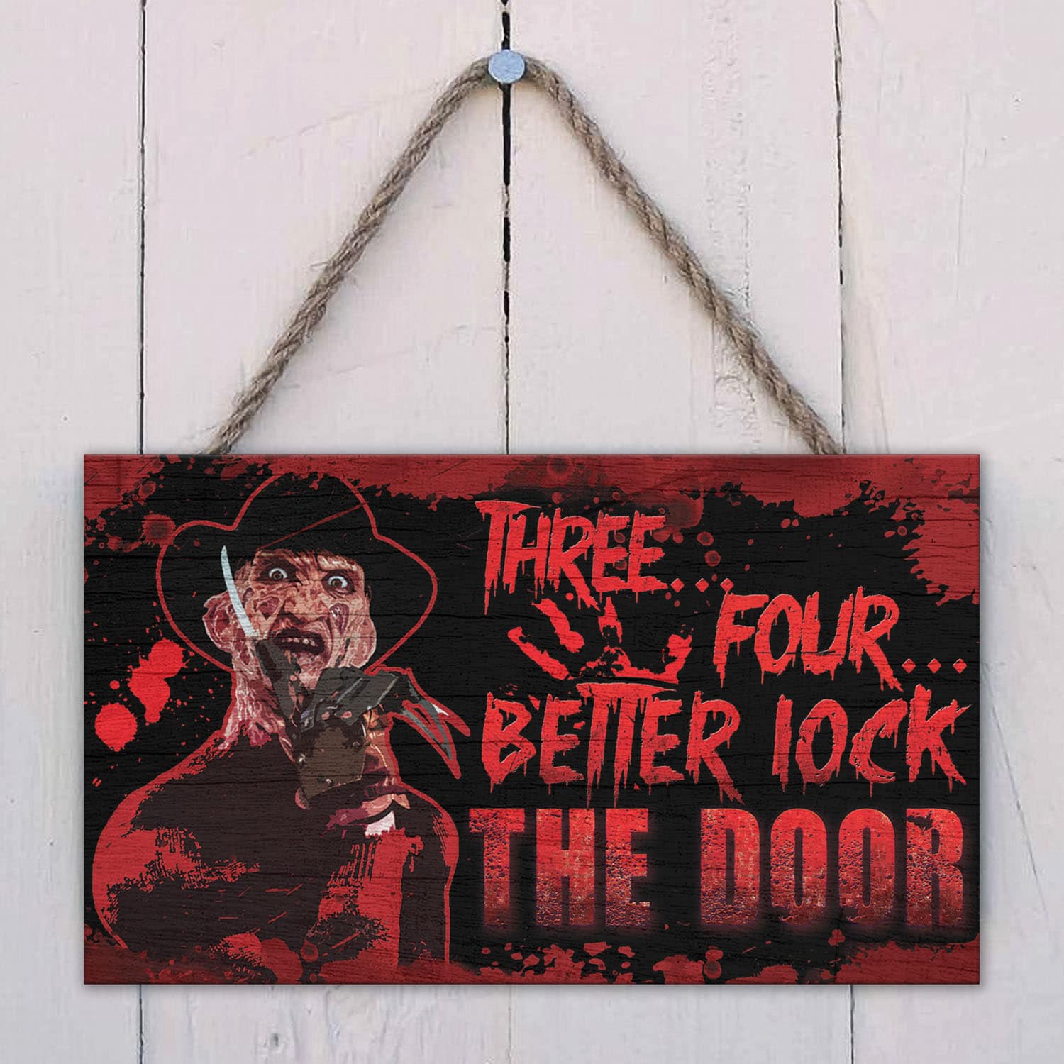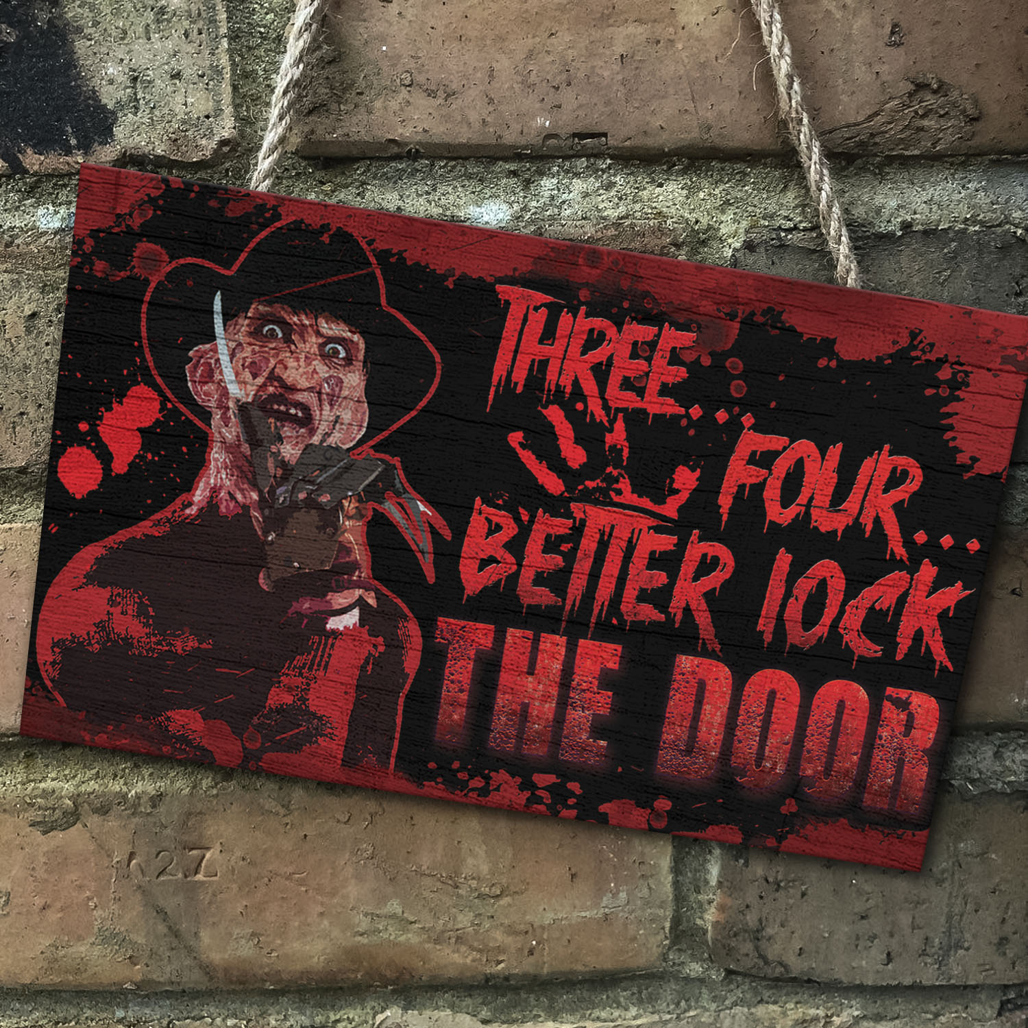 Let’s Shop Three Four Better Lock The Door Halloween Freddy Krueger Wooden Door Sign – Indoor Outdoor Front Porch Sign!